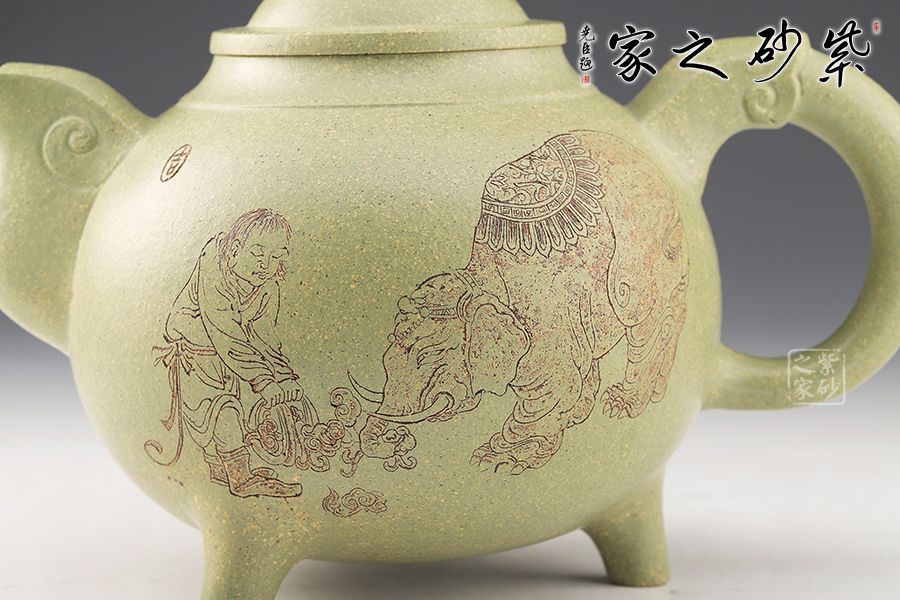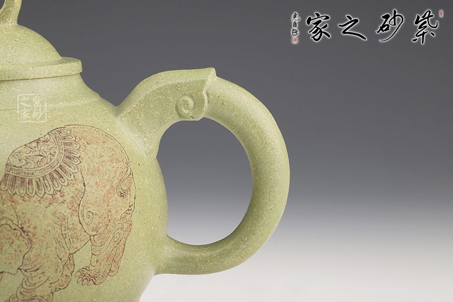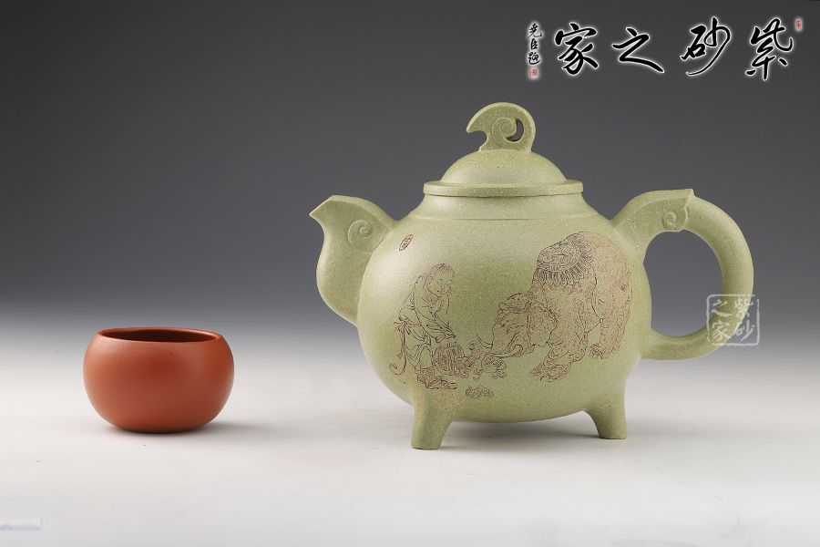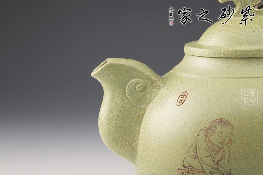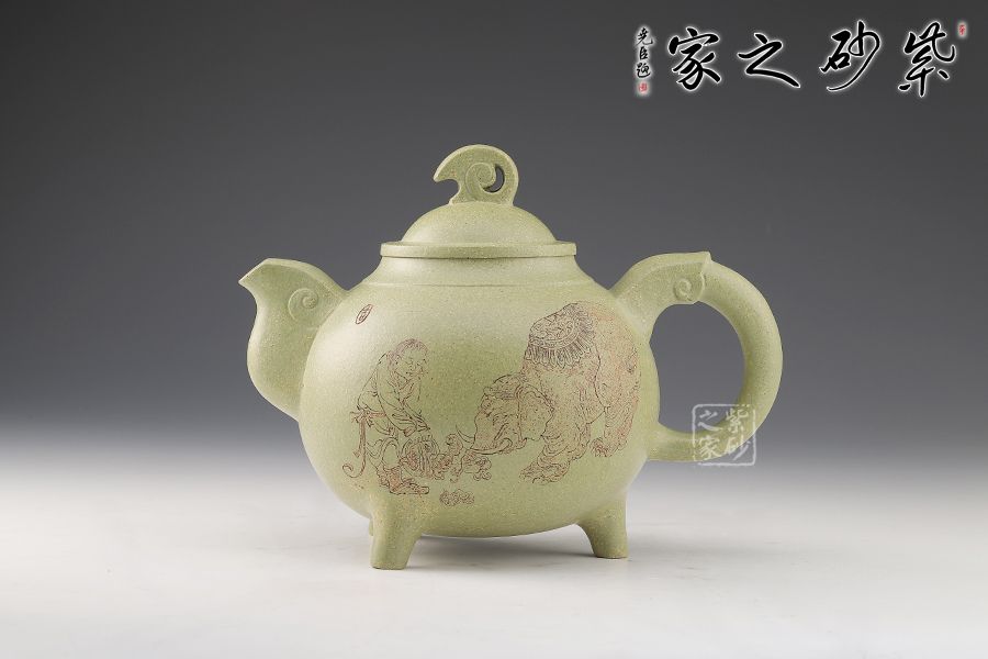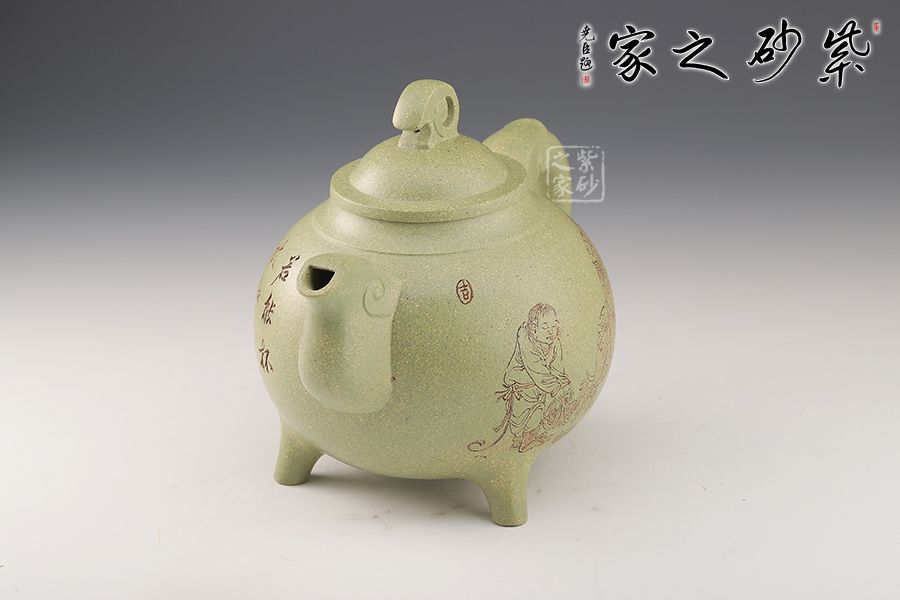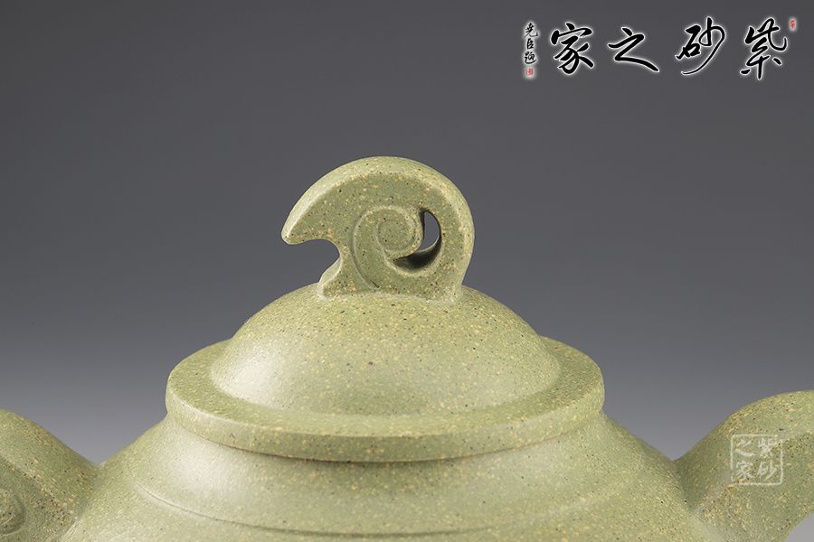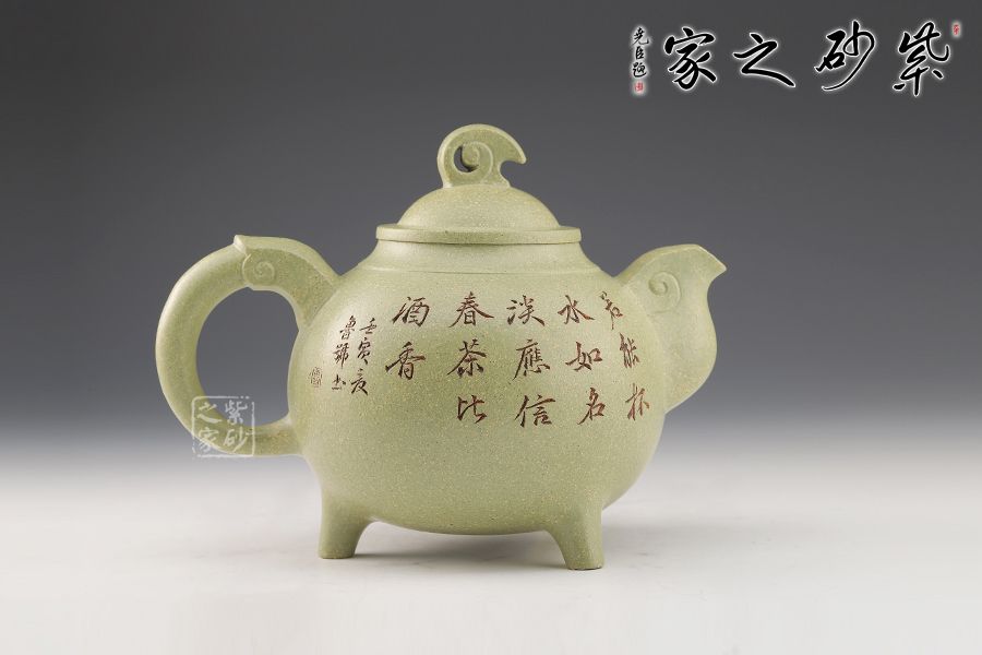 此壺仿羊而做,壺流、壺鈕、壺把皆以羊頭形出,形象逼真。底部三足,沉穩(wěn)有力,牢牢支撐壺體。壺身圓潤,壺腹飽滿,似大肚之態(tài)。壓蓋設(shè)計(jì),蓋頂高聳。