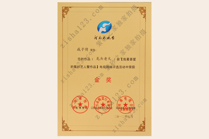 2012年6月《龍頭老大》在由河南電視臺舉辦的“我最喜愛的紫砂藝人暨作品”電視網(wǎng)絡評選活動中獲得金獎