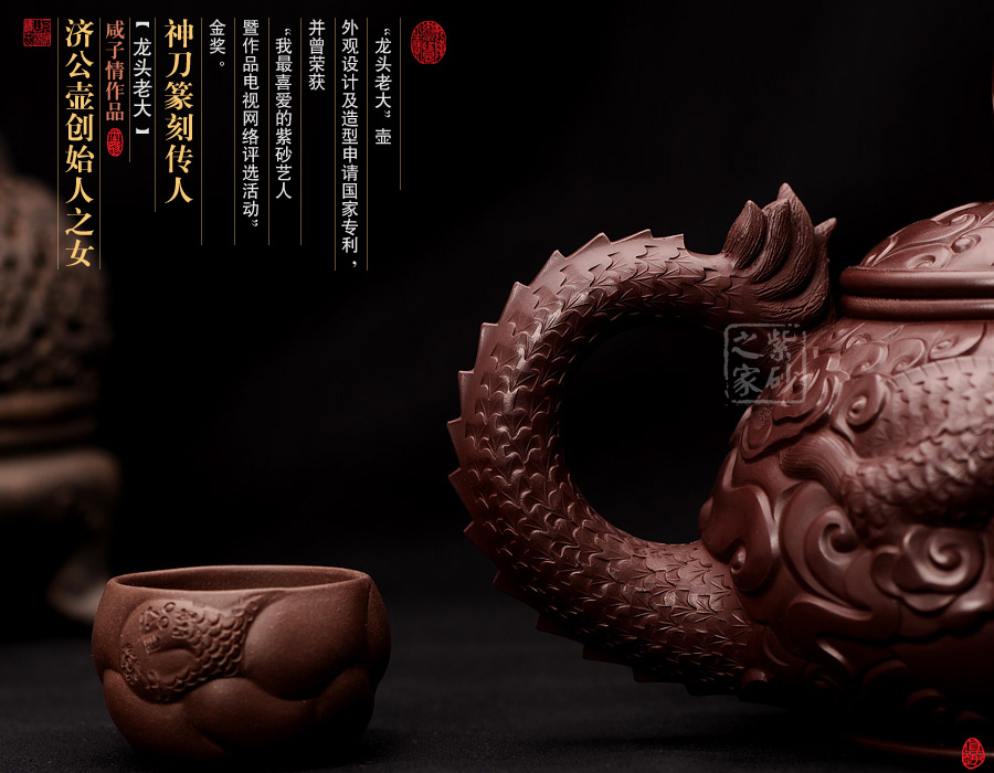 “龍頭老大”壺外觀設計及造型申請國家專利,并曾榮獲“我最喜愛的紫砂藝人暨作品電視網(wǎng)絡評選活動”金獎。