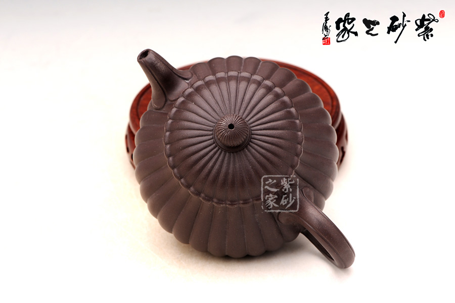 壺身細(xì)密的筋紋造型則令作品平添精絕、玄妙之感,讓人愛不釋手:壺身自上至下,菊瓣筋紋呈完美的發(fā)散狀,沒(méi)有絲毫的紊亂,分布均勻無(wú)比,每一瓣卻又獨(dú)一無(wú)二,壺口、壺蓋咬合部分也十分吻合,氣密性良好。