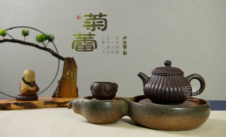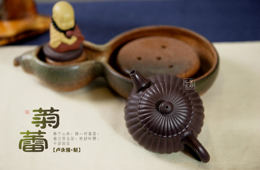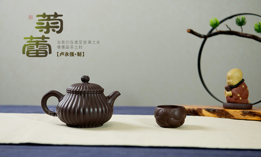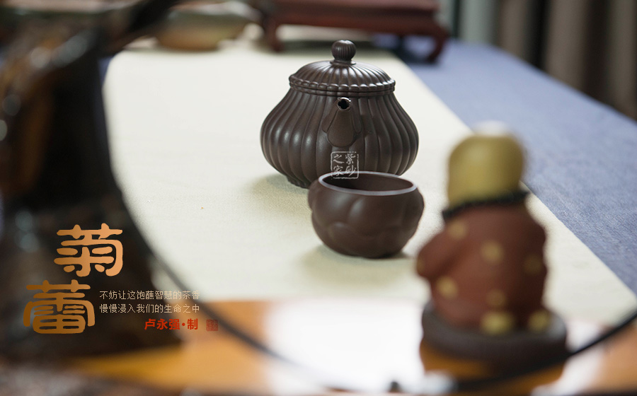 盧永強(qiáng),工藝美術(shù)師,1970年生于江蘇宜興紫砂世家,87年涉藝紫砂,先入中央工藝美術(shù)學(xué)院專修陶瓷造型設(shè)計(jì),后得高級(jí)工藝美術(shù)師張慶臣(陶瓷大師何道洪高徒)親授,悟于時(shí)間,靈妙入化,使作品打下了堅(jiān)實(shí)的傳統(tǒng)功底,得紫砂陶之精妙靈氣,所制作品動(dòng)靜有序,追求整體的和諧永雋。作品做工細(xì)膩、簡(jiǎn)潔大氣,常選用“泥中君子“美譽(yù)的稀有紫茄泥制作,古拙典雅、沉穩(wěn)內(nèi)斂、不失氣勢(shì),值得關(guān)注;其代表作品《紫玉金環(huán)》、《菊仿古》、《三友》等不愧是紫砂精品,全面精湛地展示了其制壺技藝和創(chuàng)作才華,后期潛力無(wú)限。
