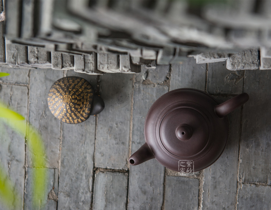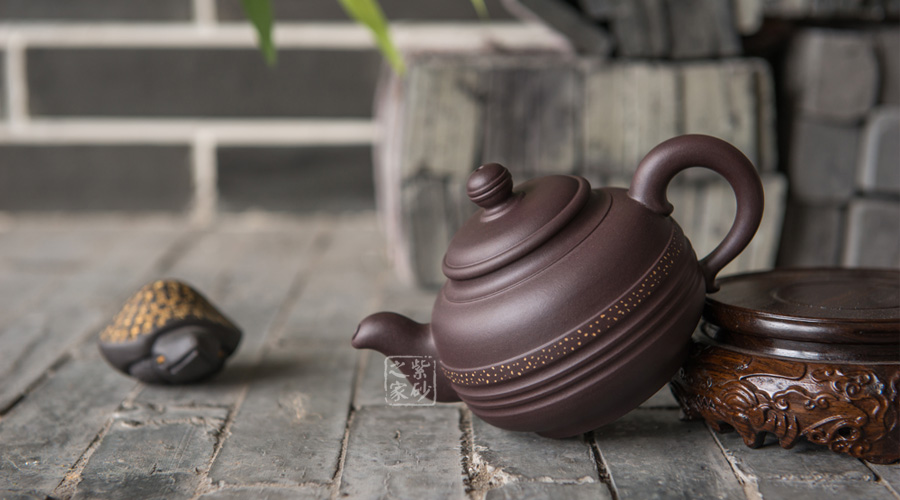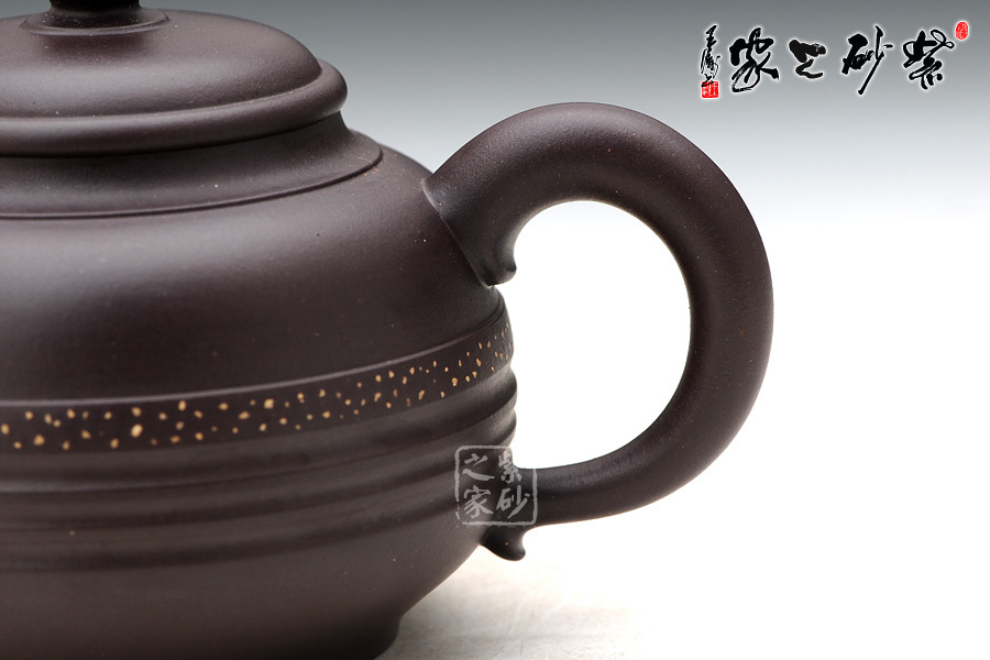 作品似“鼎”而立,神韻非凡,形態(tài)飽滿,線條流暢,渾然天成;此壺選用精品紫茄泥制作而成,紫韻中蘊(yùn)藏著潤(rùn)透的光澤,凸顯出豐盈細(xì)膩的質(zhì)感,使整件作品透著一股高貴典雅之氣,不覺(jué)令人愛(ài)不釋手;明接耳形端把更顯工藝的古老和精湛,端握溫和稱(chēng)手;壺嘴的造型同樣古拙精巧,嘴型三彎,壺基豐厚,蜿蜒而出,嘴口圓潤(rùn)至極,出水流暢爽利;平蓋蓋面圓潤(rùn),一粒的子圓潤(rùn)碩大,壺鈕中段兩環(huán)玉帶束之,似乎將其一份為二,極為有趣;壺身中段同樣以一環(huán)玉帶束腰,玉帶之上以金砂鋪蓋,泛著金色的光芒,玉帶下方,三條凹槽與玉帶陰陽(yáng)相去,如蕩漾的水波,層層疊疊,頗具動(dòng)感。