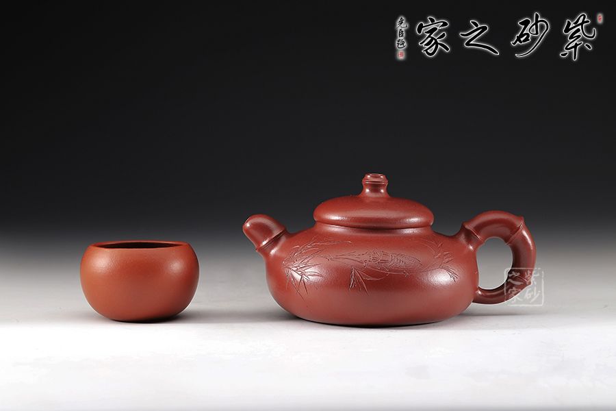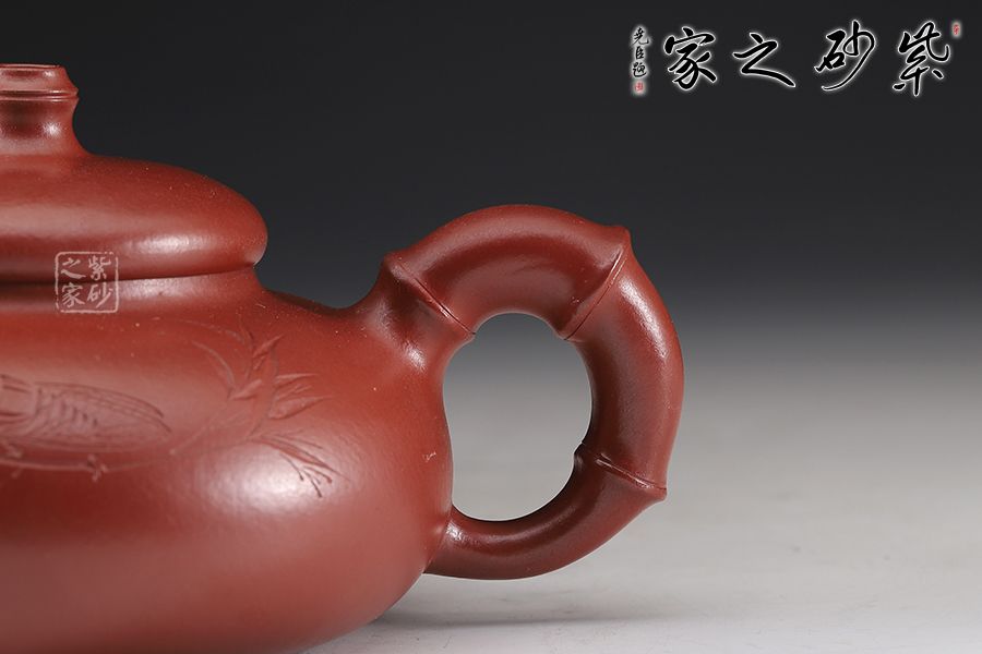 壺身略呈矮筒狀漸收至壺肩,矮直頸,壓蓋中央向上鼓起,壺蓋邊緣與壺口邊沿吻合嚴(yán)密。 壺嘴、把、蓋鈕亦取竹段,生動(dòng)自然,挺拔清秀。竹自清高,壺亦清高。壺身雙面陶刻,正面刻繪竹葉、禪,反面刻繪“知足常樂(lè)”四個(gè)大字,呼應(yīng)壺意。