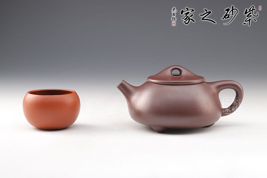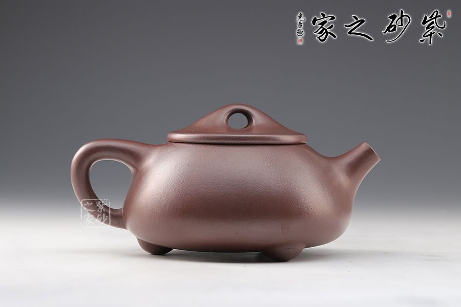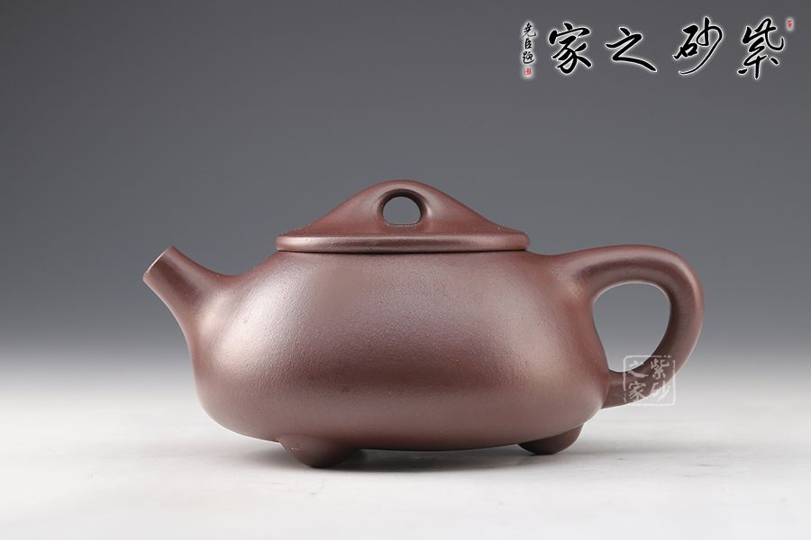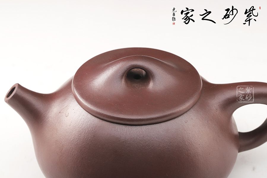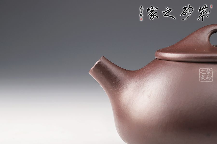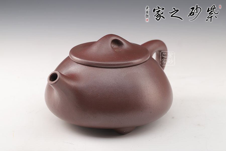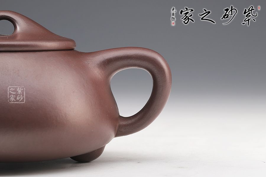 此壺造型渾厚樸拙,曲線柔和流暢。壺身呈梯形,三角釘足支撐,給人以輕靈而穩(wěn)重之感。直流壺嘴,簡潔見力度,暗接處理,溶于壺身整體。壺把呈倒三角勢,與壺身之型互補,形成和諧的美學效果。平壓蓋,橋鈕,干凈利索,比例恰當,充分體現(xiàn)出秀巧精工為上的特點。