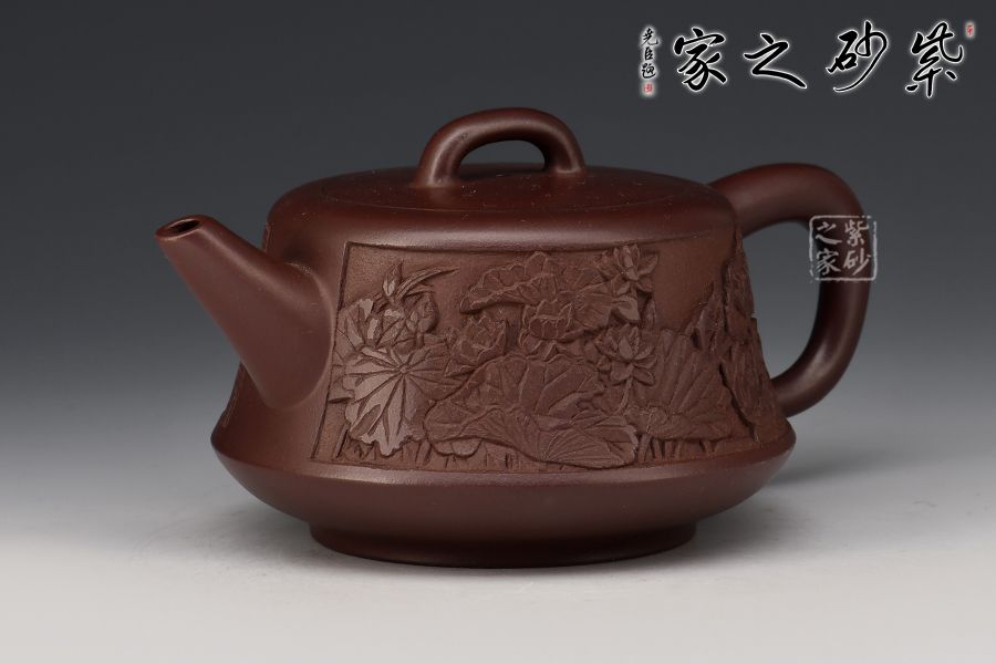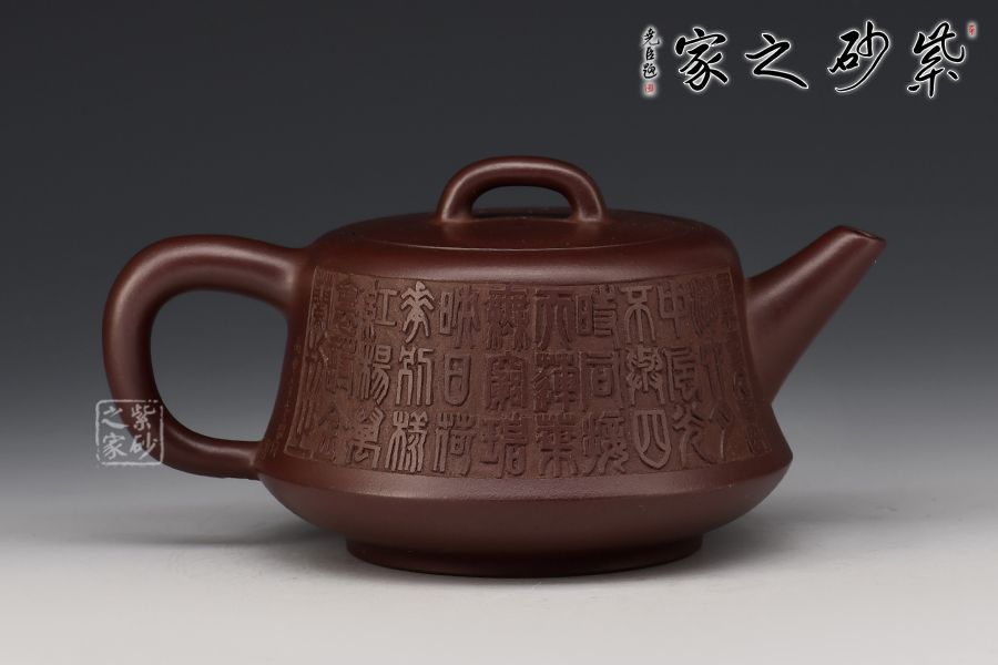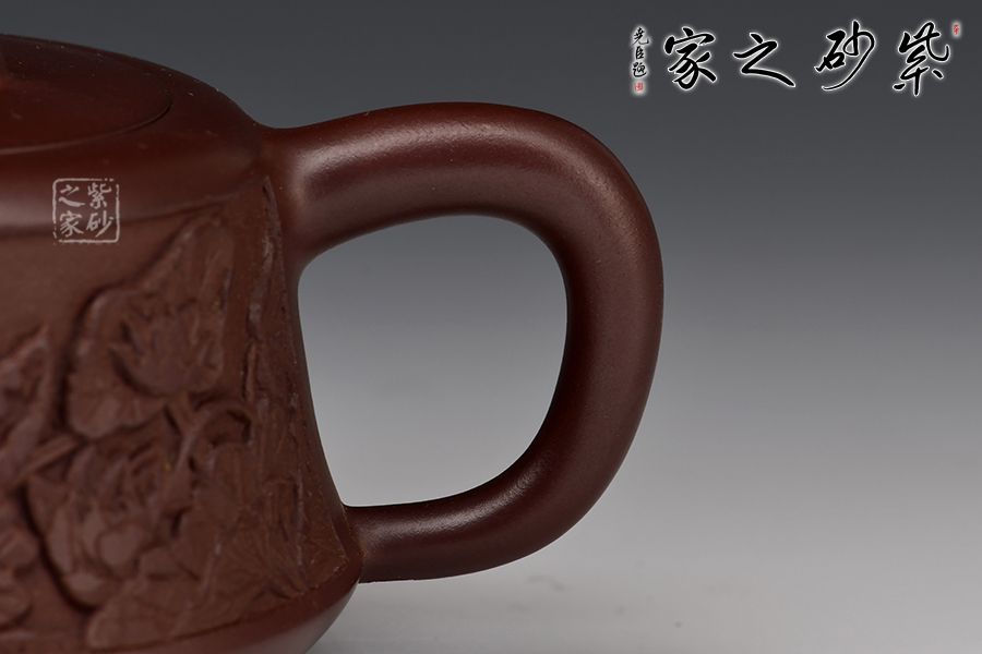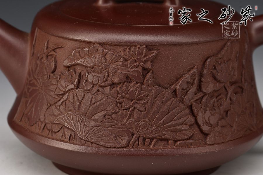 壺身為柱礎(chǔ)造型,靠近壺底與上部相接而成,腹底修飾平滑,上部自棱線出緩緩上收,加上嵌蓋隆起的壺蓋和其上平滑的橋鈕,整壺合攏成銅鈴之態(tài),生動(dòng)巧妙。直流嘴壺腹中間胥出,包舌口非常適合把玩的時(shí)候淺抿香茗;耳把流轉(zhuǎn)自然,與壺嘴形成對(duì)應(yīng)之勢(shì),將壺身張力展露無遺。壺腹陽刻裝飾,在壺身上呈現(xiàn)出立體的美,推薦收藏!