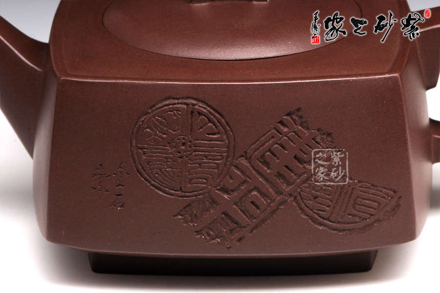 壺身裝飾篆刻由咸子情之父、大師咸仲英老先生親手操刀,壺身正面篆刻的是古幣的樣式,是古朝代中的象征,錢幣有招財進寶之意,同是有辟邪的作用;壺身反面篆刻的是咸仲英的落款。