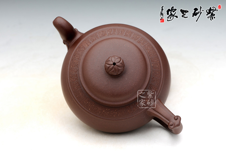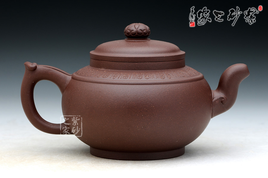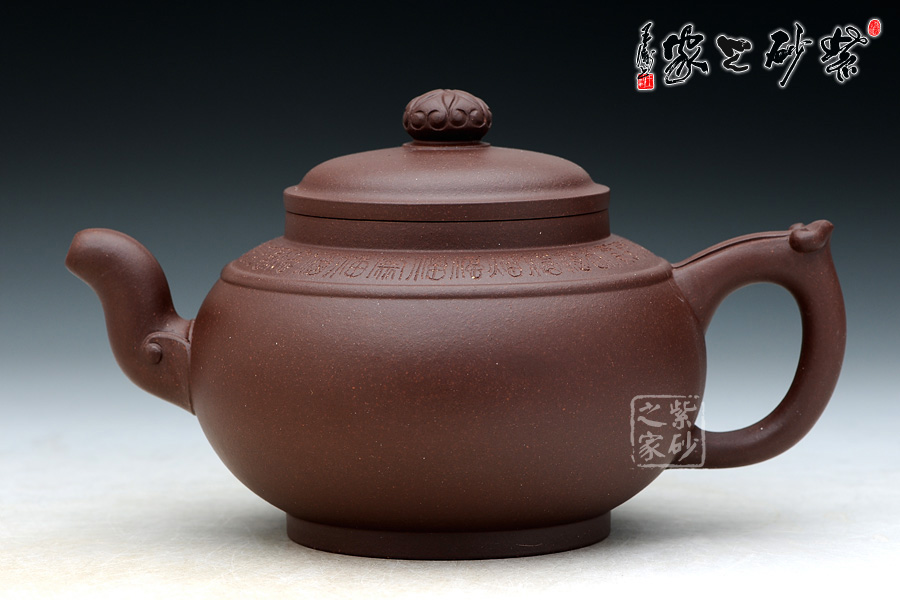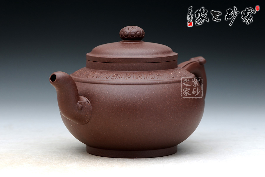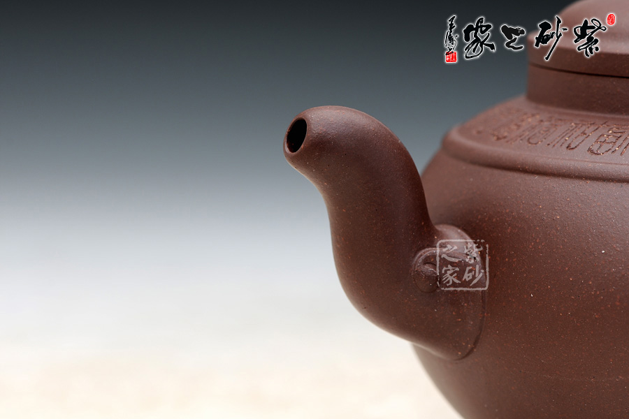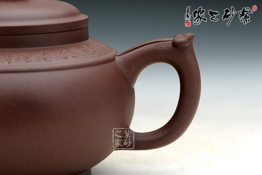 器型圓滑飽滿,造型簡練 有致,精選老紫泥制作,色澤暗褐,質感絕佳;壺身比例恰當,曲線強勁有力,整體結構協(xié)調有致,飽滿的壺身,短而有力的直頸,平蓋極為嚴密,氣密性良好,圓 形壺鈕上刻滿了如意筋紋;壺肩平和柔緩,環(huán)刻一周“福”字,分別都是不同的字體,古拙吉祥;壺肩正中以玉帶環(huán)肩;三彎流彎曲做蓄勁吞吐狀,銜接處以如意紋 飾裝點;環(huán)形把設一飛柄執(zhí)握方便,飛翼同樣也呈如意造型,與壺嘴前后相呼應。