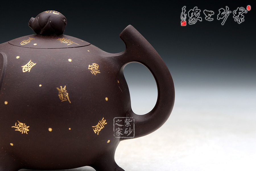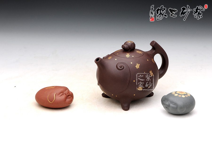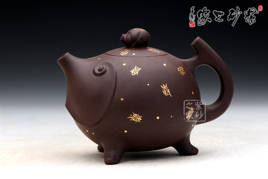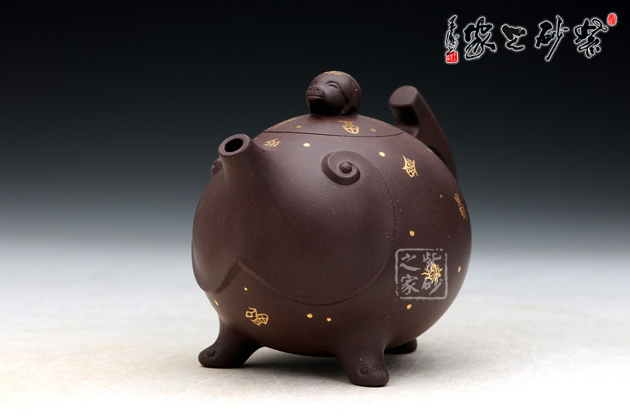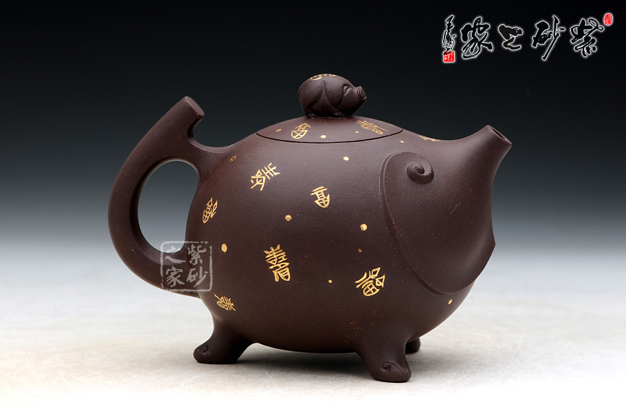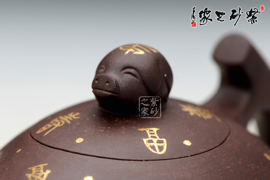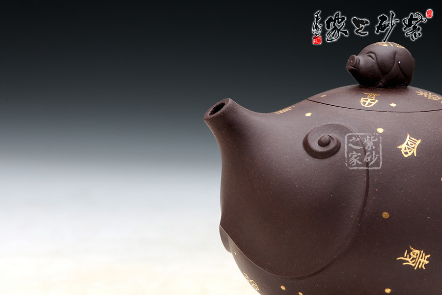 這款豬壺非常的形象,憨態(tài)可掬的形象盡收眼底,滾圓滾圓的壺身將豬的形態(tài)夸張化,壺嘴部分也呈豬臉樣式,如意紋飾恰似豬的眼睛,尤其是壺嘴像極了豬鼻子;壺把則是自下而上翹起,上部出頭,就像豬的尾巴;底部三足短促精巧,且呈如意花紋式,像豬的腿;壺鈕是一只描金的小豬,眉開眼笑的,十分有趣;壺身采用描金的裝飾手法裝飾了若干不同字體的“福”字,尊貴而又福運,豬和福,取“祝福”之意。