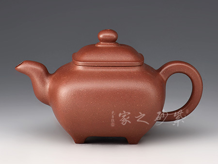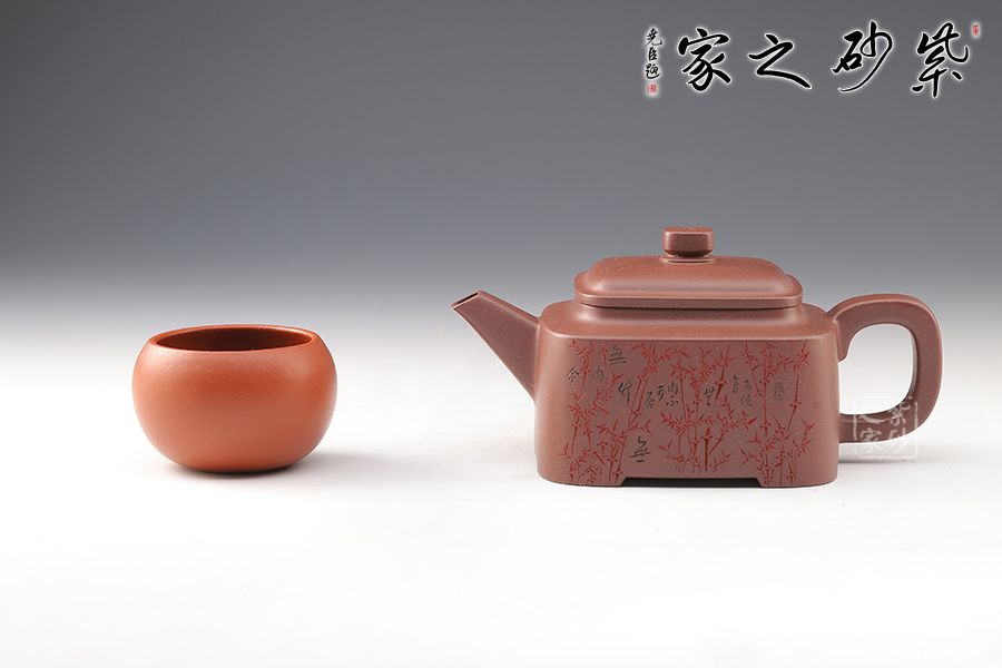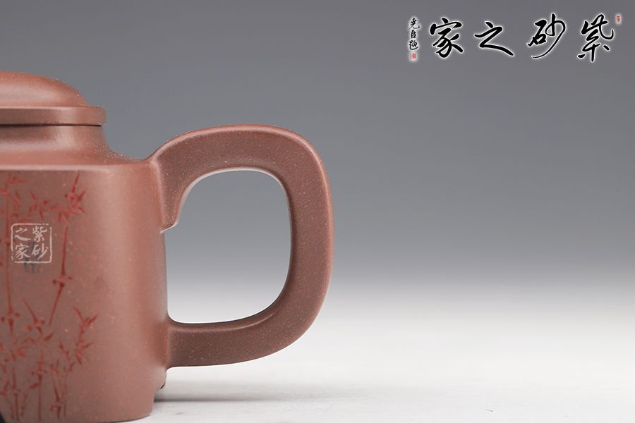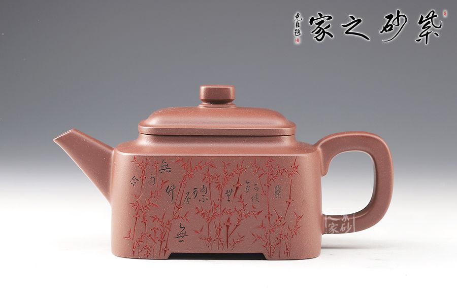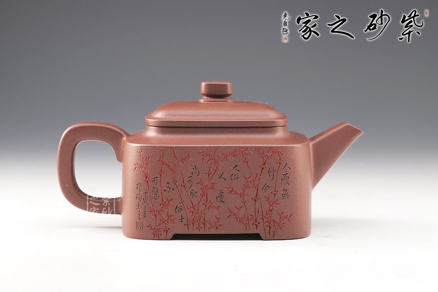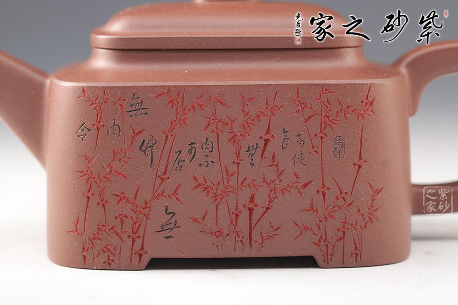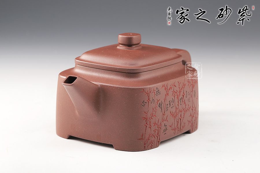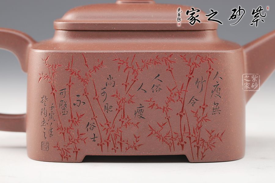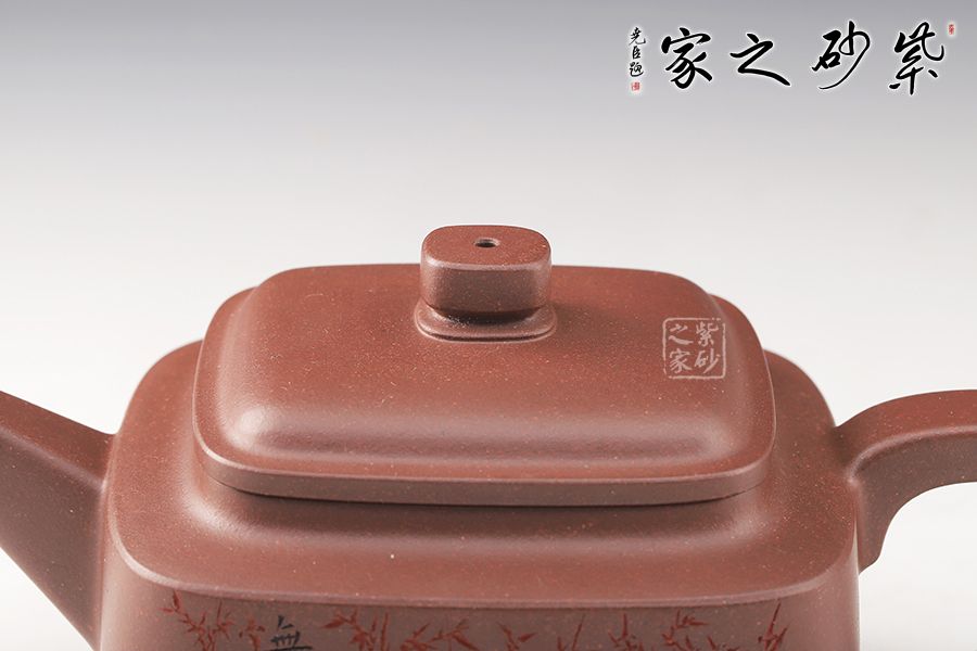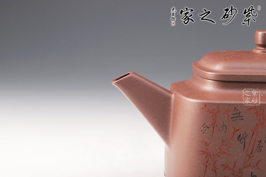 四方型制,方中寓圓,骨肉亭勻,雅俗共賞,有清正直諫君子之風度。壺鈕是對應縮小的四方體,直流嘴為錐狀,口沿切面平整,出水有力。雙面刻繪,筆法細膩娟秀,極具文人氣息。