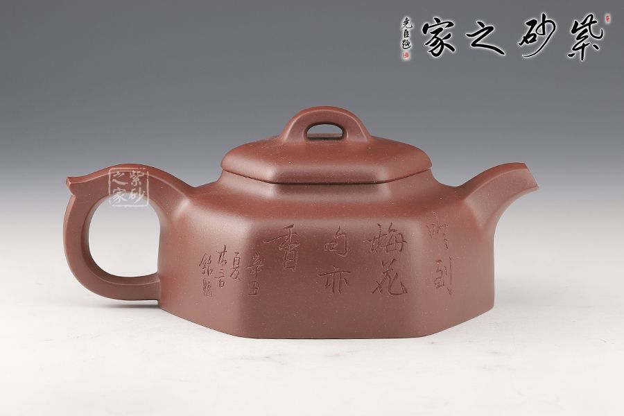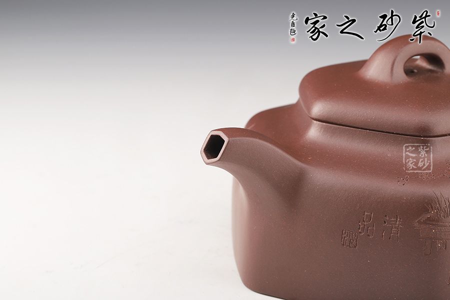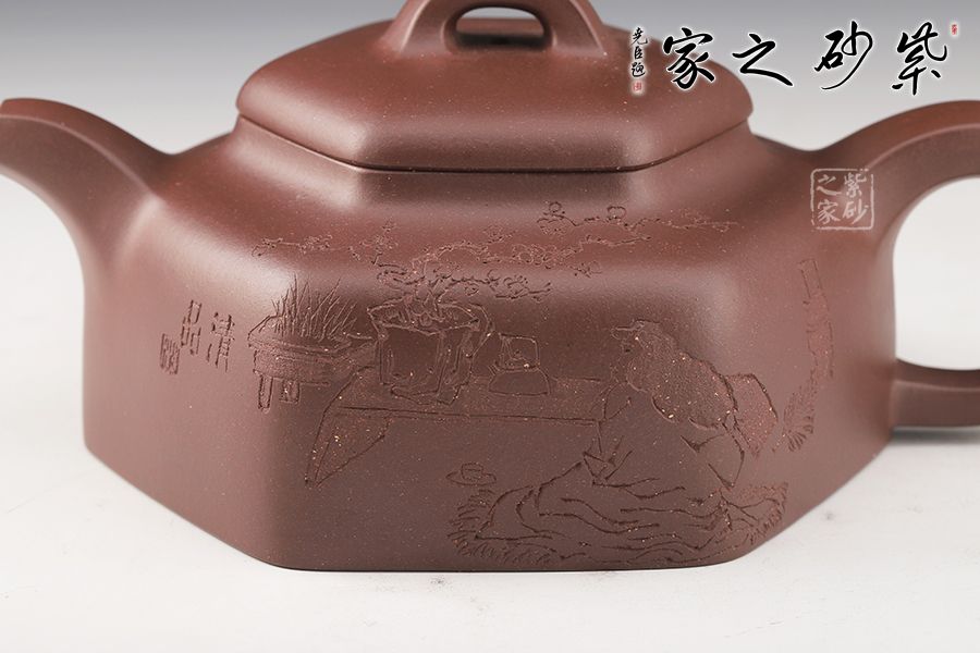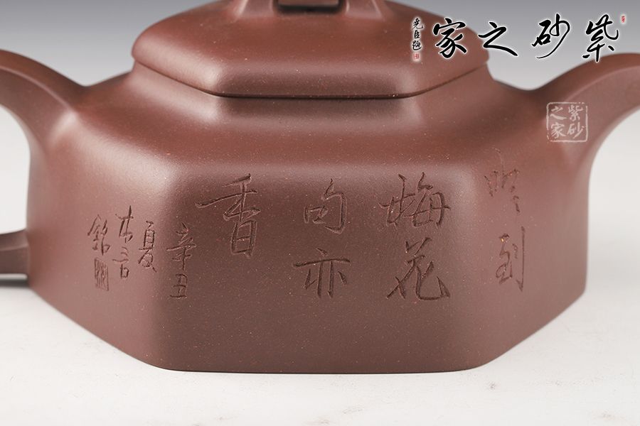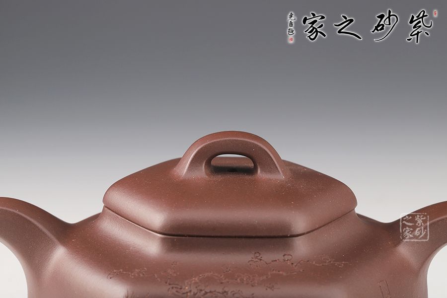 規(guī)整的六方壺型制作,比例精準(zhǔn),線條緊湊流暢,整體一氣呵成,沈韻悠然,足見(jiàn)制壺 者精湛的制壺工藝。壺鈕,壺蓋,壺口,短壺頸皆是規(guī)整的六方形,對(duì)稱工整。壺身上斂下豐,穩(wěn)重大氣。