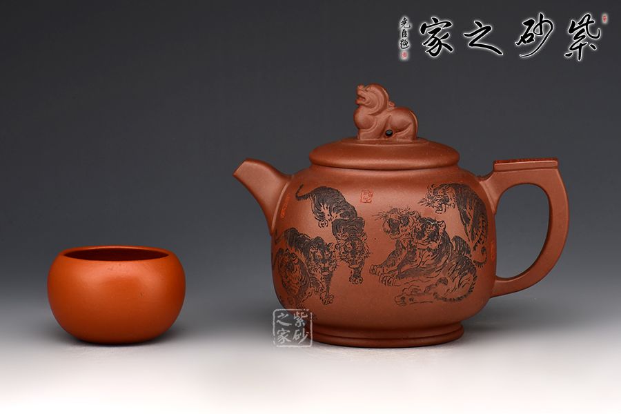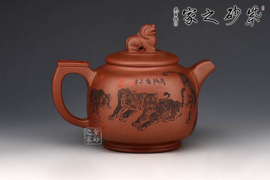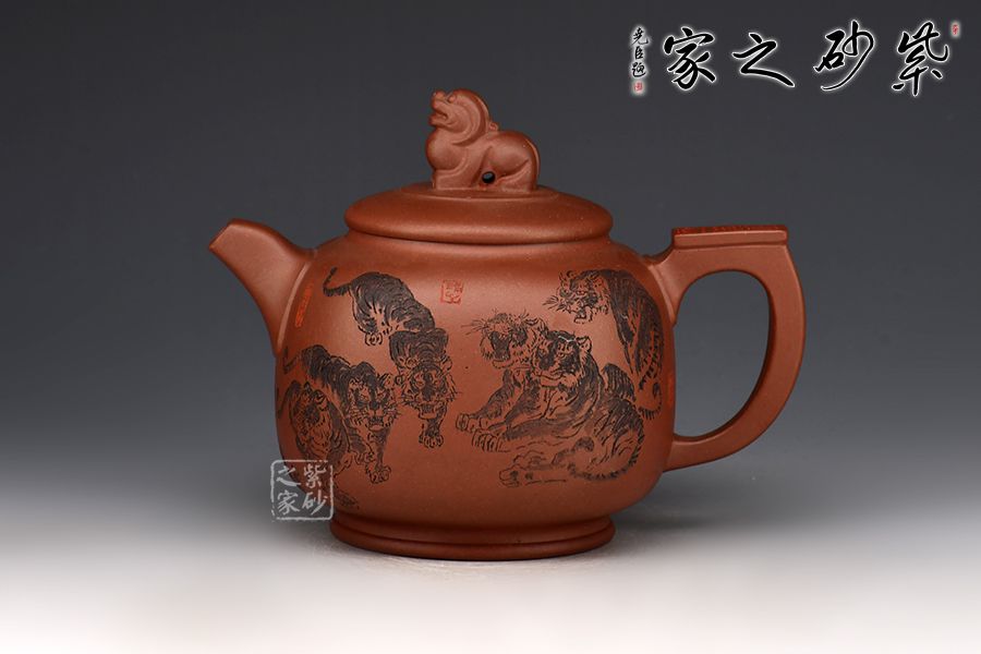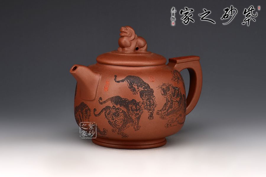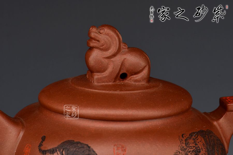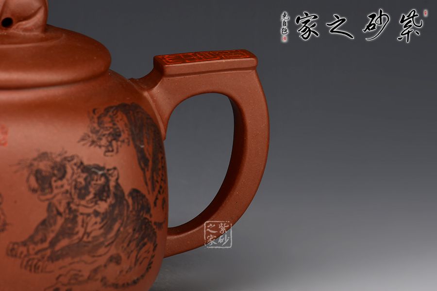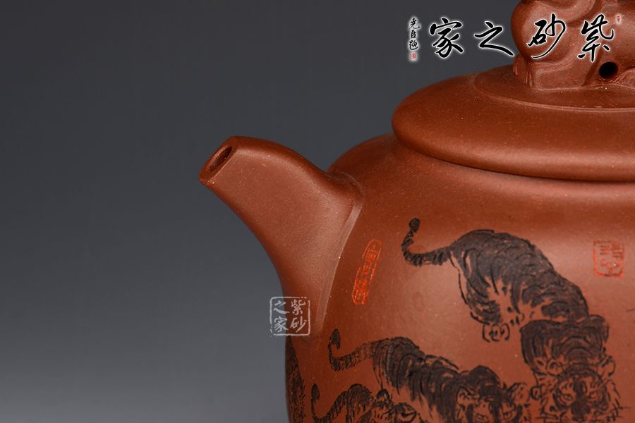 壺身飽滿圓潤(rùn),線條流暢,圓盤加底,挺拔壺身。嘴、把四方,一彎流出水爽利,耳把拿捏舒適。大口蓋,好投茶,以虎為鈕切合主題,老虎的形態(tài)都異常逼真,兩眼炯炯有神,肌肉線條飽滿清晰,整器充滿一股力量感,并具神韻氣質(zhì),與作品的主題相融合。