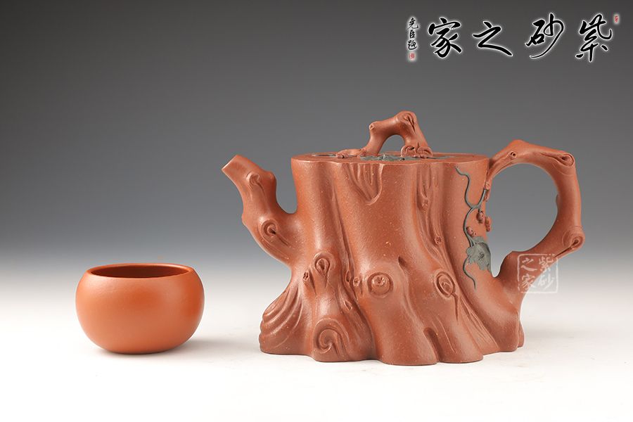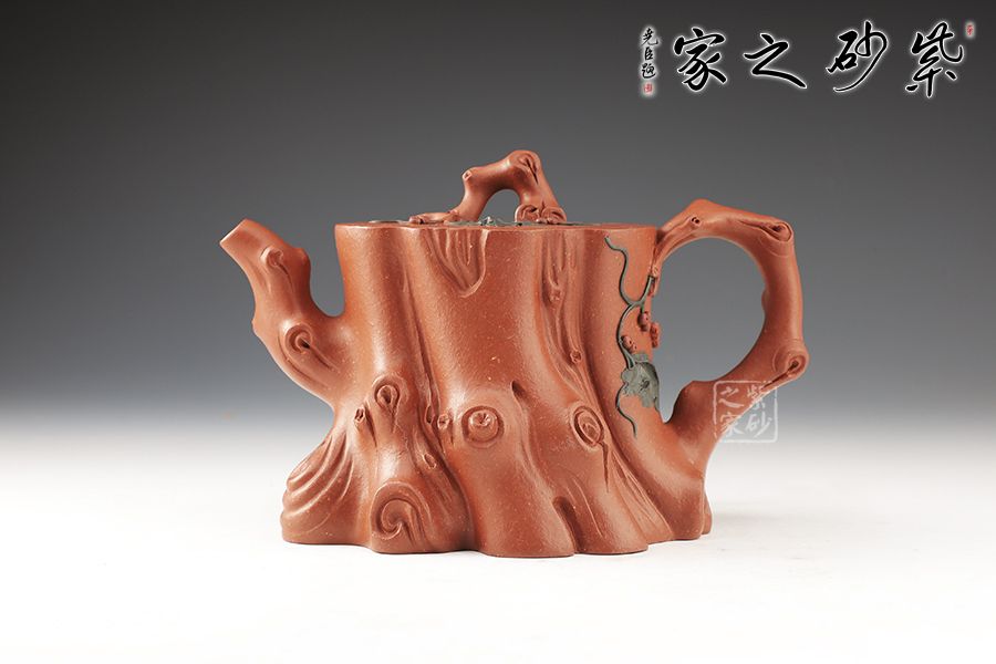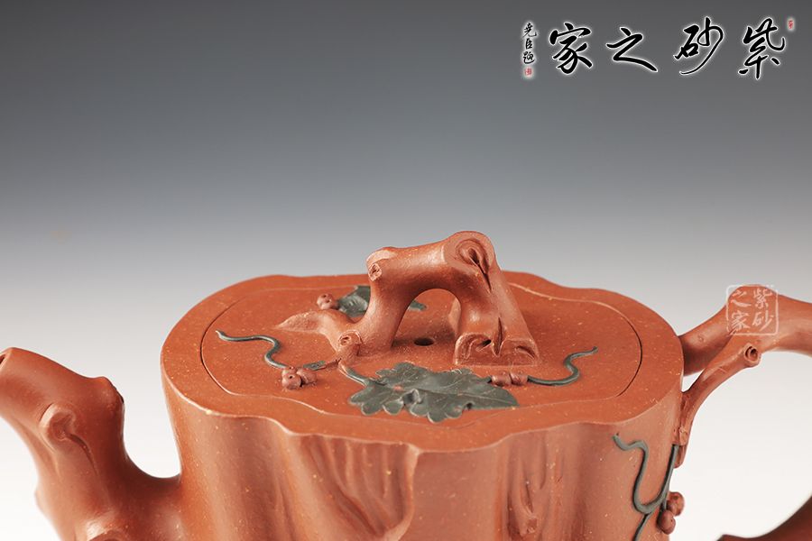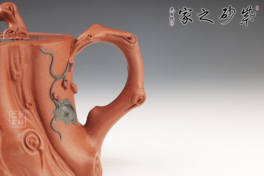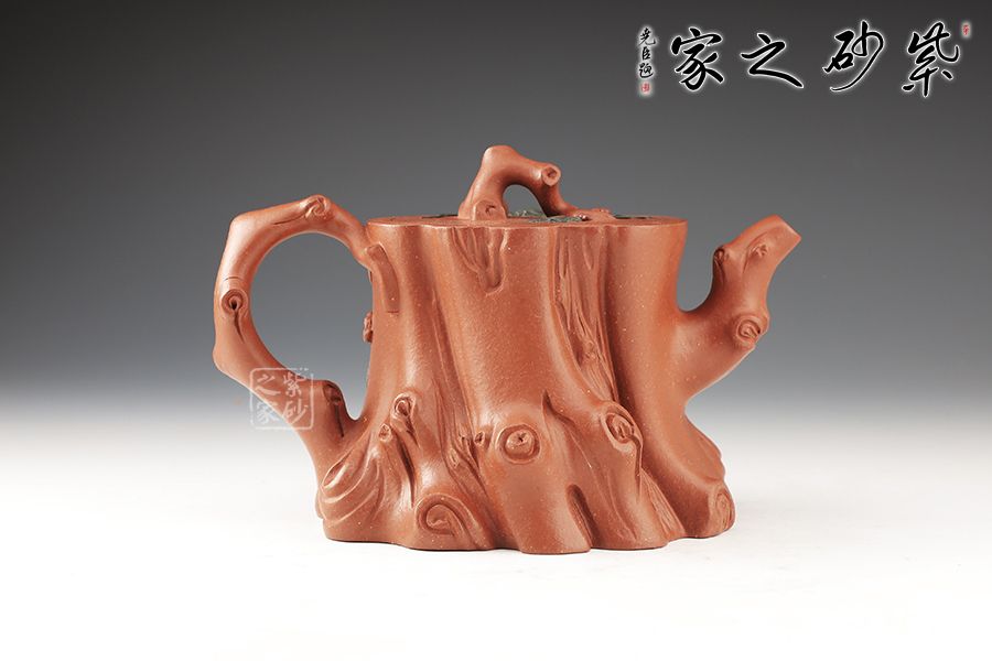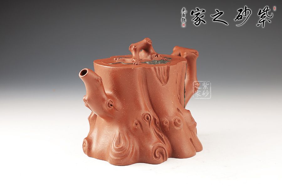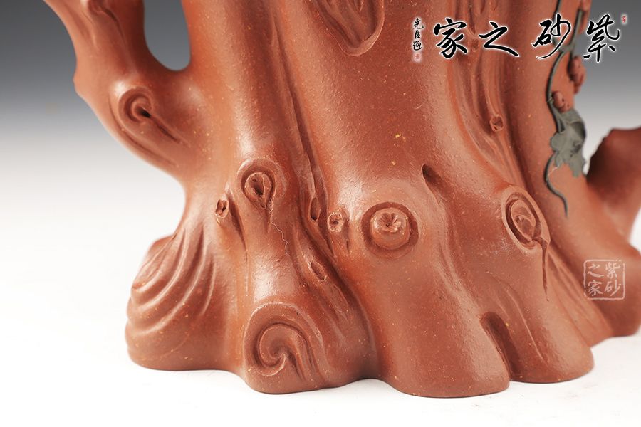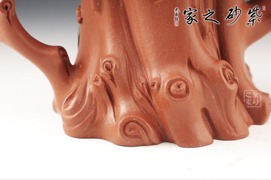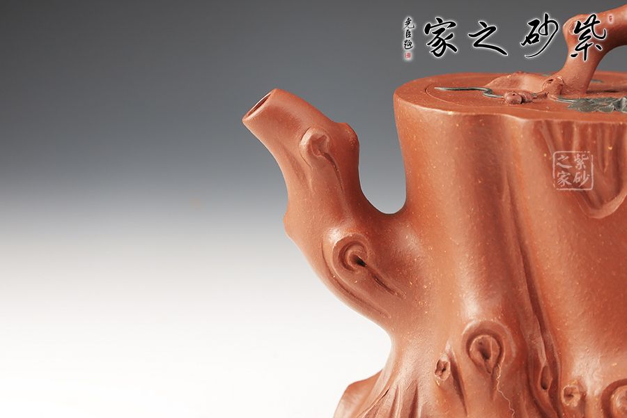 樹木的形態(tài)上下貫通,逼真自然。樹樁粗細不同,上下全不規(guī)則,再加上各種瘢痕、裂紋、樹皮的模樣,更顯得樹樁十分生動。壺嘴、壺鈕和壺把則是樹枝,有彎有直,有收有放,粗細不一,將樹樁壺點綴得尤其逼真。