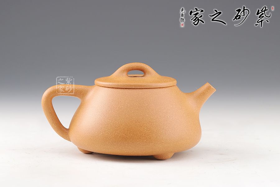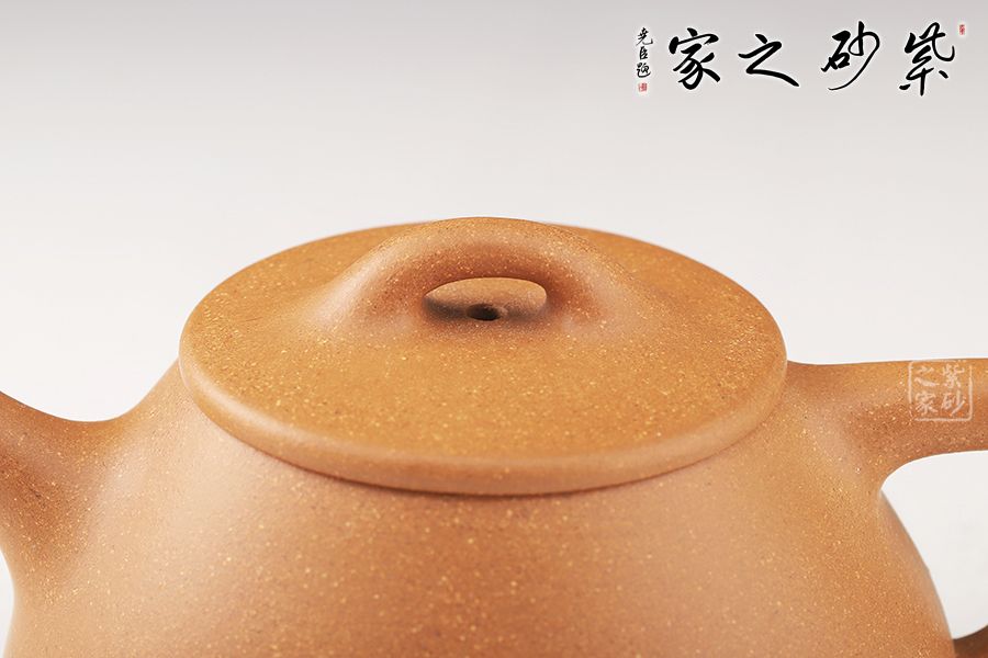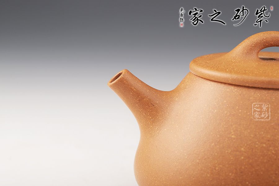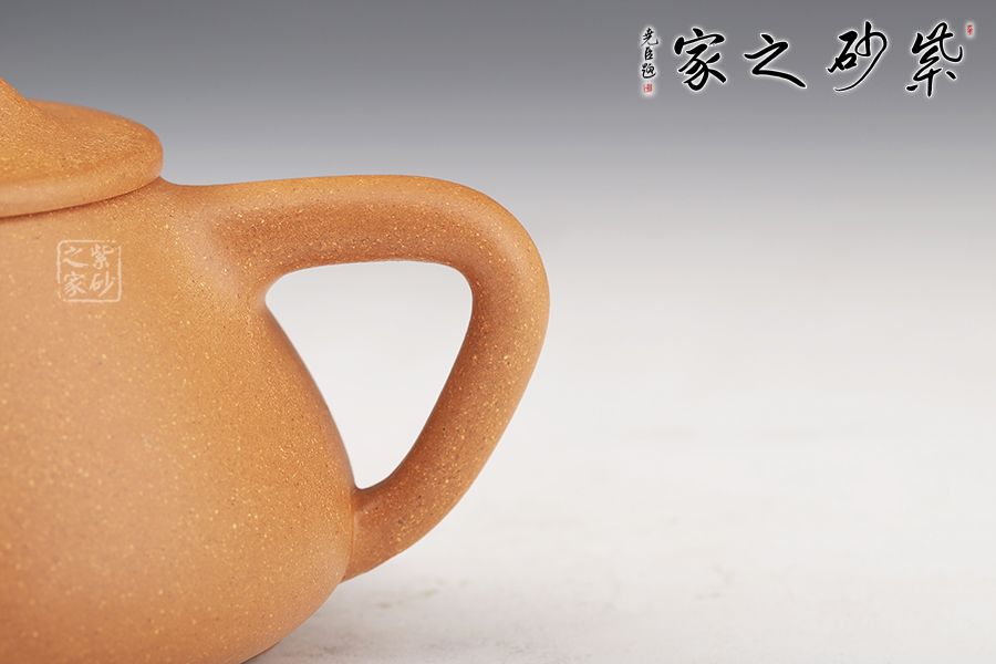 此石瓢壺為老師摹古而作,采用原礦黃金段精制而成,泥質(zhì)細膩,明潤雅致。整體造型簡約大方,壺身呈金字塔形,壓蓋之上以橋鈕裝飾,長直流簡而有力,出水順暢,壺把呈倒三角勢,與壺身之型互補,形成和諧的美學效果。整器形態(tài)挺拔,線條彎曲有度,骨力十足,成色佳,易泡養(yǎng),是一把非常實用的殺茶利器。