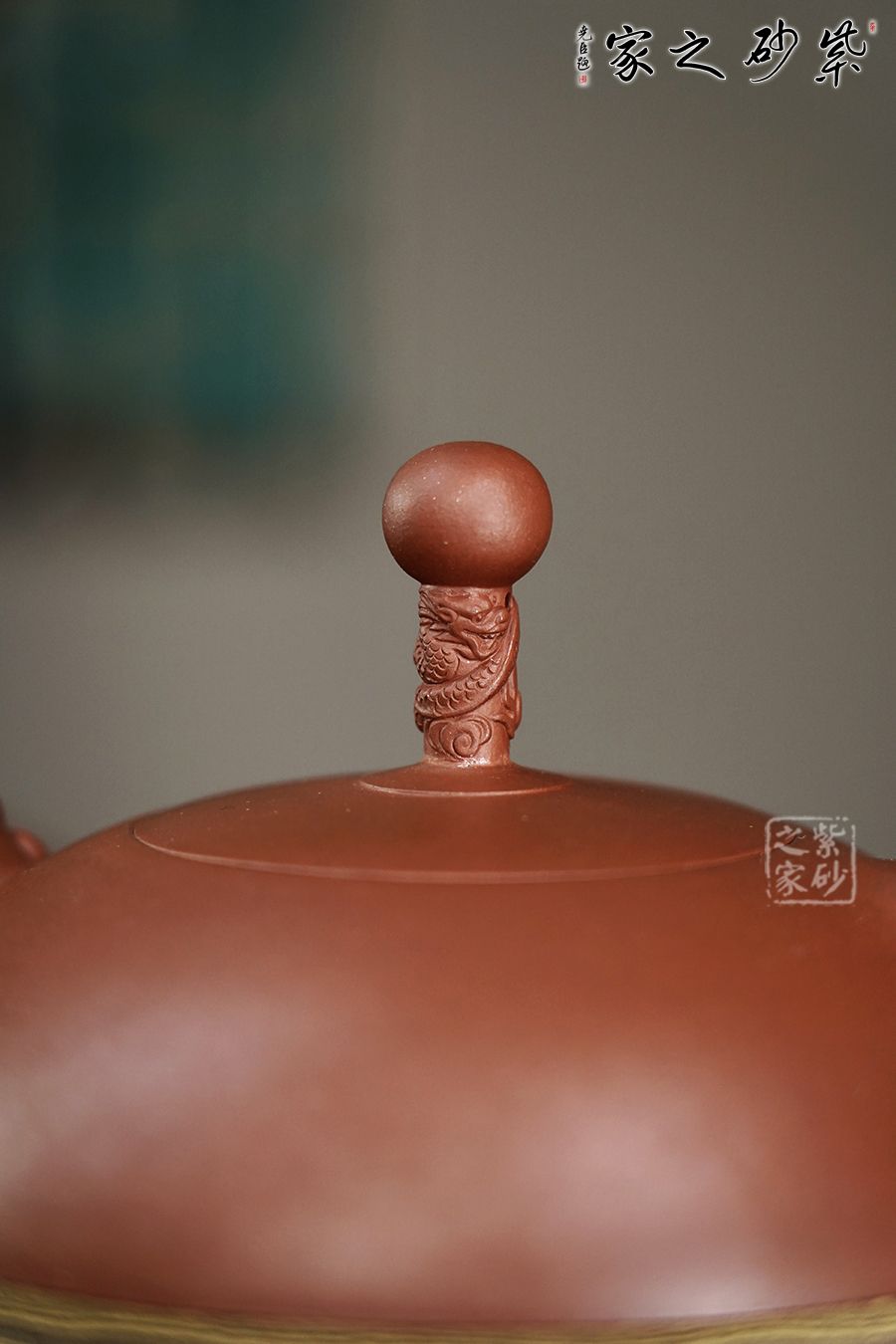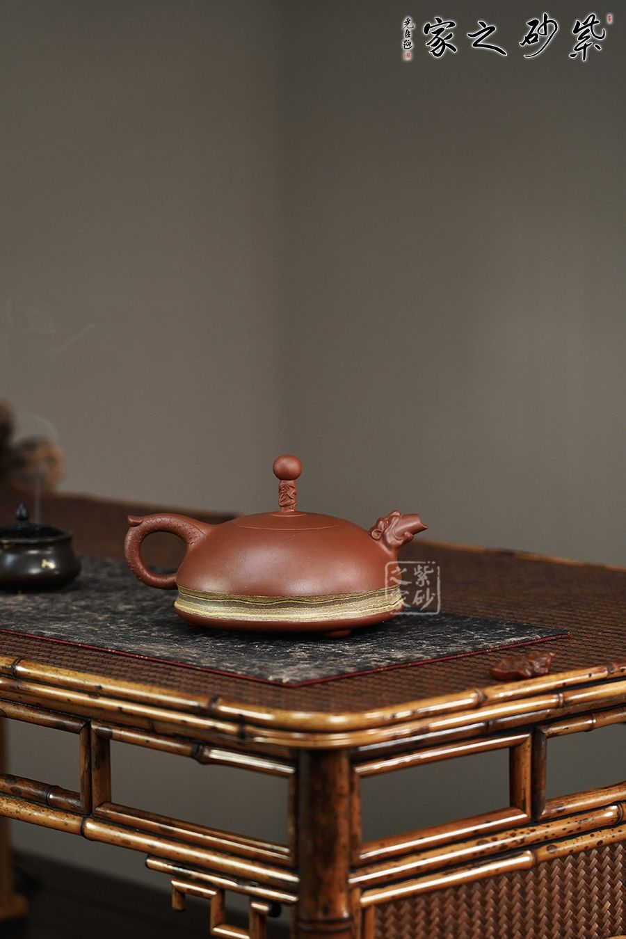 季益順,紫砂四小龍之一,中國(guó)陶瓷藝術(shù)大師,江蘇省工藝美術(shù)大師,紫砂藝術(shù)承前啟后的扛鼎人物。 此壺壺身半圓,腰部以絞泥裝飾,幻化成似流云又似海濤之象,虎頭為壺嘴,短直有力。壺把為耳形飛把,飾以龍鱗,為龍之后半身。壺鈕為盤起的龍頭,頂部為圓珠,是蛟龍戲珠意象。半圓壺底為三個(gè)釘足,輕托起整壺,以顯穩(wěn)重而不失靈動(dòng)之態(tài)。壺蓋飽滿自然嵌于壺身之上。通體觀之,虎頭吞口直流,龍身尾刻畫細(xì)膩?zhàn)匀?,龍首戲珠正直有力,蘊(yùn)涵祥瑞氣息。整壺通理得趣,是一件不可多得的紫砂創(chuàng)新作品。