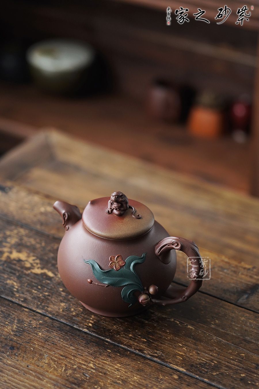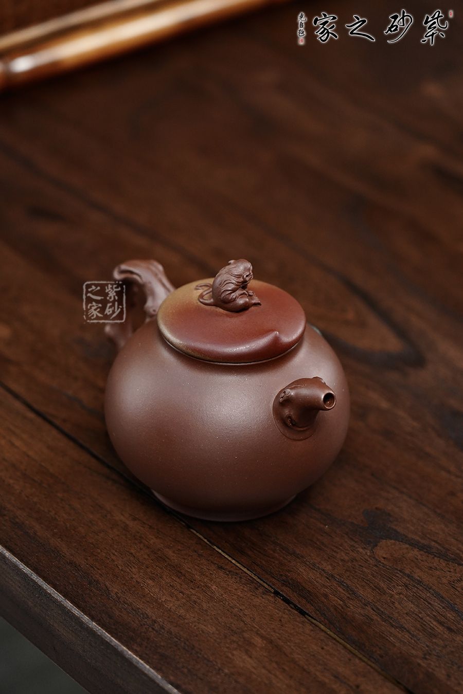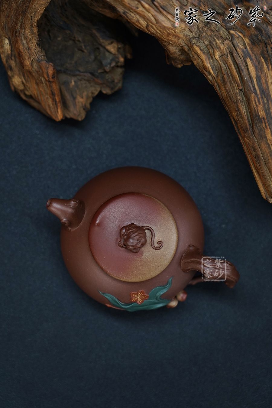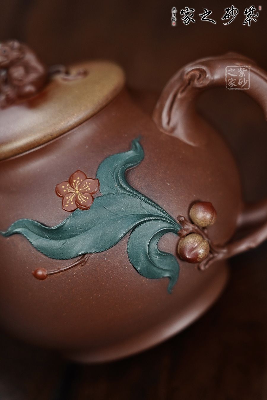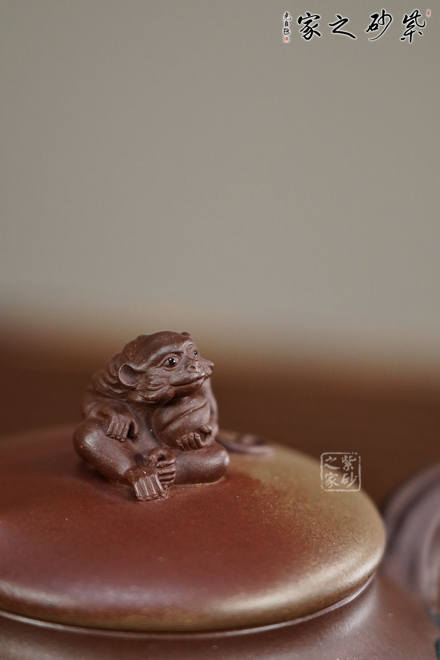 采用了原礦紫泥制作而成,泥色細膩友光澤。渾圓的壺身,半圓的壺蓋,壺鈕就是靈猴壽桃,桃子圓潤,小猴生動,足見作者之手筆精湛,點線之間見出魅力,骨肉亭勻,簡練大方,制作頗見功力,彎流壺嘴,在端頭下壓,柔美之姿明顯,壺柄略微上抬之后優(yōu)雅滑落而下,形成一條圓潤飽滿的弧線,樸雅大方,在圈足的襯托下更覺得錯落有致,給人明快的節(jié)奏感。 壺嘴、壺把桃枝干裝飾,壺身貼花裝飾,栩栩如生的小桃子與桃葉點綴在壺身周圍,整壺構(gòu)思精巧,妙趣渾然,讓人愛不釋手,饋贈與收藏皆是佳選。