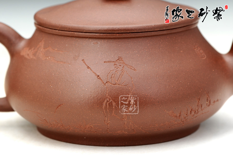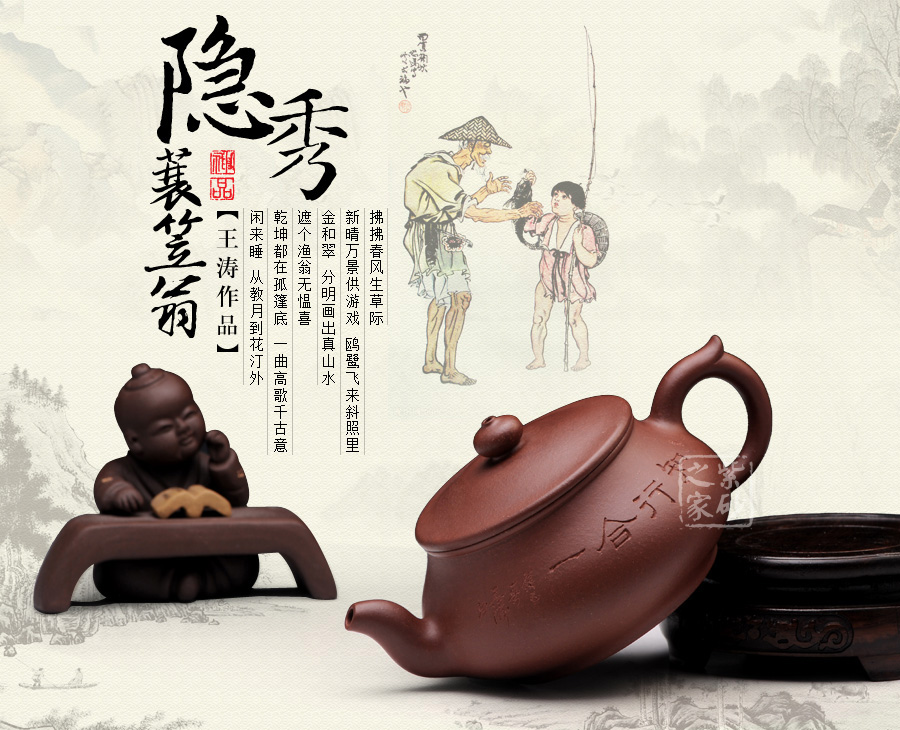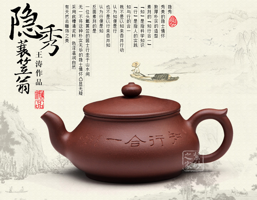 隱秀,秀美的隱士情懷,敦厚樸實(shí)的造型,素刻的“知行合一”,“知”是指科學(xué)知識(shí), “行”是指人的實(shí)踐,知與行的合一,既不是以知來吞并行動(dòng),認(rèn)為知便是行,也不是以行來吞并知,認(rèn)為行便是知。反面素刻的是一位頭戴蓑笠的居士行走于山水間,無一不將這種樸實(shí)無華的隱士情懷凸顯無疑,采用底槽清泥料,色澤溫潤自然,有天然去雕飾之美。