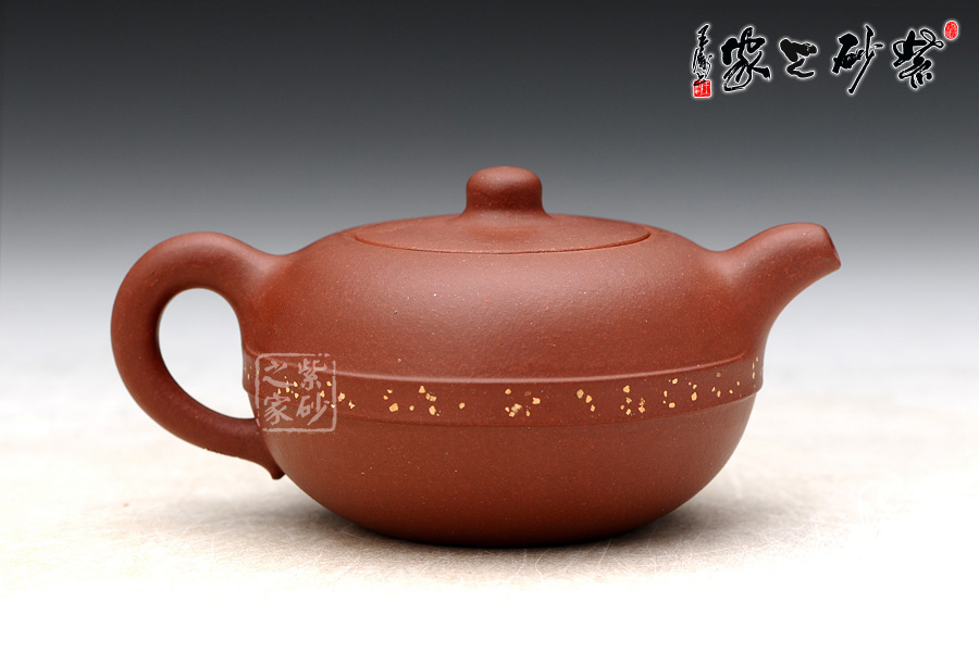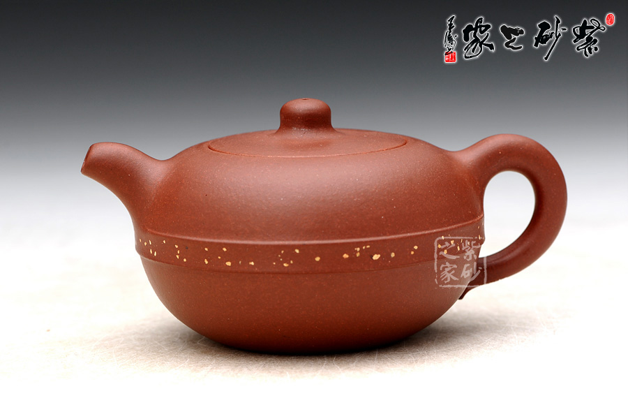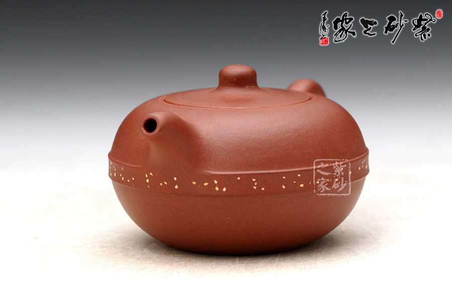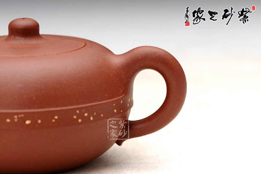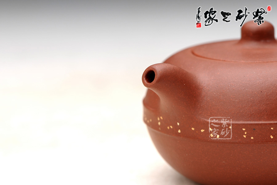 此壺的壺身造型簡約寧和,渾圓而略扁,壺底微微內斂一些,則更顯得壺身的圓潤,有如一只璞玉,絕美無暇;壺身中段一圈玉帶環(huán)腰,采用鋪砂工藝裝點,玉帶之上金光閃閃,尊貴高雅;原礦底槽清的泥料致密細膩,仿若富有彈性的美人肌膚,平嵌蓋,蓋面平實至極,壺鈕與壺蓋一體而生,暗接過渡溫和無痕,鈕與蓋之間有一種牽連感;壺嘴略微柔曲,嘴頭平,嘴口圓潤,嬌小的壺把隨勢,與壺嘴相應和,別有一番韻味。