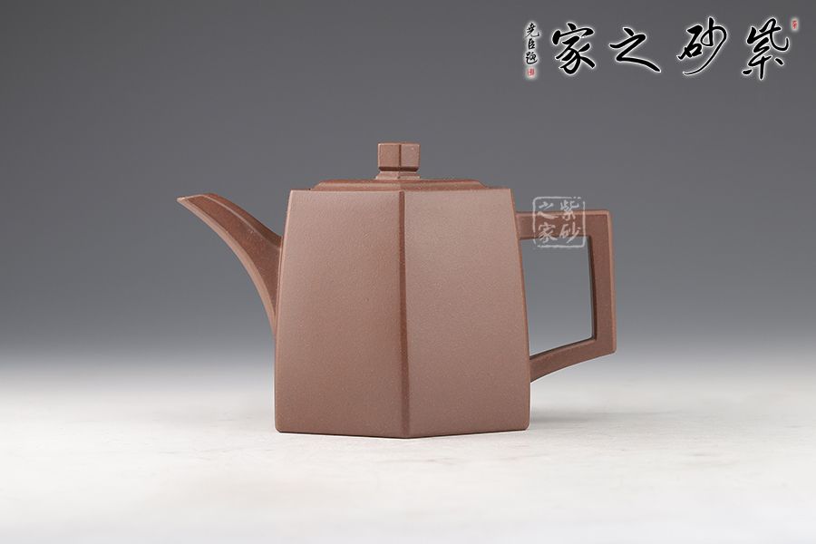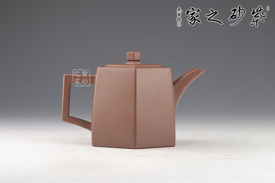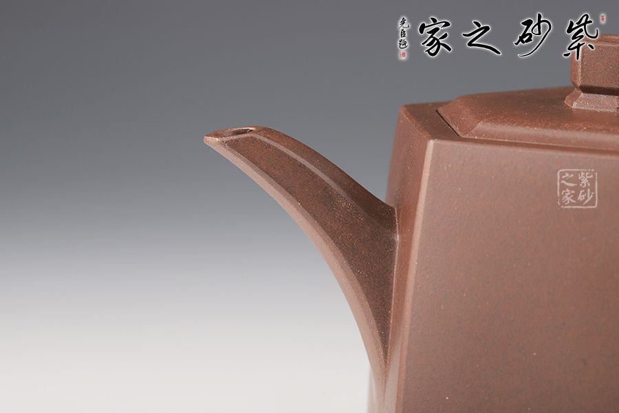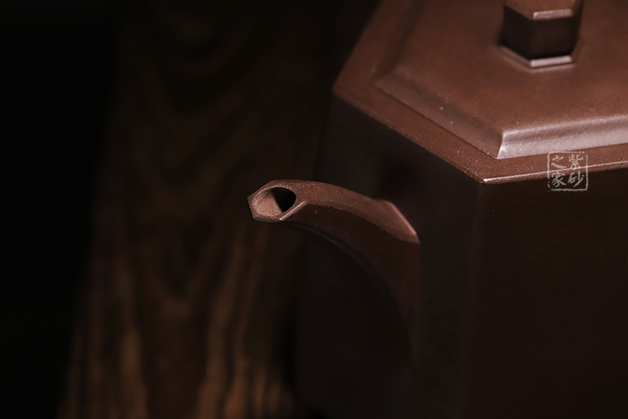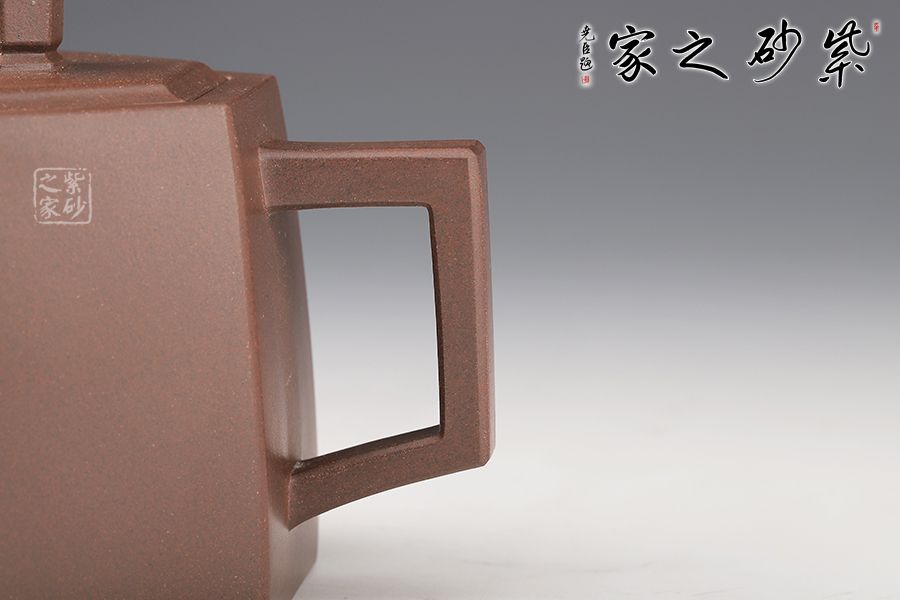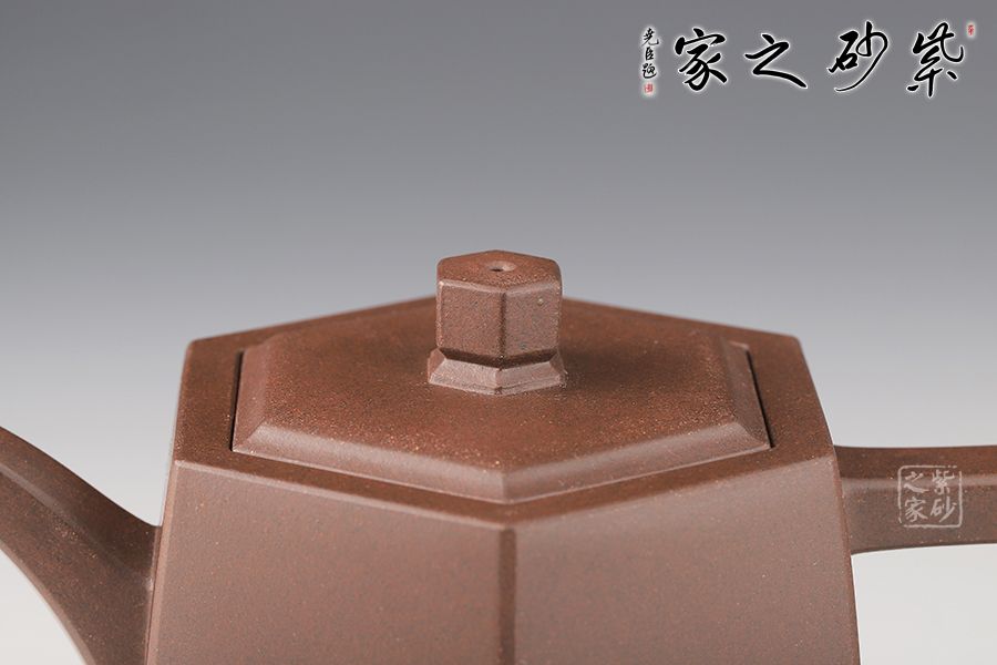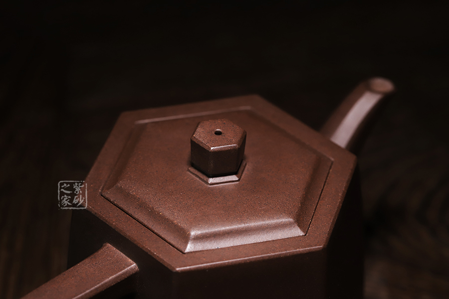 此壺在經(jīng)典漢鐸的基礎上加入了六方的型制,造型規(guī)整,壺身如鐘,氣勢浩然。平嵌蓋,與壺融為一體,柱形鈕,短直流,耳形方把,形筒古樸,整器亦樸亦雅。