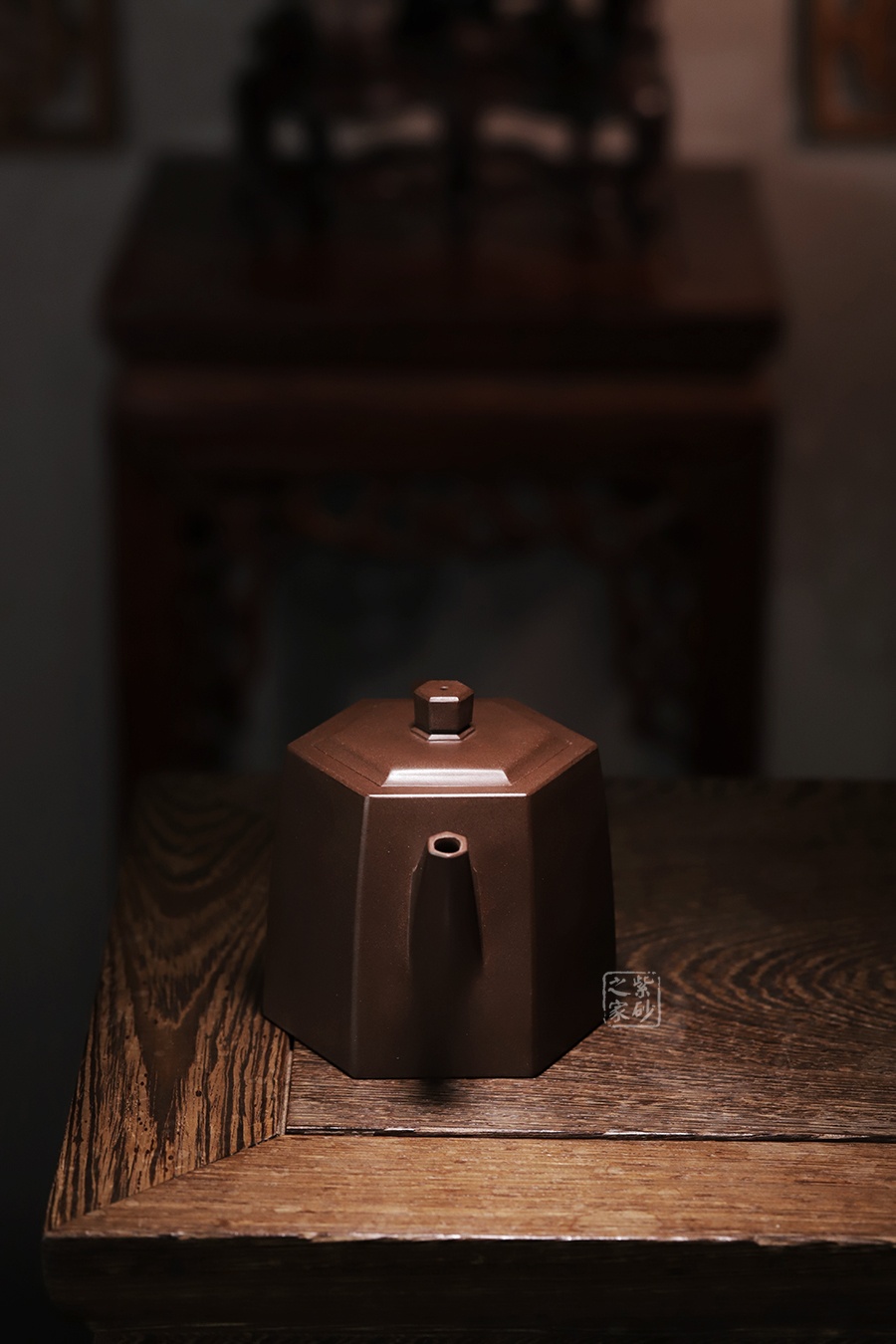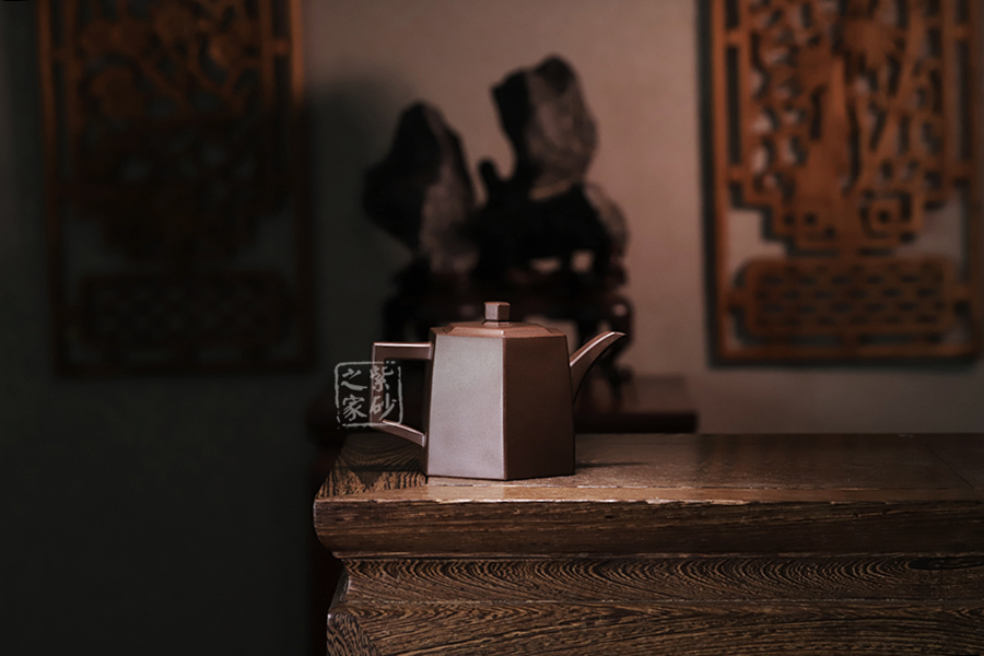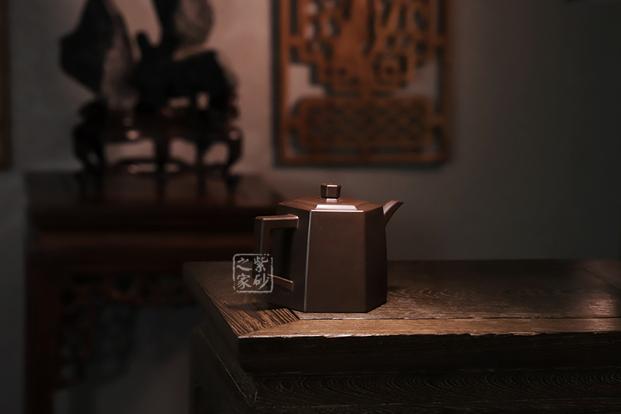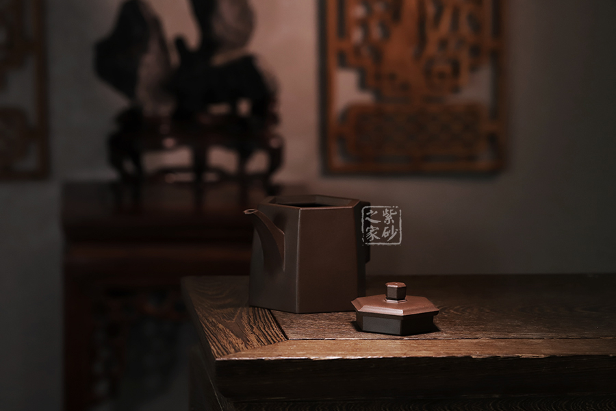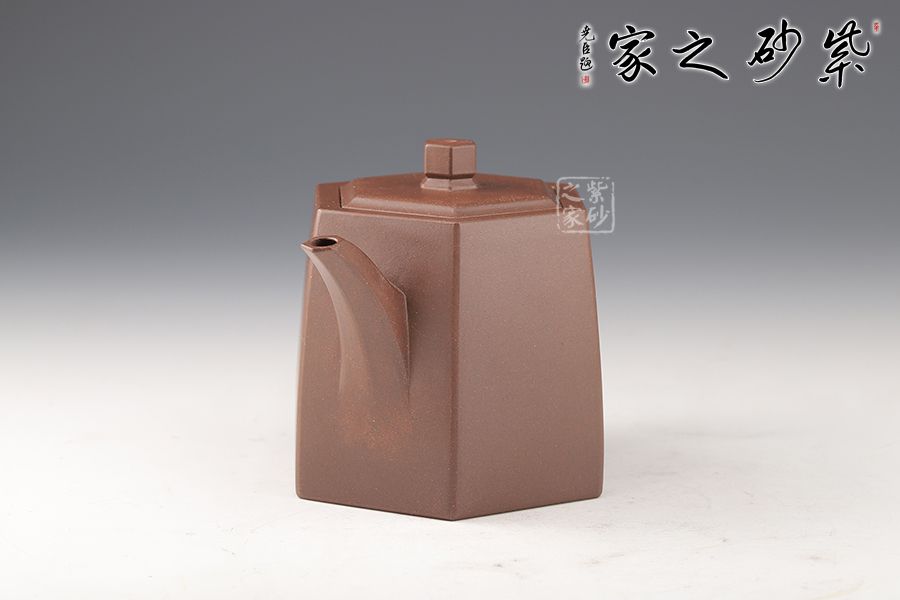 此壺在經(jīng)典漢鐸的基礎上加入了六方的型制,造型規(guī)整,壺身如鐘,氣勢浩然。平嵌蓋,與壺融為一體,柱形鈕,短直流,耳形方把,形筒古樸,整器亦樸亦雅。