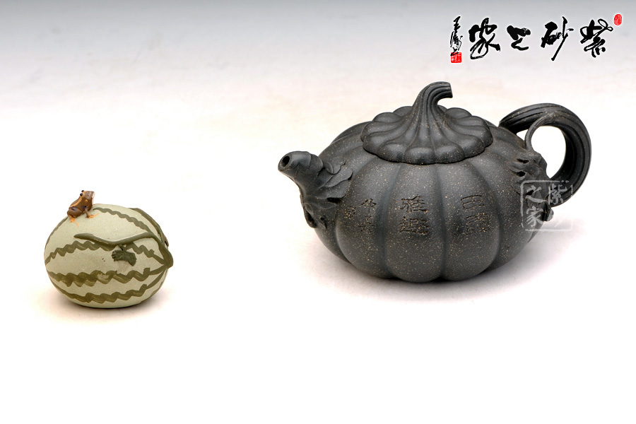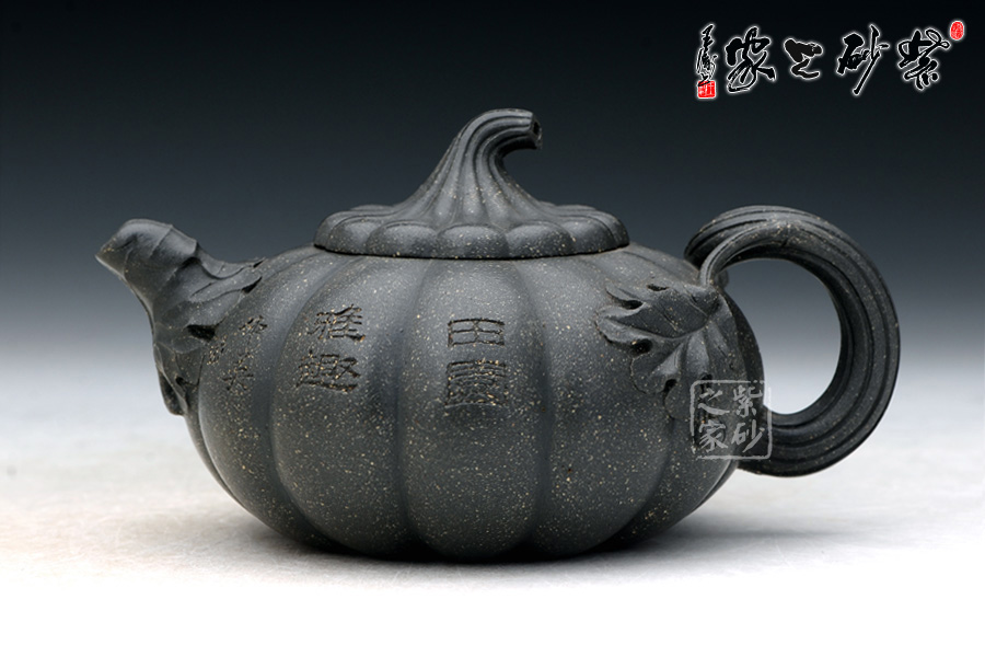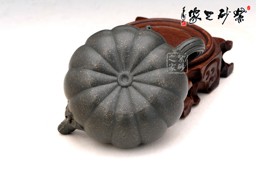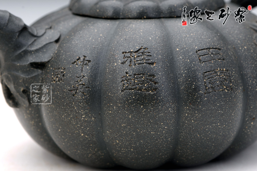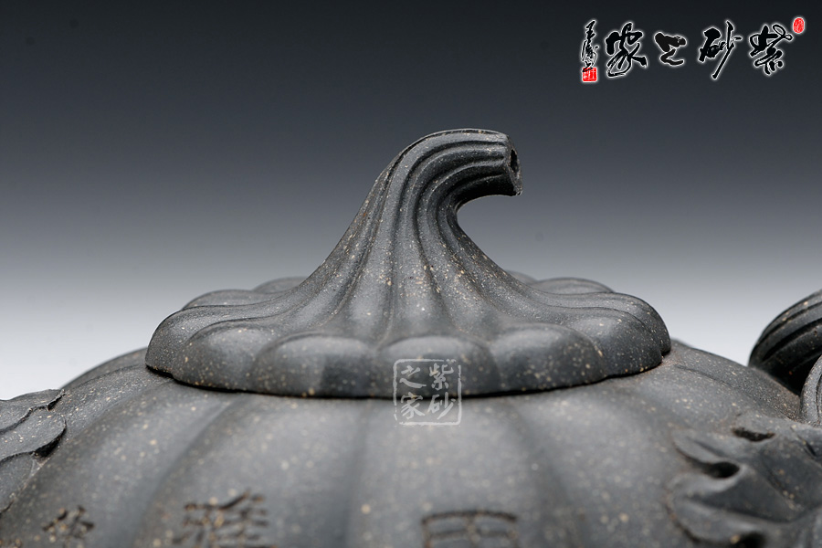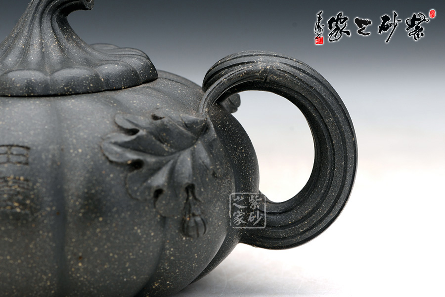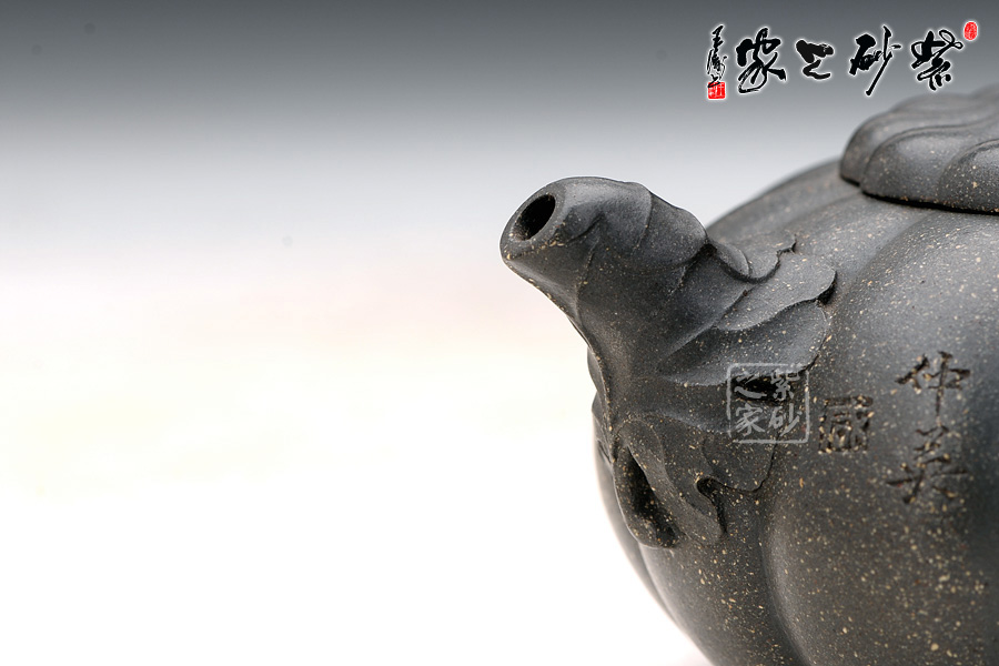 此作品所采用的泥料極為特別,是十分稀有的原礦天青泥,純泥質(zhì)為墨綠色,清理出眾,雅俗共賞,且此款作品的泥料采用了調(diào)砂的工藝手法,使其富有更為律動、渾厚的質(zhì)感;整個筋紋紋路非常明理清晰,整個壺身分為均勻的12瓣筋囊,每一瓣都飽滿均勻,壺蓋同樣是如此造型,筋囊與壺身完美相接,且一直延伸至瓜蒂形壺鈕的頂部,精工細致,絕佳之品;壺嘴一彎,以瓜葉裹之,葉片細膩,葉脈清晰可辨;壺把以瓜藤為形,條狀筋紋均勻流暢,壺把彎曲有度,一只嫩嫩的瓜葉自壺把上端胥出,貼于壺身,自然褶皺,傳神逼真;此壺通體流線型設(shè)計,干凈利落,造型能給人明快爽利的感覺,生命之律動。