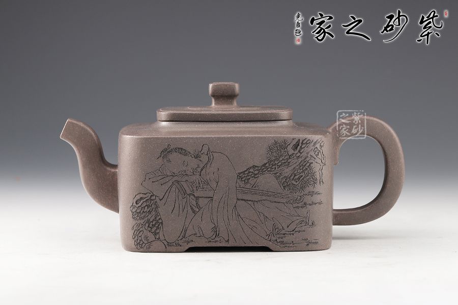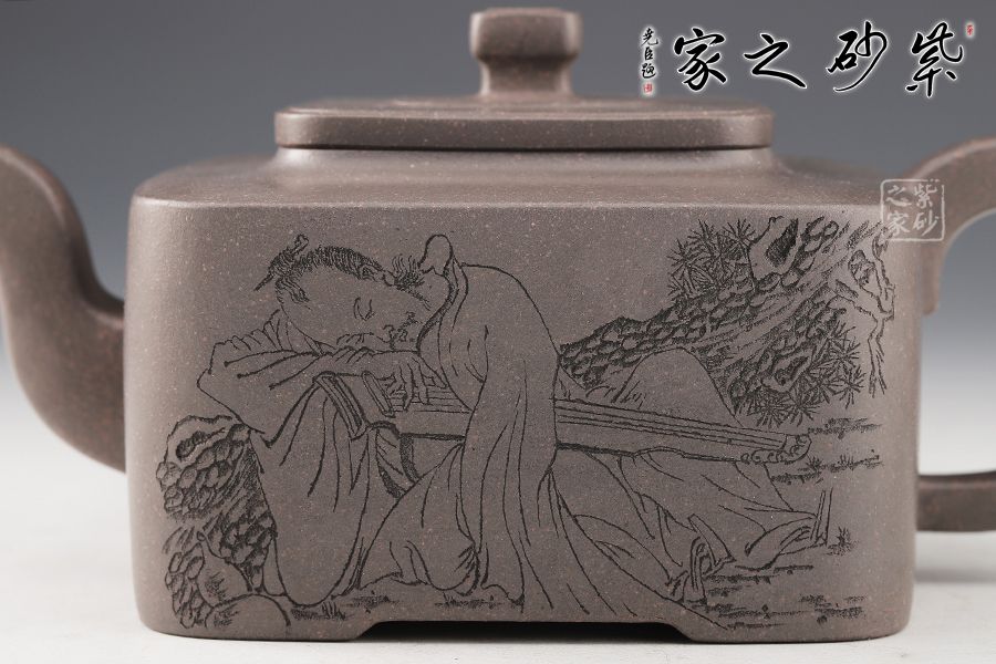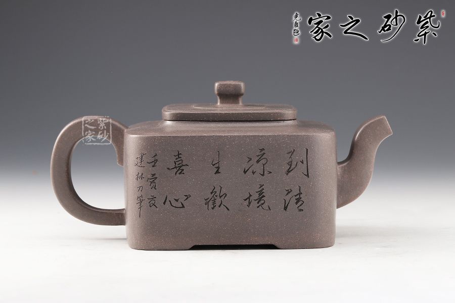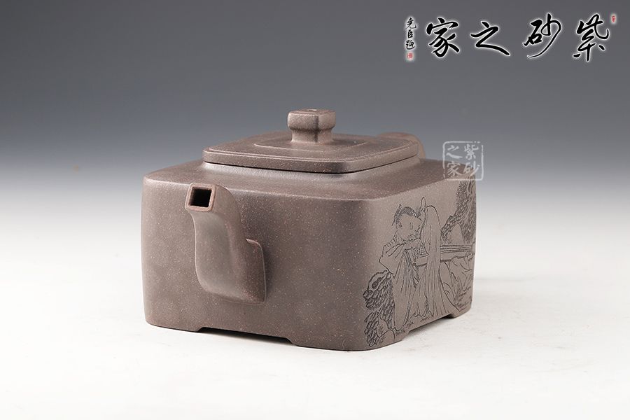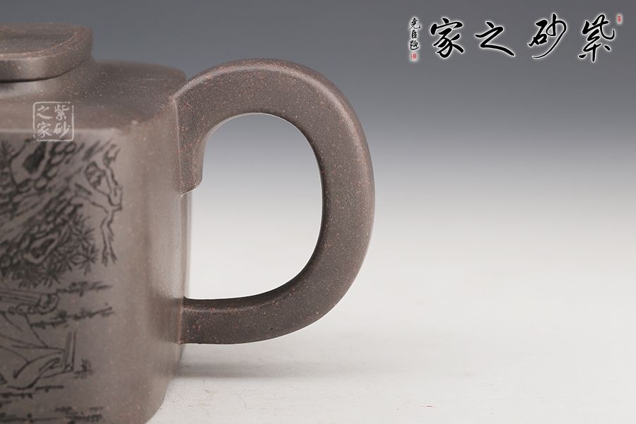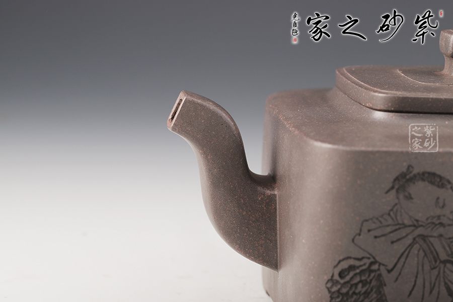 壺身比例精準(zhǔn),方而不銳,朗健柔和,韻味無(wú)窮。彎流姿態(tài)優(yōu)美,出水利落,氣密性極佳;的子拿捏適手,與壺身形神相近,上下呼應(yīng);方圓形把線條流暢,與彎流嘴右呼應(yīng)。