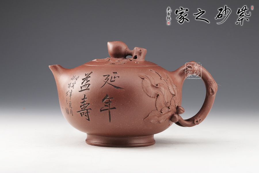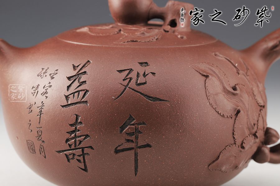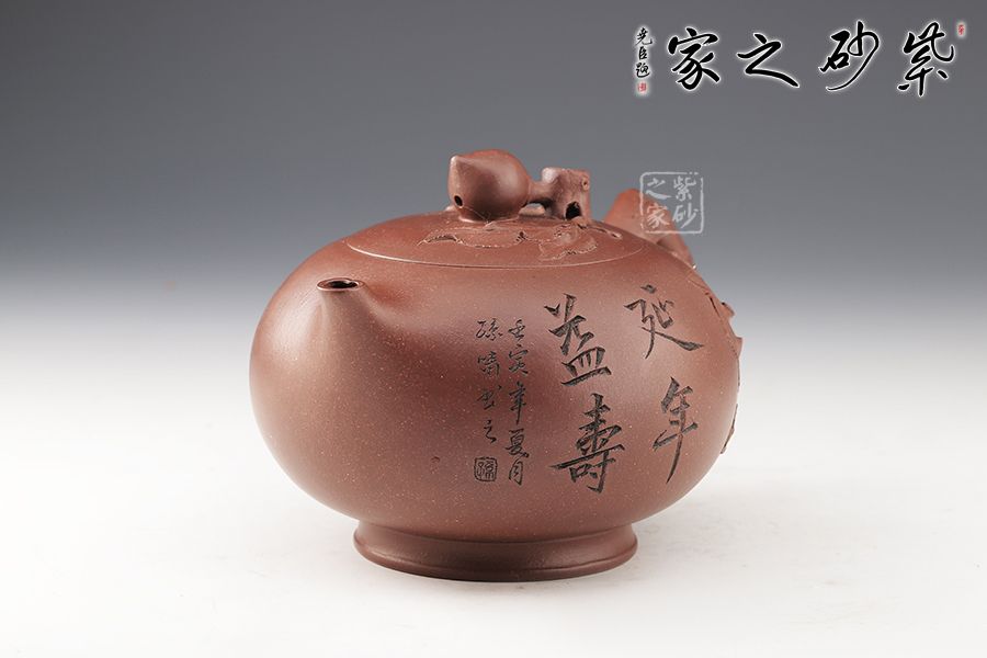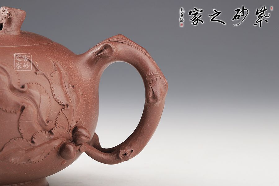 壽桃有長壽之意,老師以此為題其寓意可想而知,整器以壽桃為形敦厚樸實(shí),味重簡潔,取上等清水泥泥料,色澤紅潤飽滿,壺身處筋紋深淺有度,以蒼老有力的桃桿為把呼應(yīng)主題,壺把旁邊以桃葉貼花,有如隨風(fēng)搖曳,壺身裝飾兩只壽桃精致小巧,著實(shí)可愛之極,一只碩大的壽桃為壺鈕,逼真精致,別致有趣。