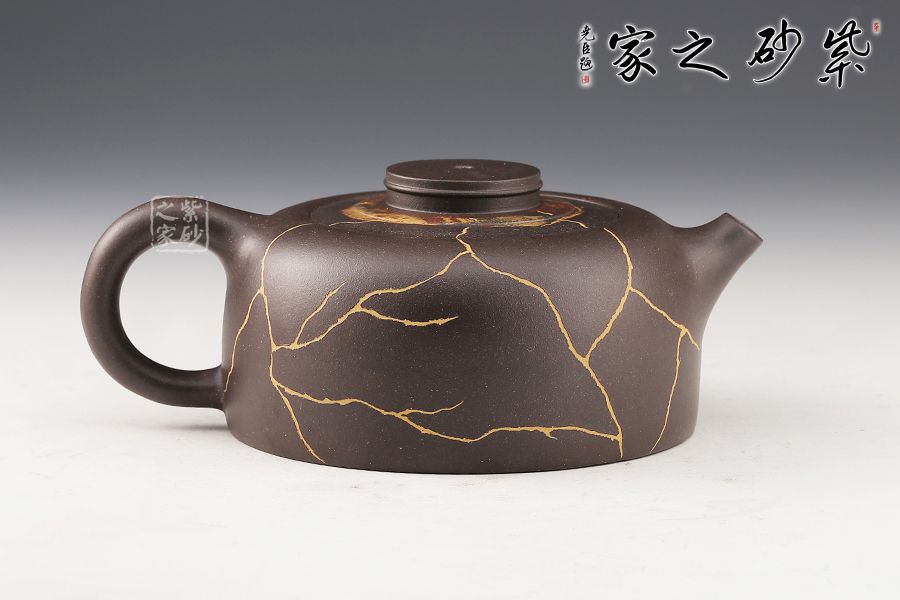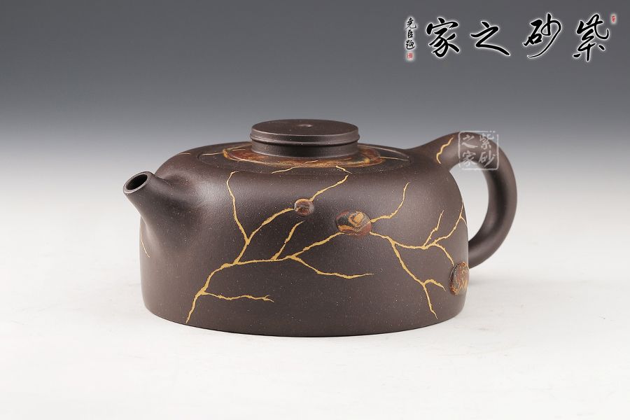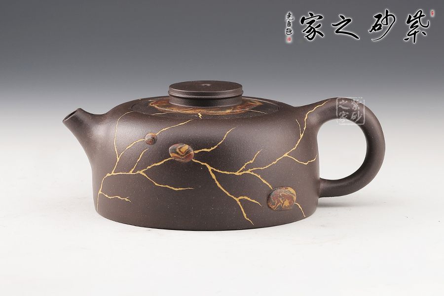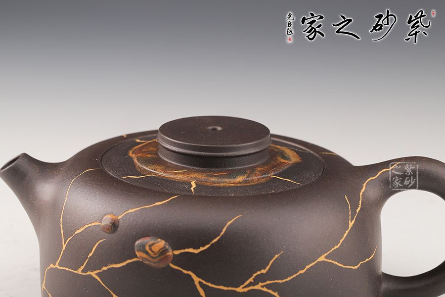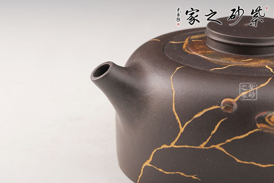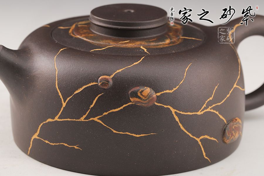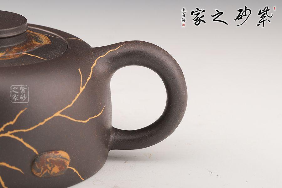 此壺制作精巧,獨具匠心,壺身渾圓鼓起,威武大氣。壺把從壺身肩部向上伸出,再巧妙收于壺腹之處,線條飄逸優(yōu)美,壺身飽滿。壺嘴、把手等輪廓線既照應(yīng)又和諧,生動自然,宛若生成。壺身以冰紋和絞泥雨花石裝飾,新穎別致,太整體來看,此壺制作繁雜但不失工整,布局嚴(yán)謹(jǐn)且做工精良,為難得的精品之作。