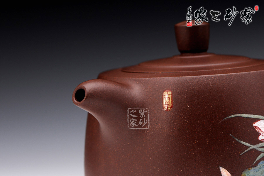 此壺采用的裝飾技法是江政凌老師極為擅長(zhǎng)的琺瑯彩裝飾手法,紫砂的古樸、厚重與陶瓷彩繪藝術(shù)的完美結(jié)合,凸顯出作品的靈巧與現(xiàn)代意蘊(yùn),彩繪藝術(shù)更加具有深厚的傳統(tǒng)文化內(nèi)涵,二者相輔相成、相得益彰,將紫砂藝術(shù)提升一個(gè)更高的藝術(shù)境界,如今紫砂加彩藝術(shù)十分新穎,在紫砂行業(yè)中脫穎而出。