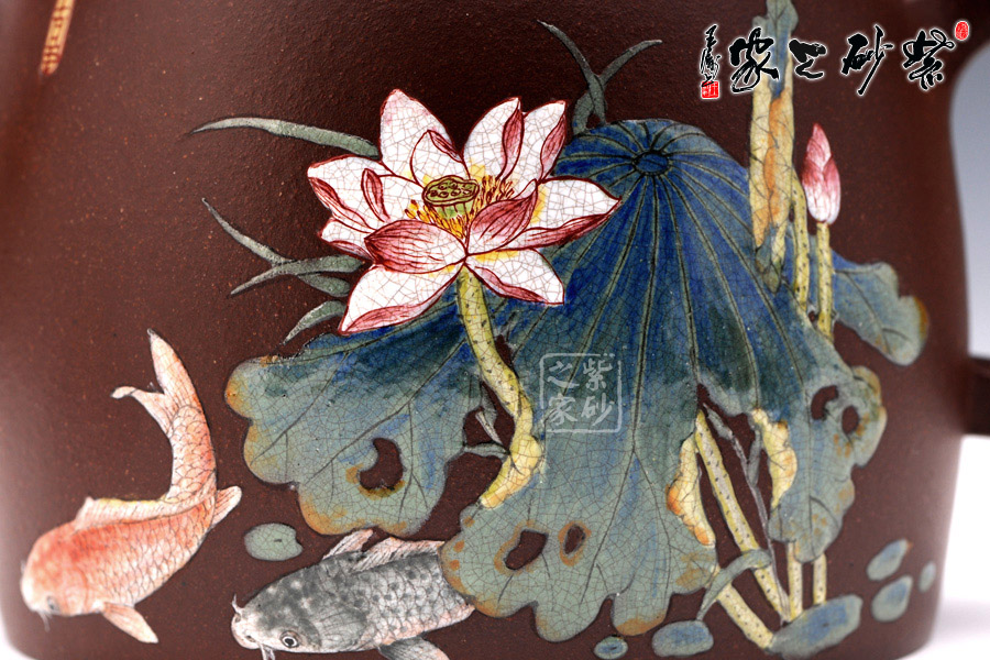 A面: 裝飾: 琺瑯彩繪 裝飾者:江政凌 裝飾內(nèi)容: 壺身正面所繪的是“連年有余”圖,一株殘荷風(fēng)韻更甚,一朵荷花清雅地盛開(kāi)著,花間嫩嫩的蓮蓬和花蕊透著馨香,荷葉底下一青一紅兩條鯉魚(yú)自在地游著,魚(yú)兒十分肥碩,活靈活現(xiàn),栩栩如生,連年有余的寓意十分吉祥