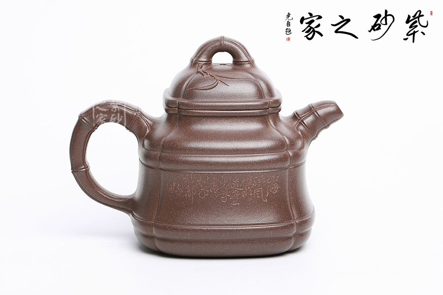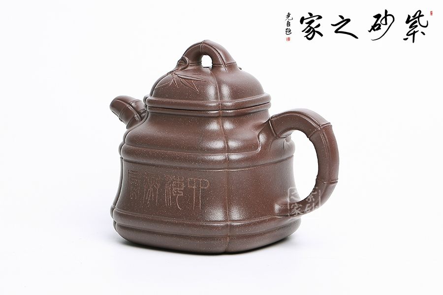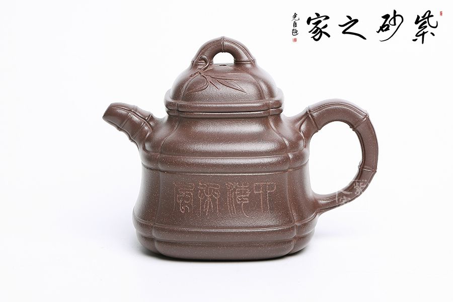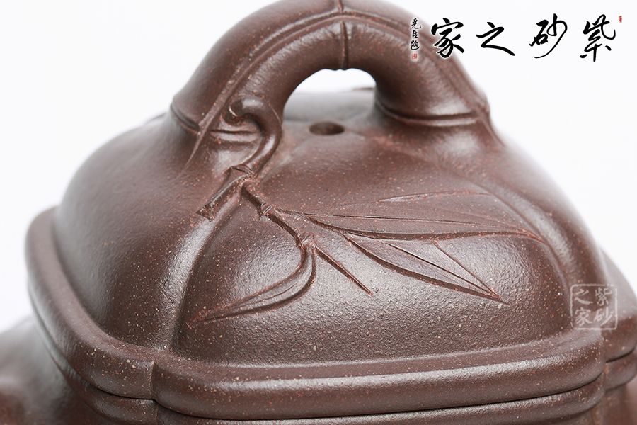 整壺以竹為主題,將本是圓筒形的竹的形象進(jìn)行大膽的夸張藝術(shù)化地處理成方筒形。