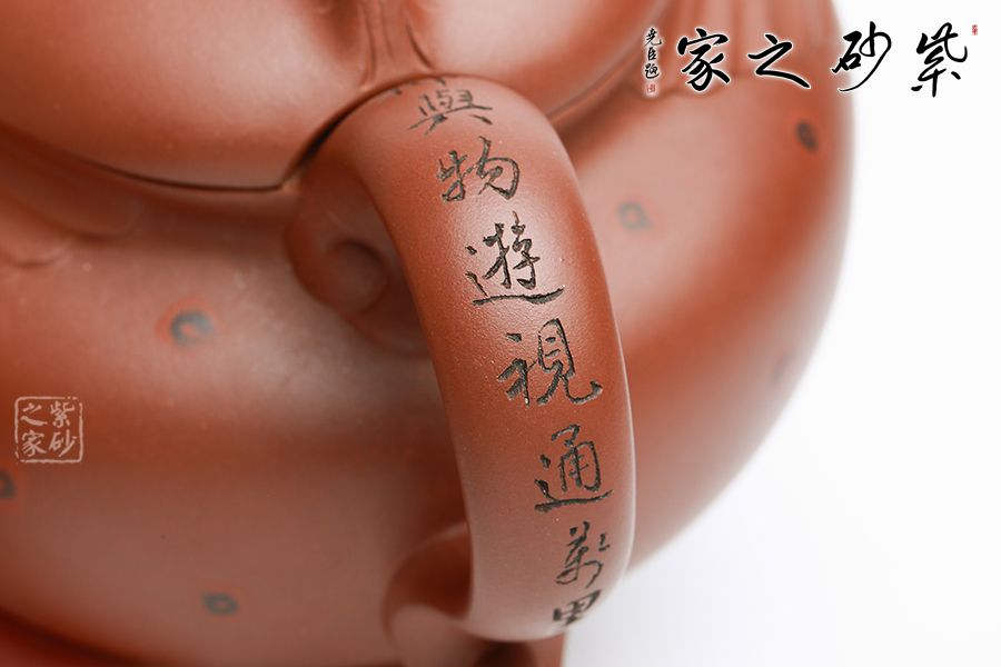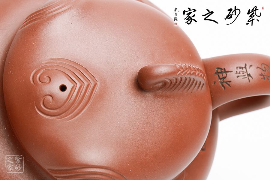 壺以豹頭為型,又融合了豹身上的其他元素。壺蓋與壺銜接處,以幾條環(huán)紋繪出豹眼,蓋前微凸,正是那豹頭眉骨。壺身上斑紋點(diǎn)點(diǎn),是為豹子臉。斑紋上并列幾條橫紋,是為豹胡須。壺嘴微彎,是豹子圓鼻。壺把高揚(yáng),至底部卷曲,是豹尾。整把壺融入豹子全身上下,又顯得威風(fēng)凜凜,靜中有動(dòng)。