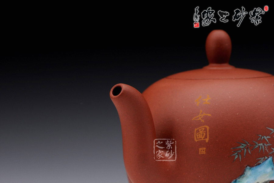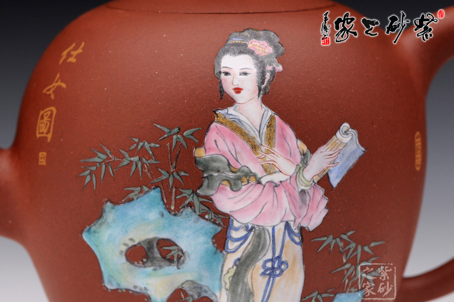 此壺采用的裝飾技法是江政凌老師極為擅長的琺瑯彩裝飾手法,紫砂的古樸、厚重與陶瓷彩繪藝術的完美結合,凸顯出作品的靈巧與現(xiàn)代意蘊,彩繪藝術更加具有深厚的傳統(tǒng)文化內(nèi)涵,二者相輔相成、相得益彰,將紫砂藝術提升一個更高的藝術境界,如今紫砂加彩藝術十分新穎,在紫砂行業(yè)中脫穎而出;壺身正面所繪的是一幅“仕女圖”,圖中一名女子美艷脫俗,發(fā)髻高挽,薄紗飄飄,體態(tài)婀娜,顧盼生姿,手捧一卷古書,在竹林間踱步品讀。