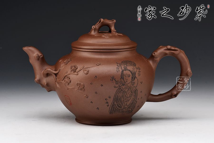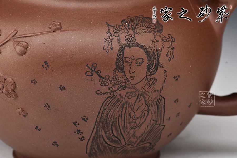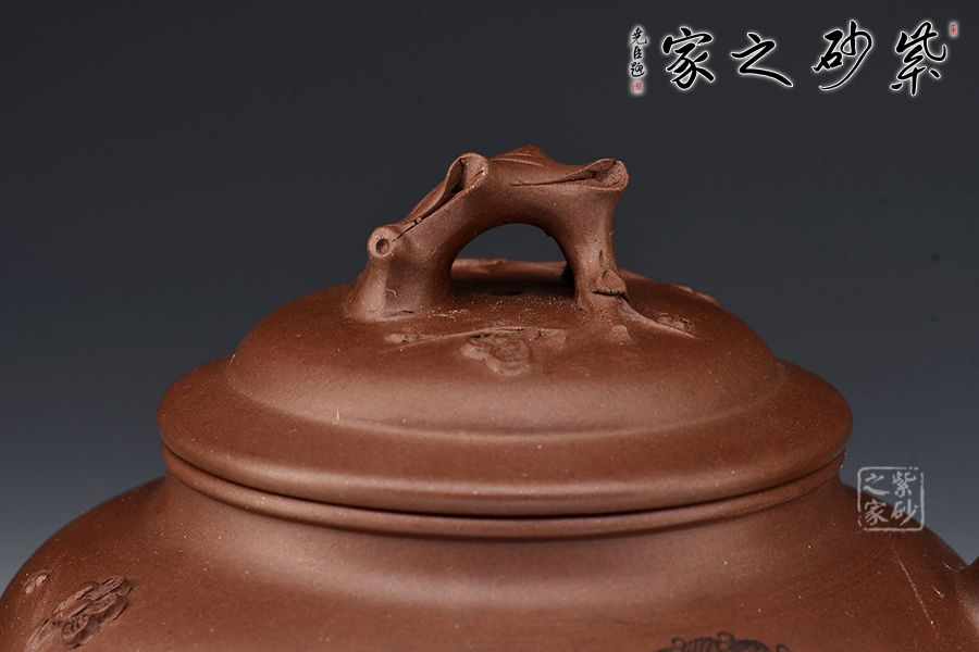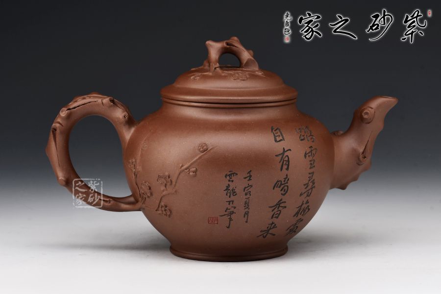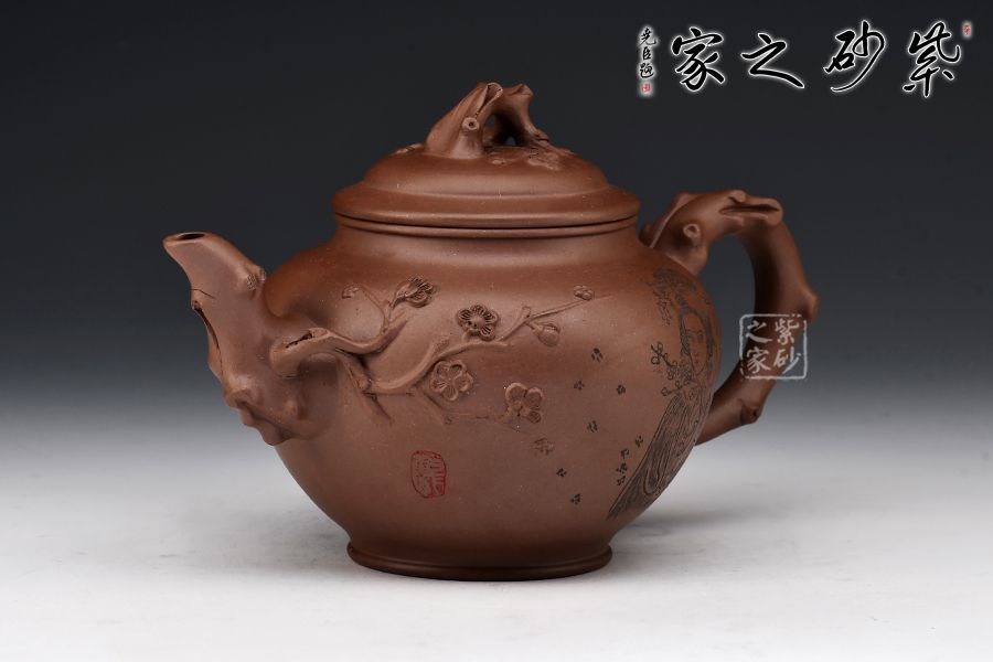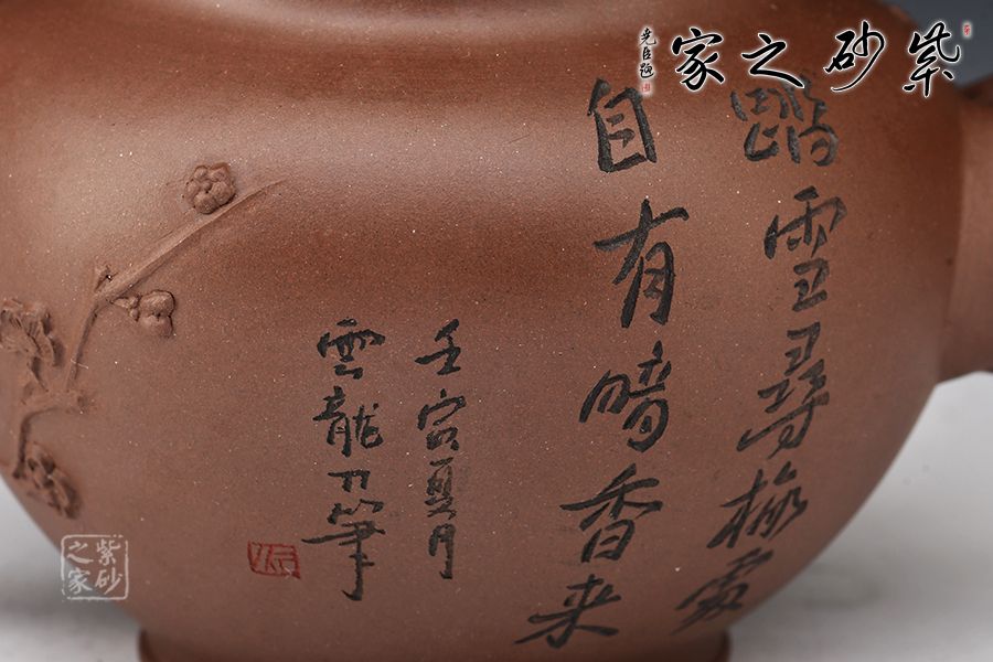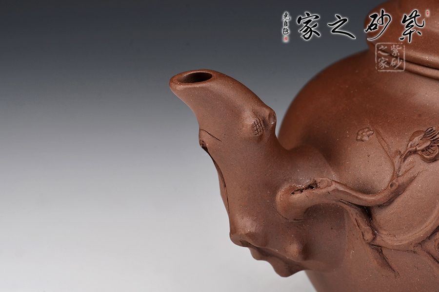 造型以笑櫻壺為基礎(chǔ),以梅入題,壺腹圓潤飽滿,橋鈕、彎流、耳把如梅枝自然胥出,蜿蜒而行,塑就優(yōu)雅姿態(tài)。蓋面、壺面貼塑裝飾精巧,梅花朵朵綻放,生機(jī)盎然。整器比例敲到好處,線條流暢柔和,好料精工,氣韻充沛,賞用皆宜。