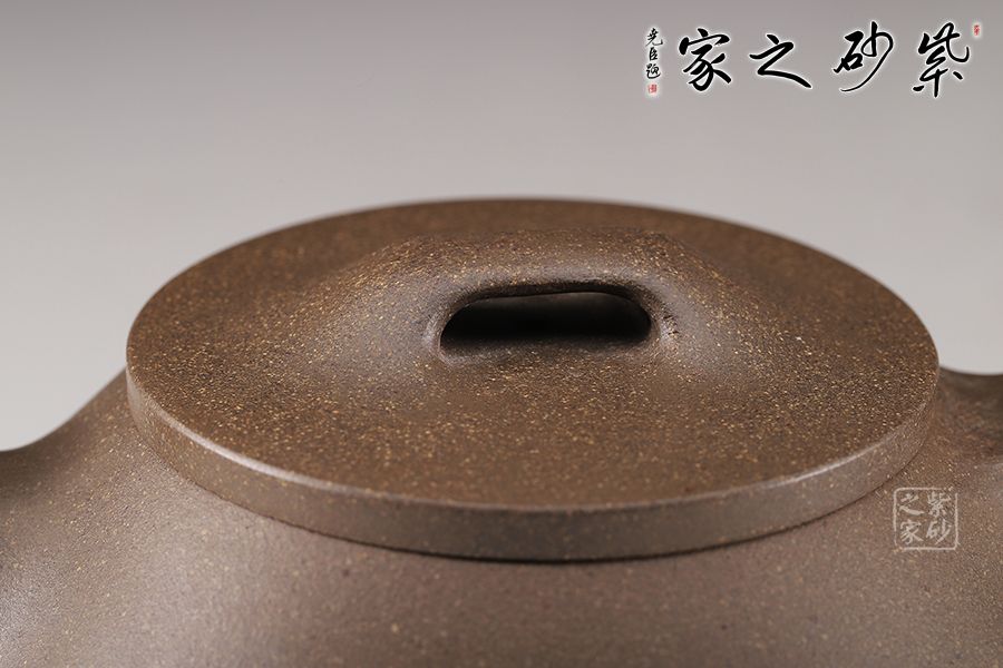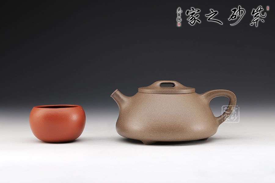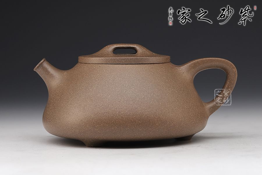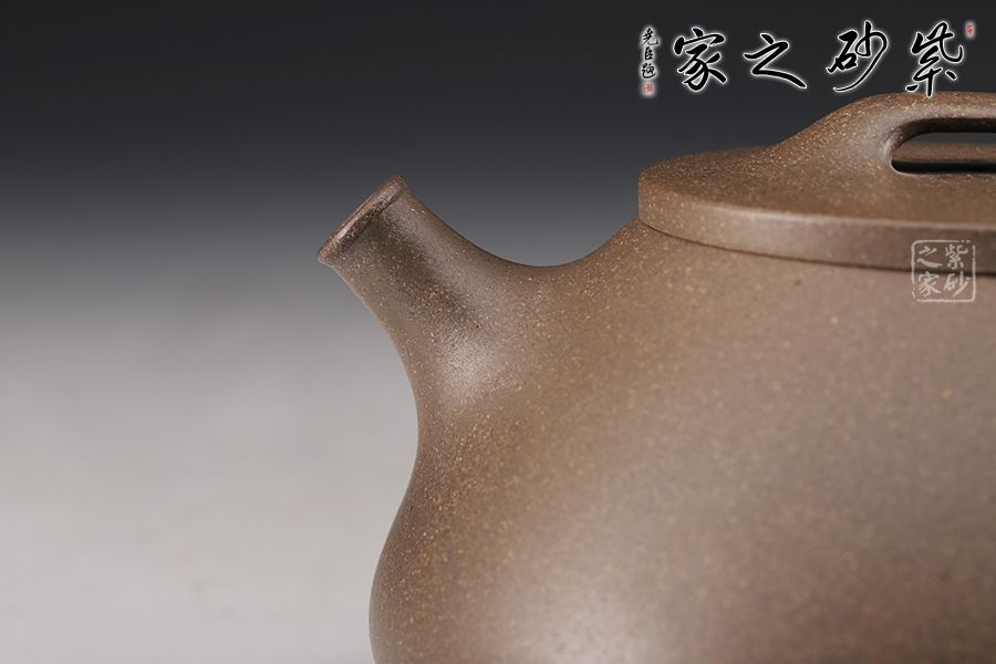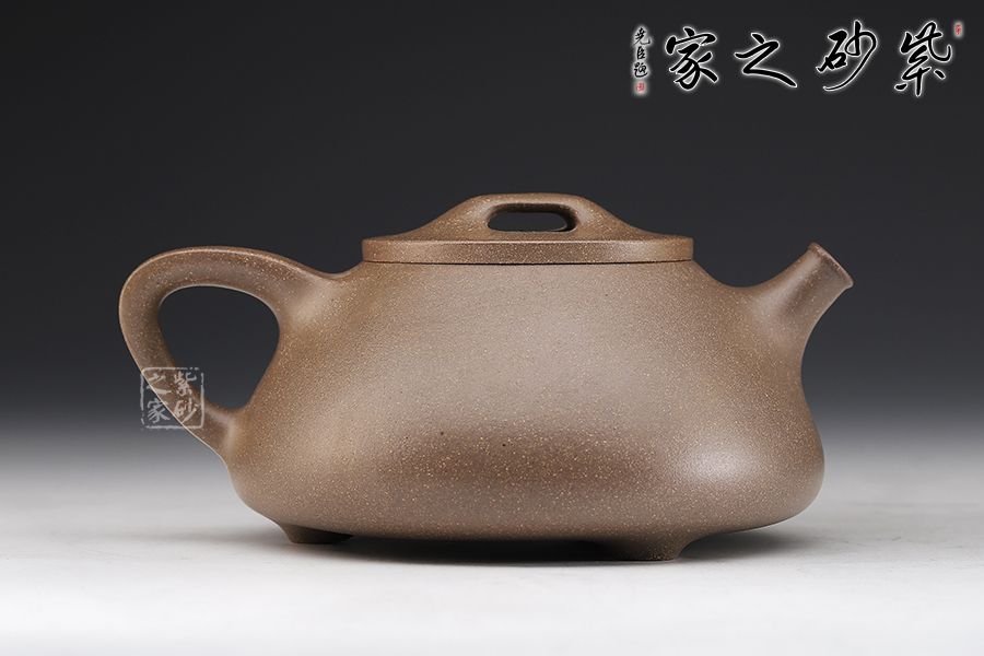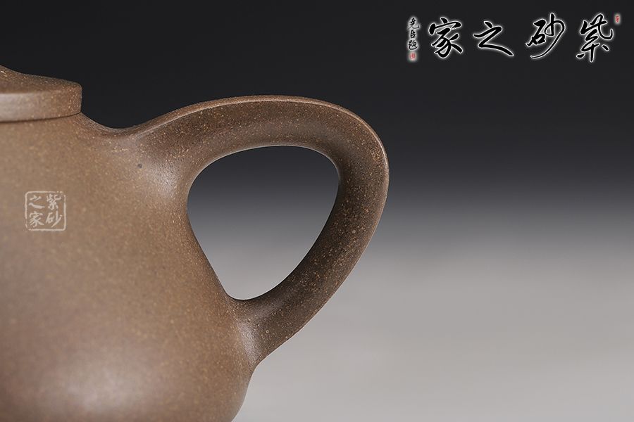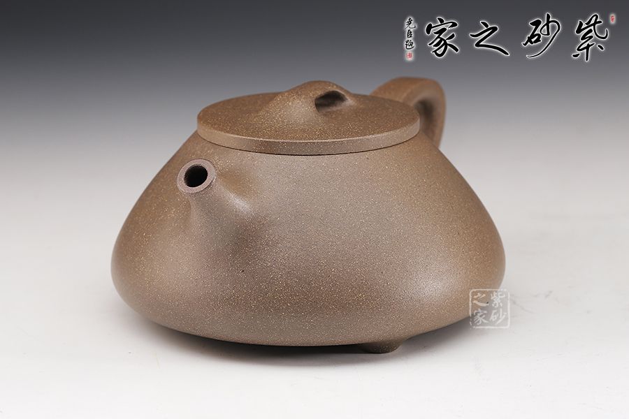 此款石瓢壺造型簡練,敦厚調(diào)和,壺身圓潤,線條柔和, 壺嘴為修長的直流嘴,暗接手法與壺身相連,倒三角壺把同樣采用暗接手法與壺身相連,而壺嘴與壺身兩者遙相對望,相對稱。壺鈕為橋型平鈕,銜與壺口平蓋之上。愛壺者如果再仔細看,可看出整個壺型呈由兩個等腰三角形結(jié)合而成,首先壺身是大三角,而壺把內(nèi)是小三角,相當穩(wěn)重的三角形再加上三乳足鼎立,整個器型便更加穩(wěn)實。