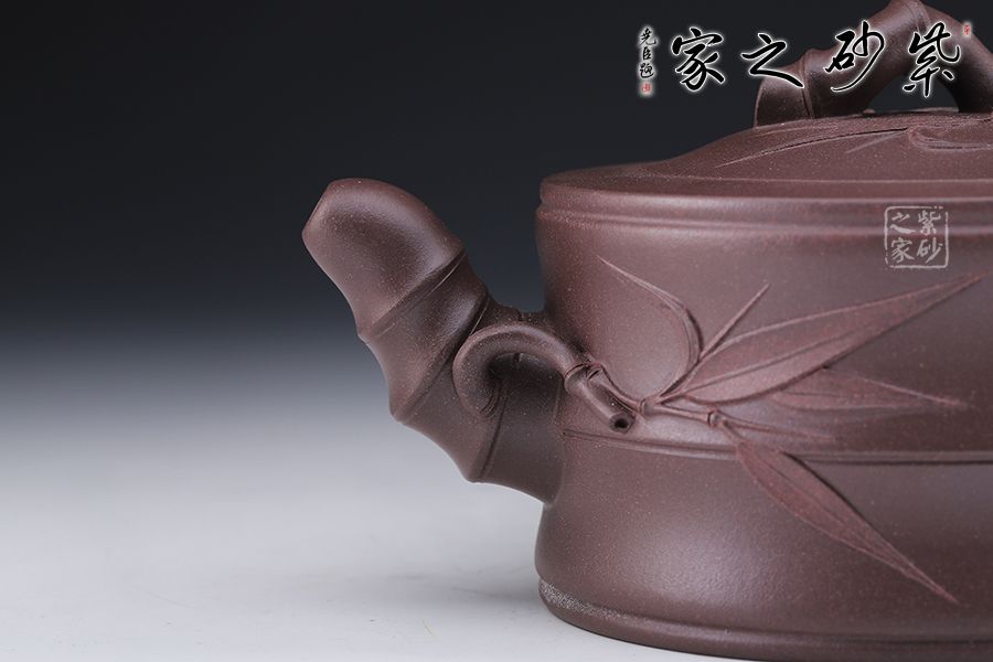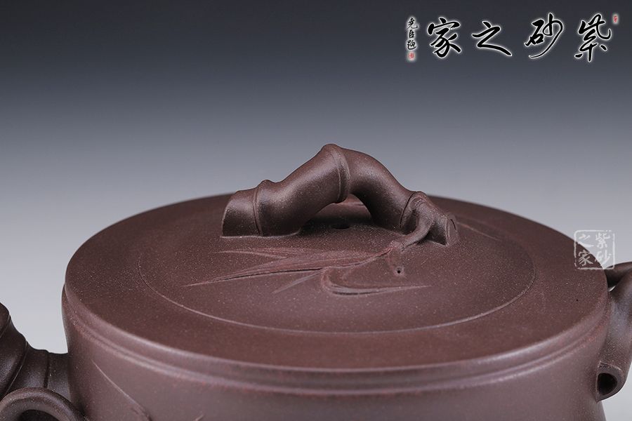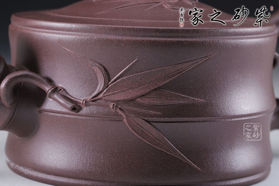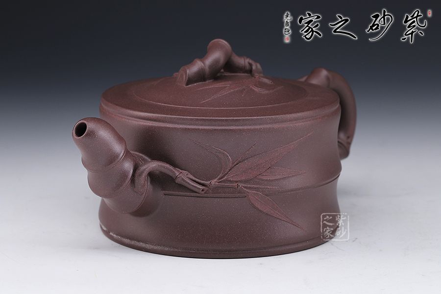 此壺壺體為一節(jié)竹段,身直桶圓,顯得從容優(yōu)雅。壺身竹枝裝飾大氣而不失端莊,給整壺增添了一種特有的氣質(zhì)。嵌蓋與壺口融為一體,以竹節(jié)為嘴、把,彎曲有力。蓋鈕為一節(jié)竹節(jié)扭曲而成,透露出飄逸清新的氣息。