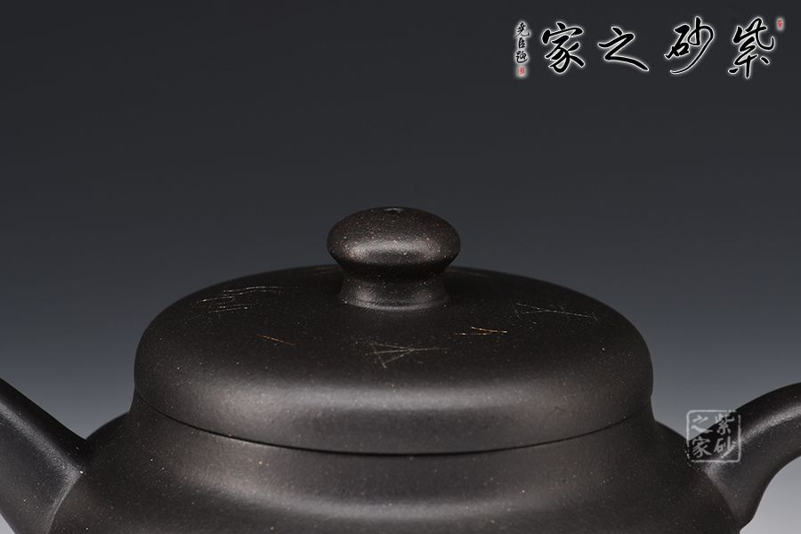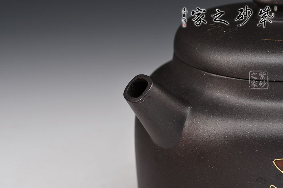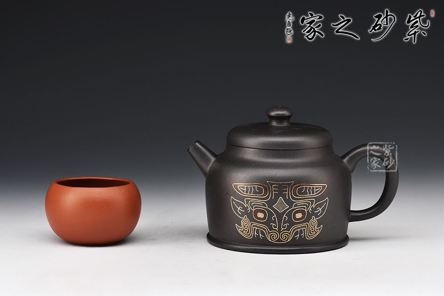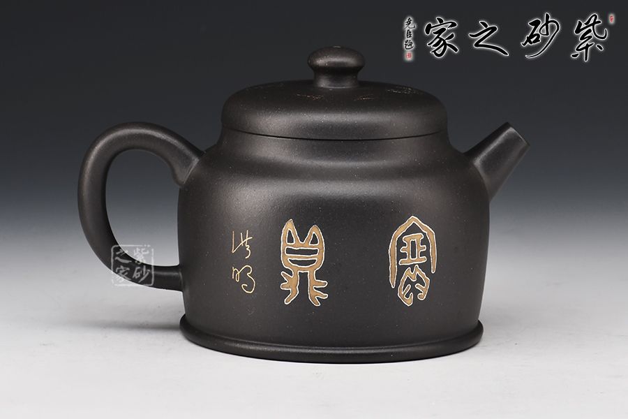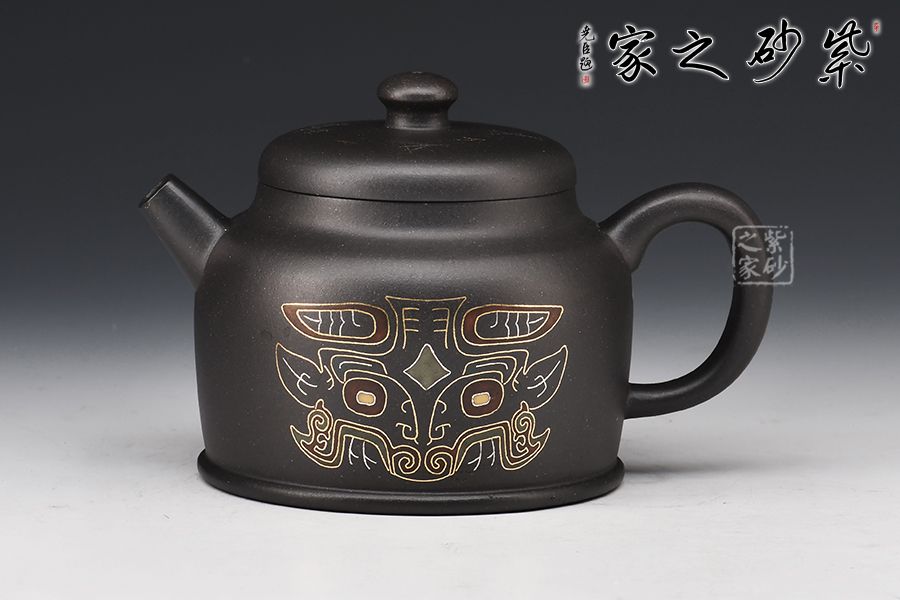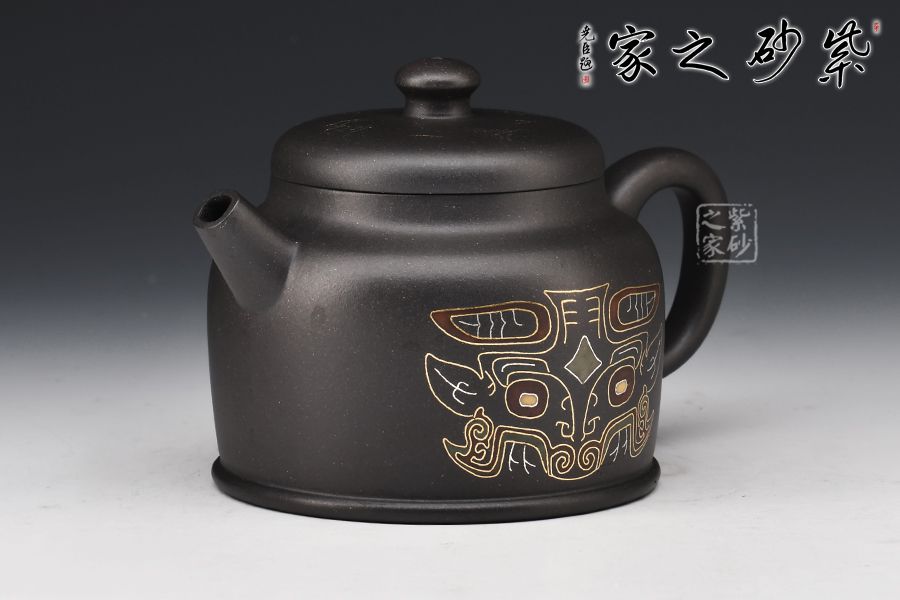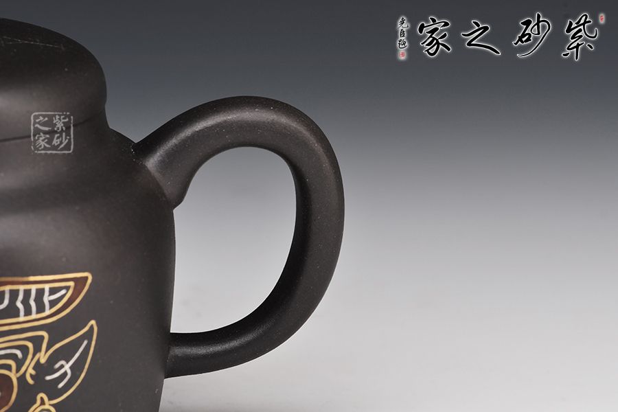 寶鼎壺的總體設計以圓為本,方圓結合,形其鼎,蓄其道,意念無窮,一種豪邁的氣概躍然壺上。整器線條風格多變,別具風味。壺嘴把采用方形結構,直筒方嘴、出水順暢有力,耳把方中見圓,用拿適宜,與壺嘴照應得較為自然。壺低自帶外圈,益顯穩(wěn)定泰然之感,腹部裝飾秦漢時期之圖騰,此乃點睛之處,后面篆書寶鼎,名副其實!