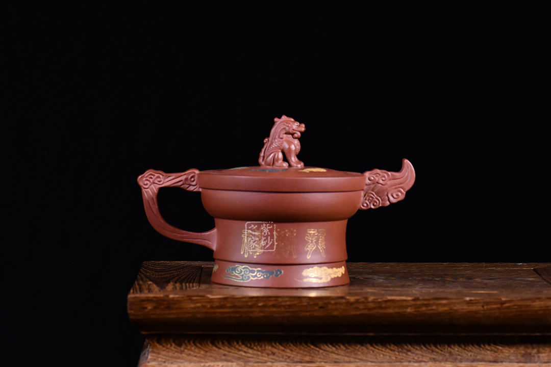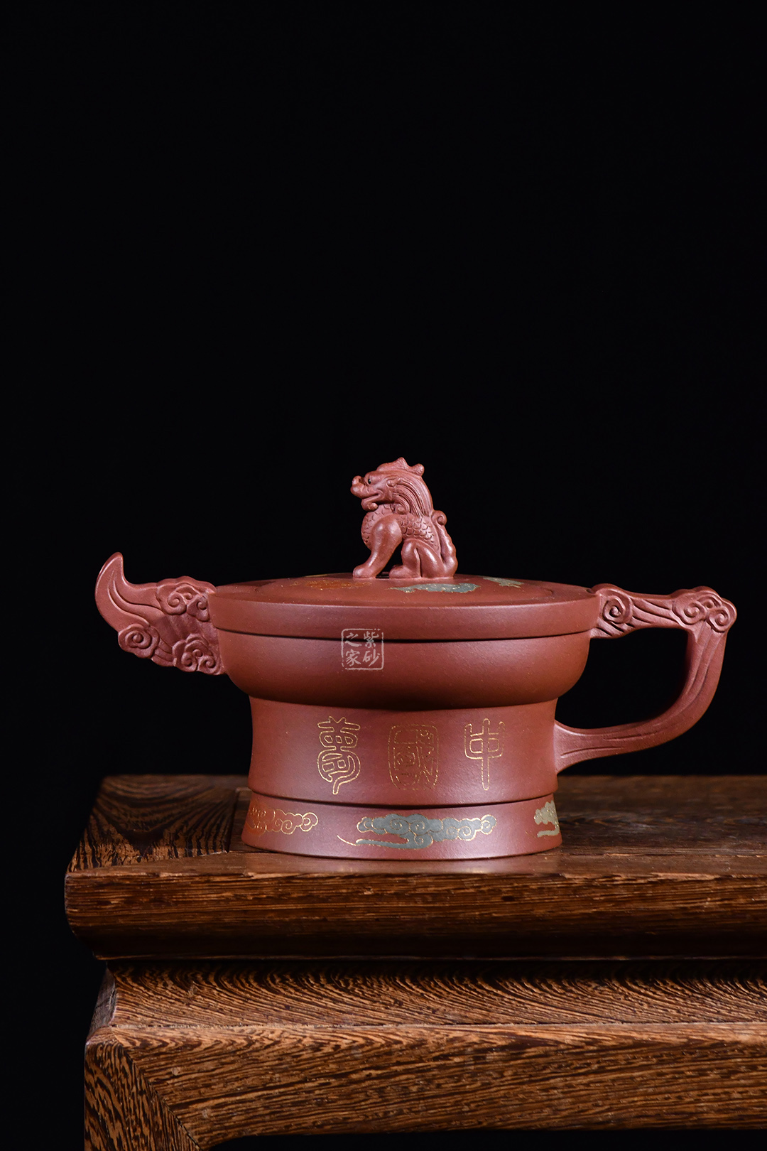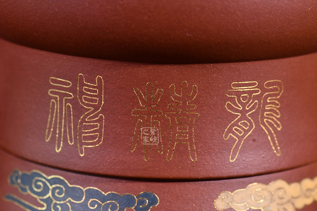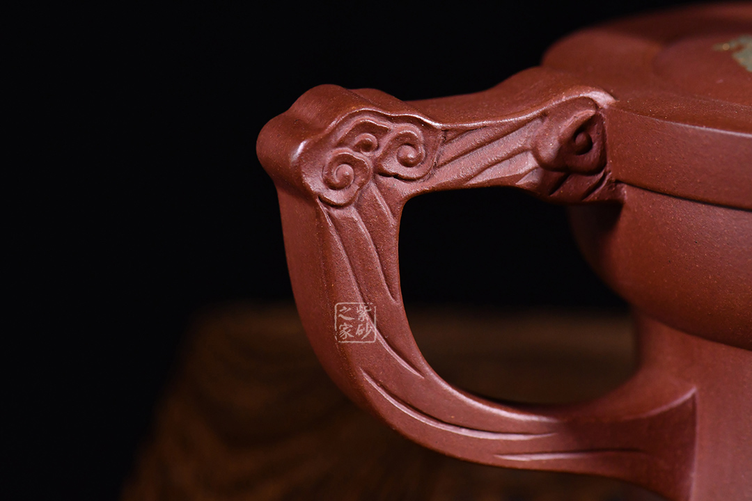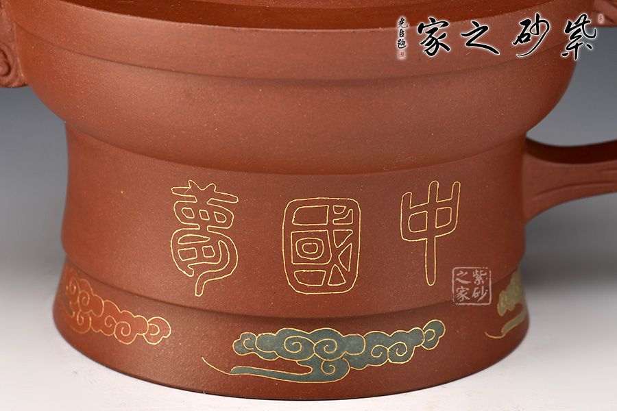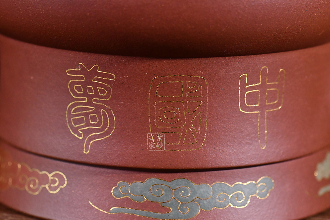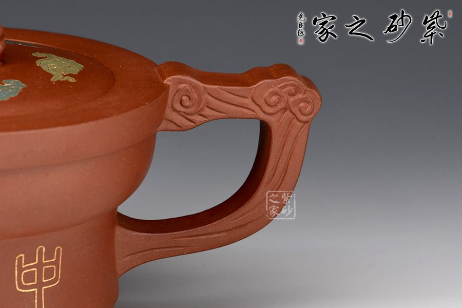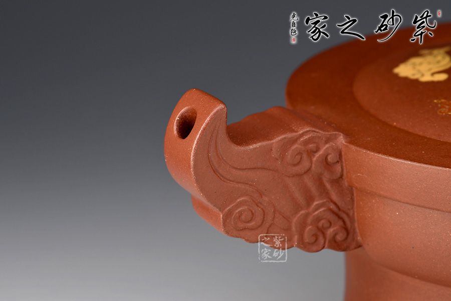 壺蓋大平,以鑲金祥云為飾,使得整把壺莊嚴(yán)肅穆外又添祥和之意。壺嘴似浪花,又似檐牙高啄,與壺把相呼應(yīng),見證著歷史的演變。