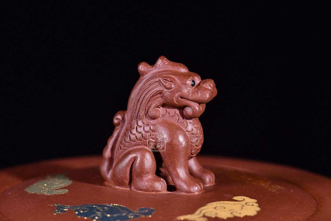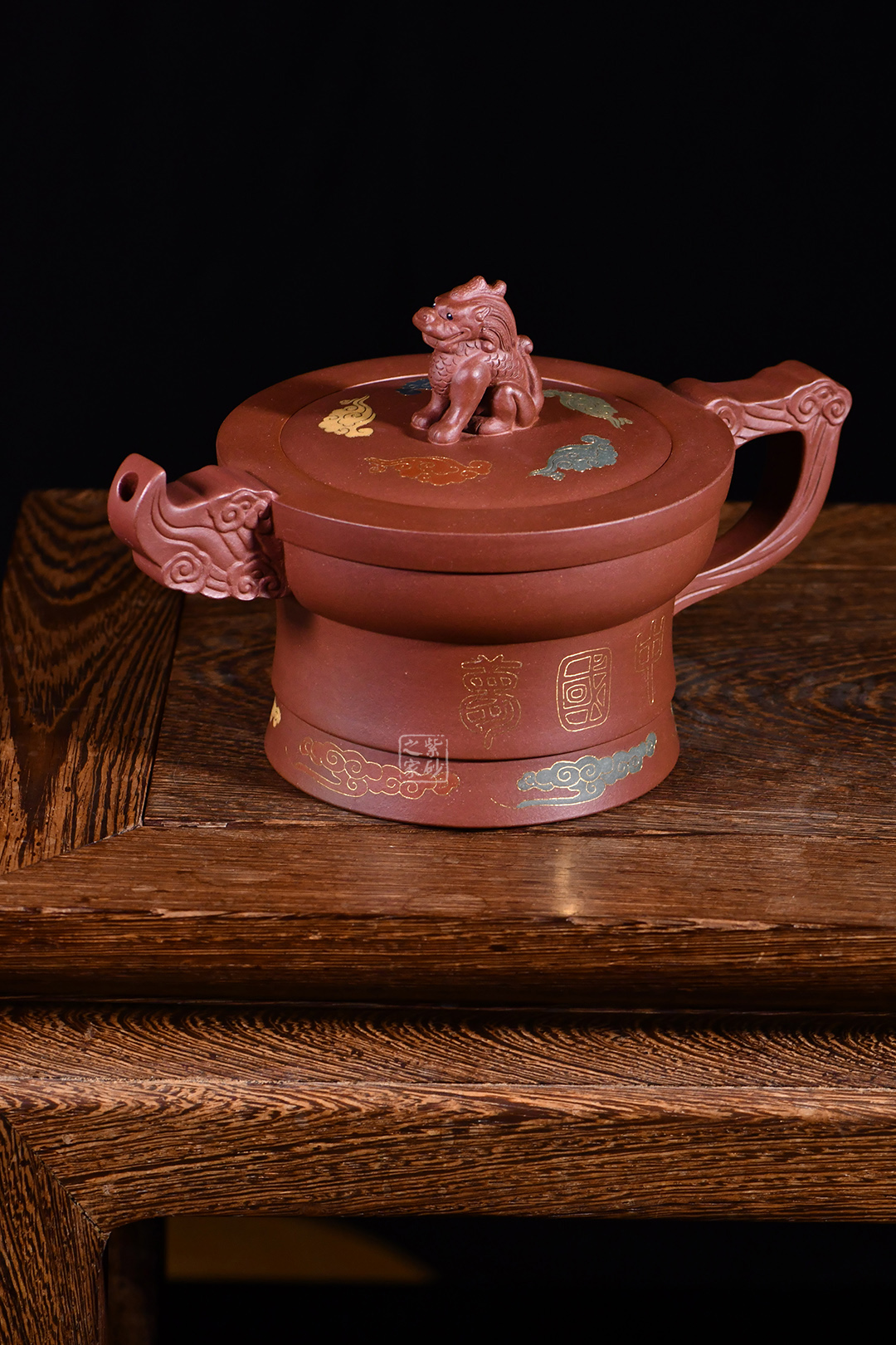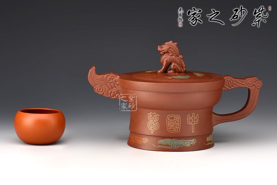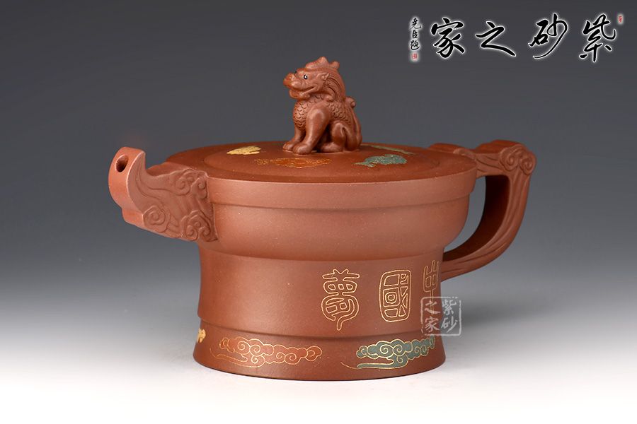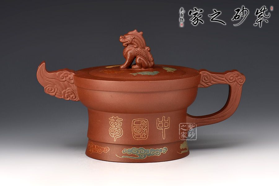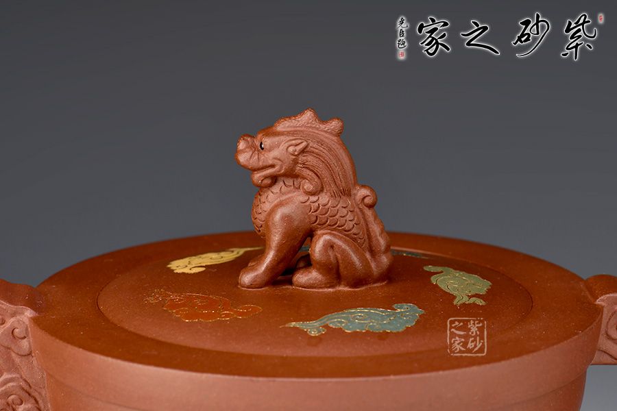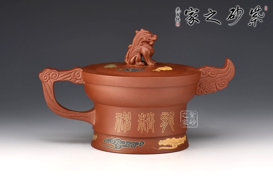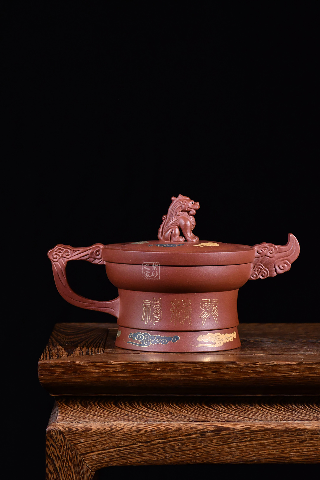 壺蓋大平,以鑲金祥云為飾,使得整把壺莊嚴(yán)肅穆外又添祥和之意。壺嘴似浪花,又似檐牙高啄,與壺把相呼應(yīng),見證著歷史的演變。