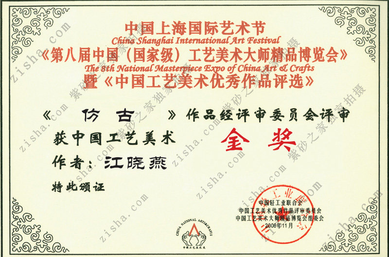 2006年11月,在第五屆工藝美術(shù)大師精品展中《京韻壺》榮獲國(guó)家級(jí)工藝美術(shù)傳統(tǒng)藝術(shù)金獎(jiǎng)。