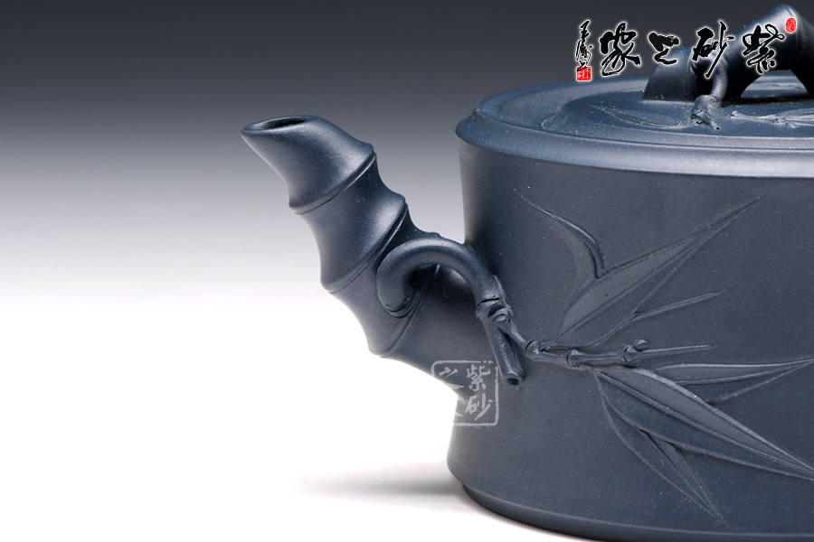 該壺采用罕見的民國(guó)綠泥制作而成,泥料顯得尤為可貴,肌理潤(rùn)澤,砂質(zhì)細(xì)膩溫和,壺體為一節(jié)竹段,身直桶圓,顯得比較從容;壺身的竹枝裝飾大氣而不失端莊,給整個(gè)壺增添了一種特有的氣質(zhì);嵌蓋完全嵌入壺口內(nèi),與壺口融為一體,接口光滑,壺口稍微內(nèi)陷,將壺蓋完全包于其內(nèi),以竹節(jié)為壺嘴,壺把,彎曲有力有趣;壺身與壺把連接處巧妙地用竹枝,竹葉做裝飾;蓋鈕為一節(jié)竹節(jié)扭曲而成,組配得當(dāng),透露出飄逸,清新的氣息;整個(gè)壺體由不同弧度的曲線組成,壺蓋、流、把手等各部位比例協(xié)調(diào),整體感強(qiáng),表現(xiàn)出制壺技藝的嚴(yán)謹(jǐn),達(dá)到圓潤(rùn)、凝重而又清閑的藝術(shù)效果。