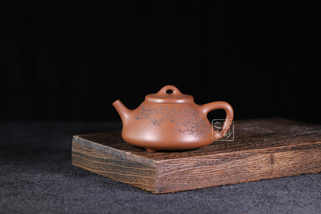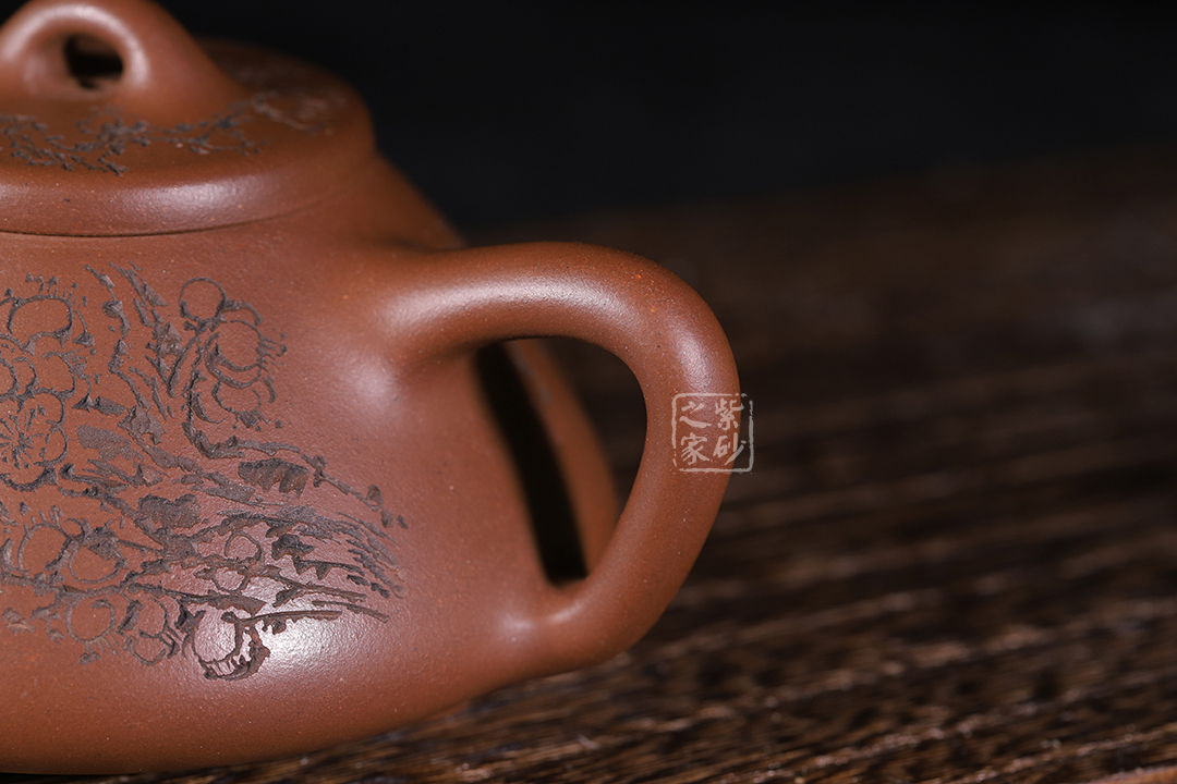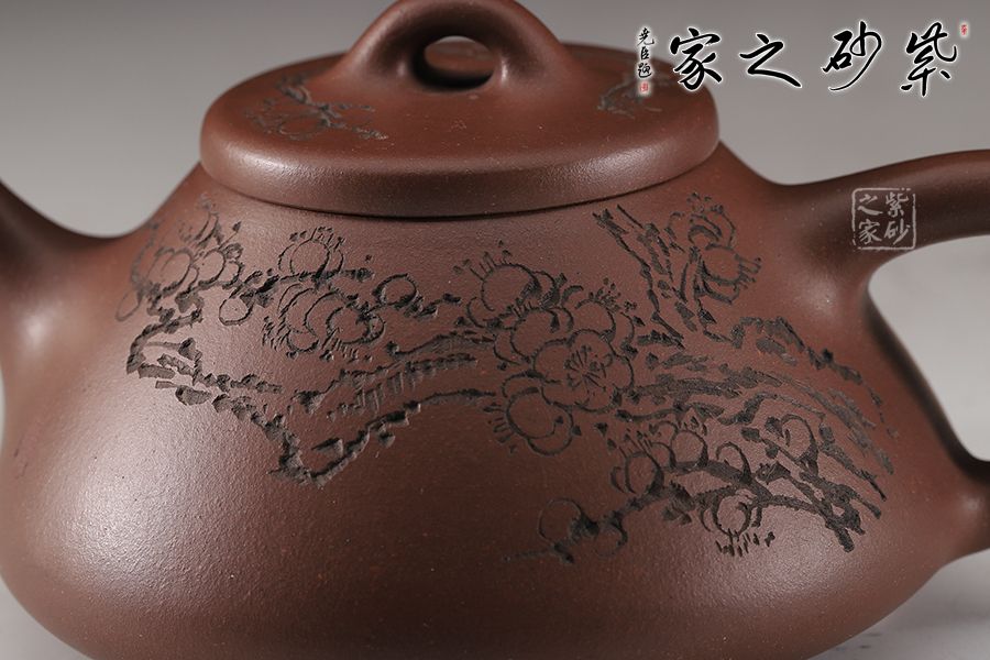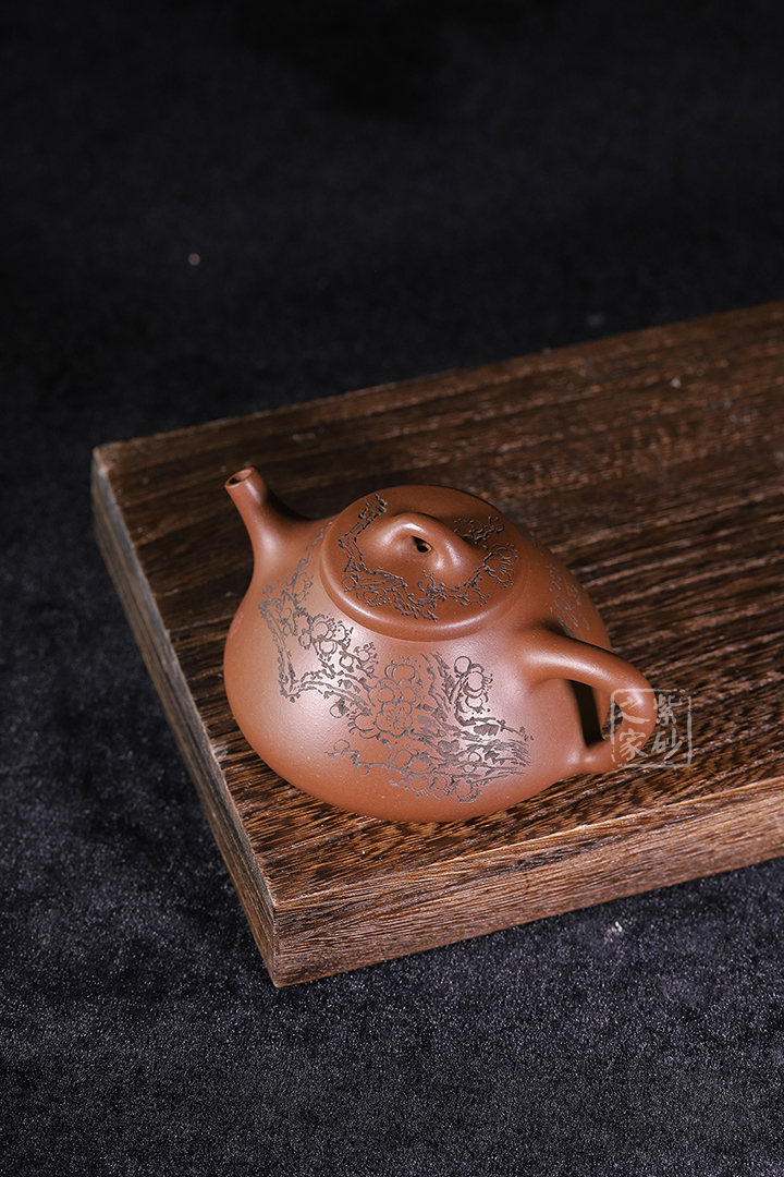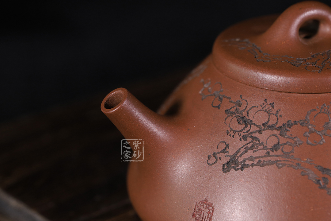 整體造型簡約大方,壺身呈金字塔形,壓蓋之上以橋鈕裝飾,直流簡而有力,出水順暢,壺把呈倒三角勢,與壺身之型互補(bǔ)。壺身雙面陶刻,梅花朵朵盛開。整器工藝精巧,成色潤澤,易于泡養(yǎng),180cc黃金容量,是一把非常實(shí)用的殺茶利器。