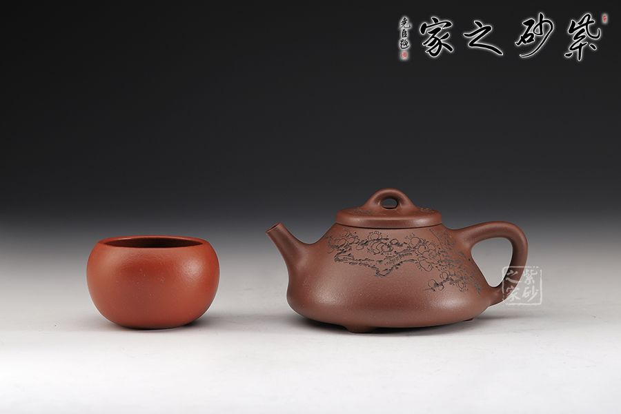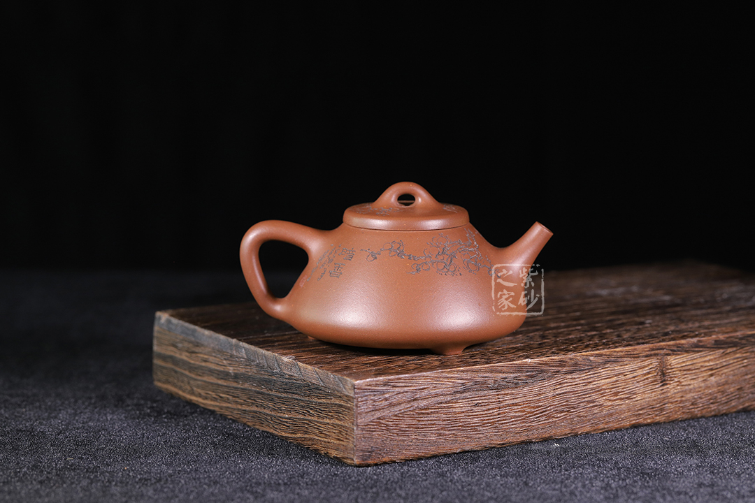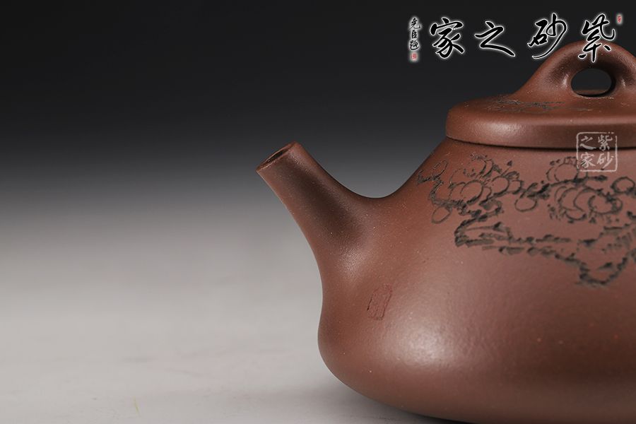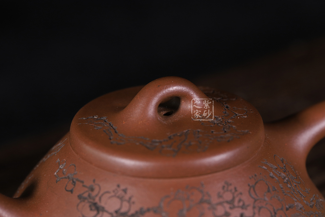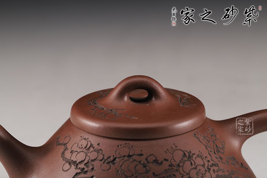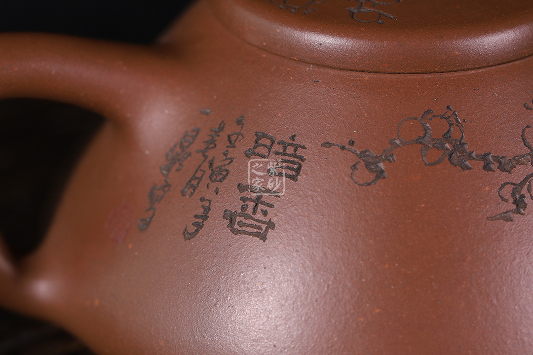 整體造型簡約大方,壺身呈金字塔形,壓蓋之上以橋鈕裝飾,直流簡而有力,出水順暢,壺把呈倒三角勢,與壺身之型互補(bǔ)。壺身雙面陶刻,梅花朵朵盛開。整器工藝精巧,成色潤澤,易于泡養(yǎng),180cc黃金容量,是一把非常實(shí)用的殺茶利器。