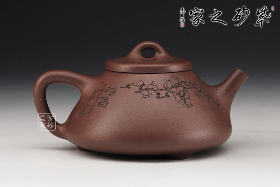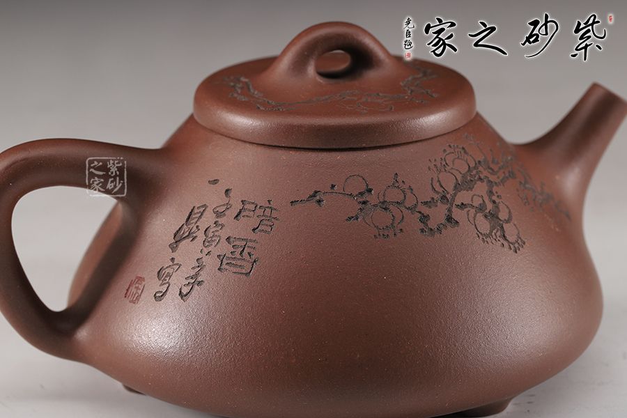 此壺取經(jīng)典子冶石瓢之型,采用文革紫泥精制而成,泥色明潤高雅。