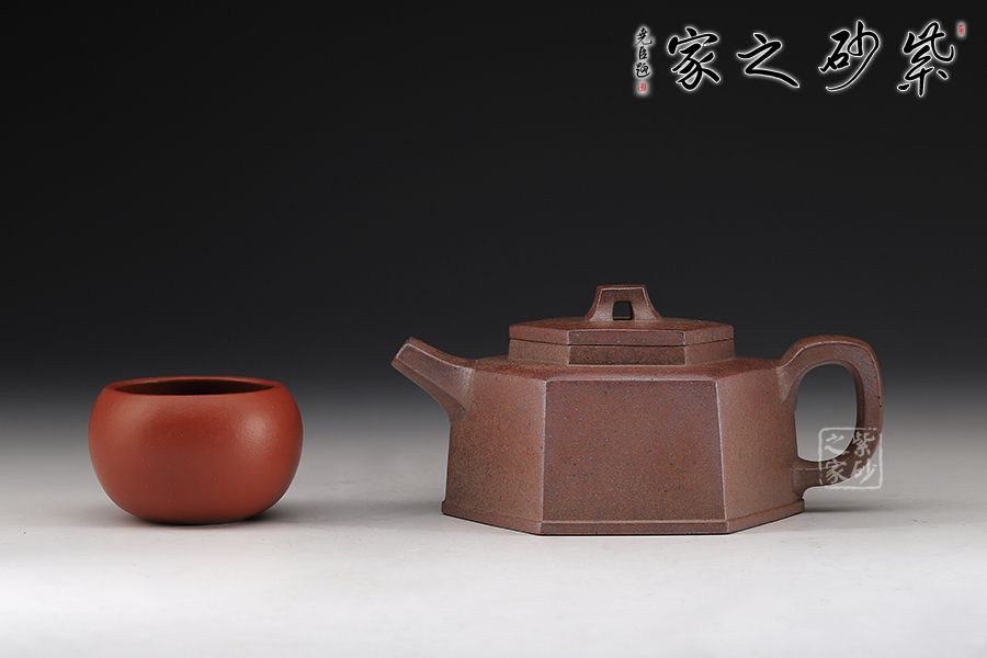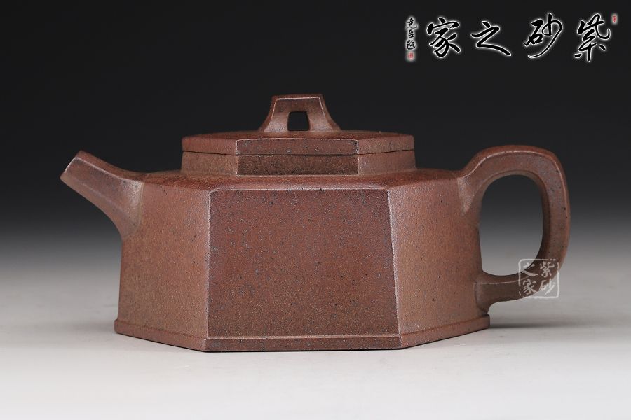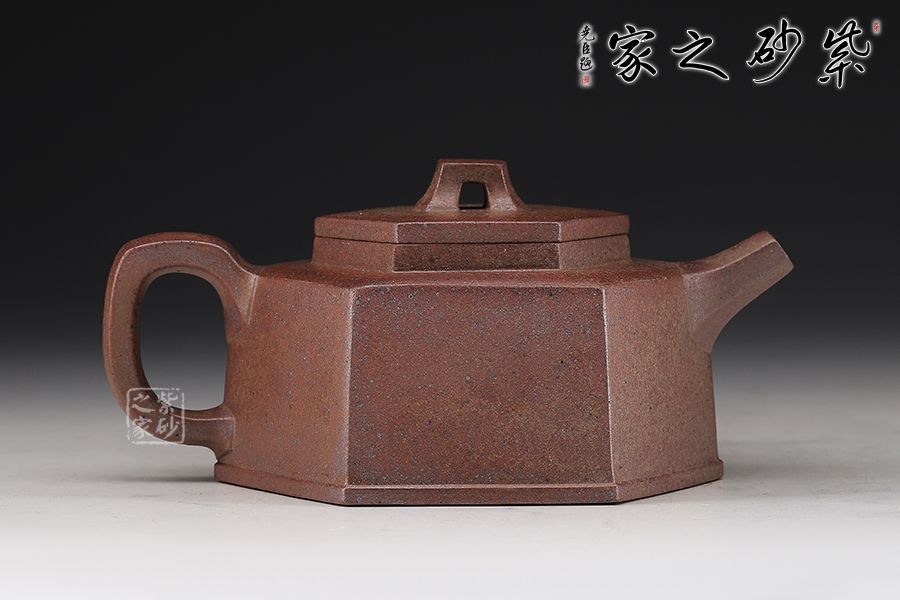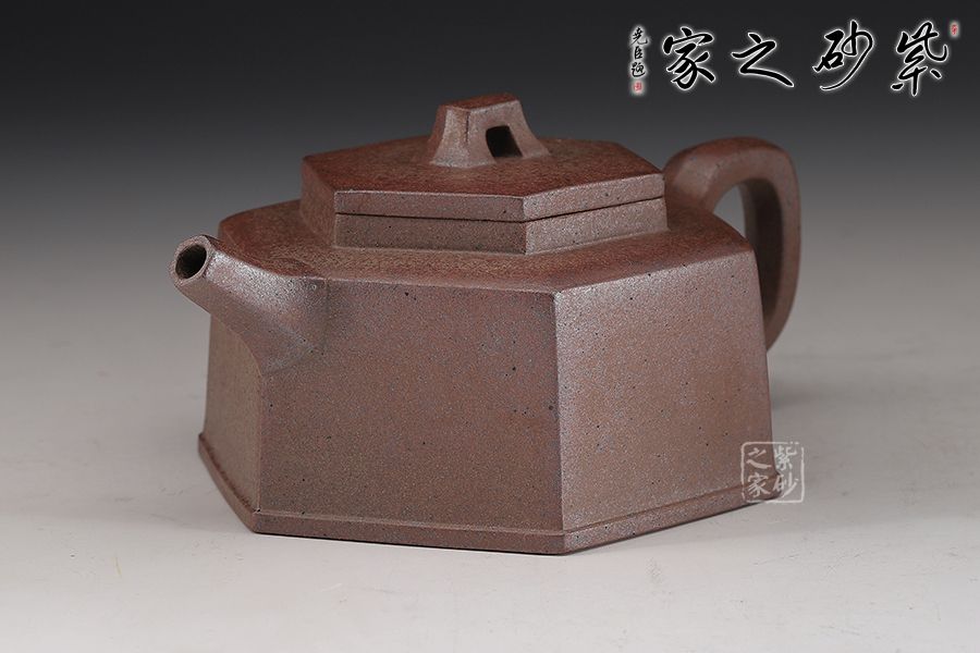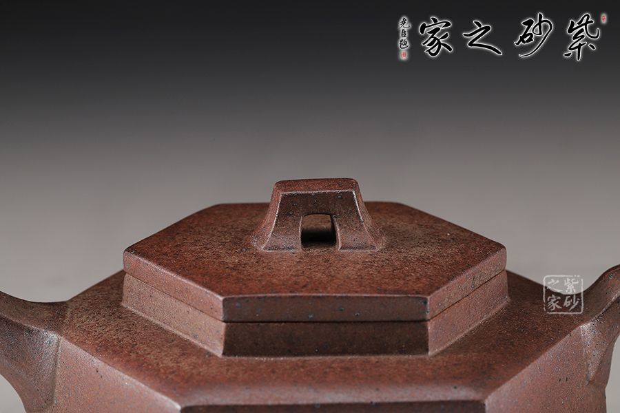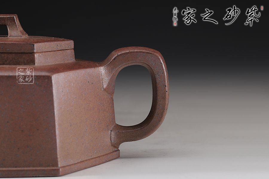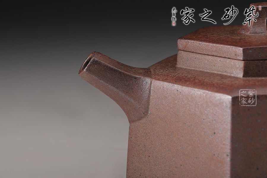 六方井欄,壺身呈六方,一方頂十圓,難度極高。壺身、流、把、蓋皆是六方,線面挺括,棱角分明,鑲接壺身如城墻般鐵骨錚錚,牢不可破。 橋鈕扁弧飽滿,鈕孔工整,大度規(guī)整,做工精致。壺肩平整,壺身六個(gè)塊四方面鑲接而成,均勻細(xì)致,比例恰到好處。 整個(gè)壺嘴如一方斜塔,渾厚有力;壺把一副鋼筋鐵鋼的硬朗之風(fēng),錚然作響。整個(gè)壺渾然一體,更覺堅(jiān)固。