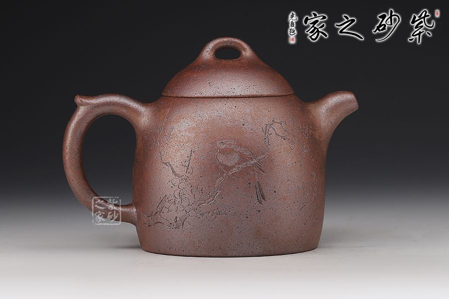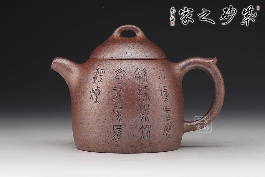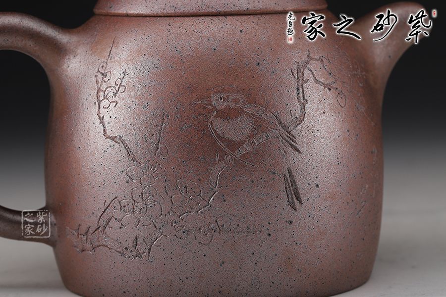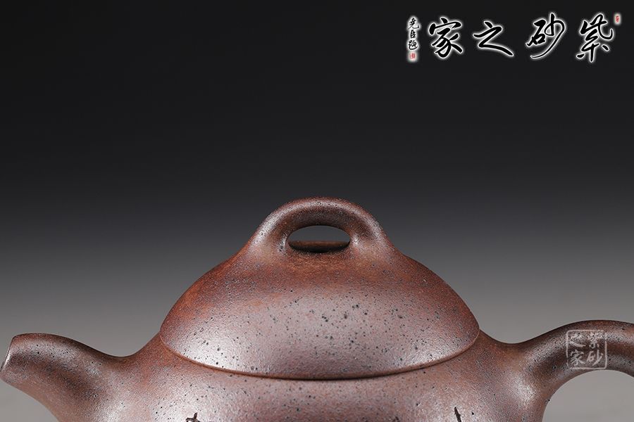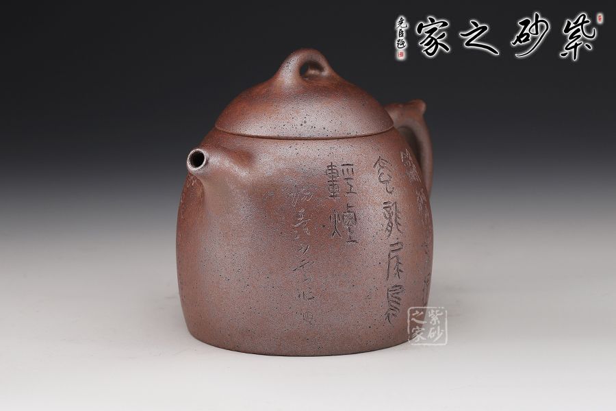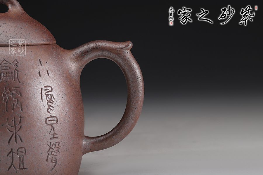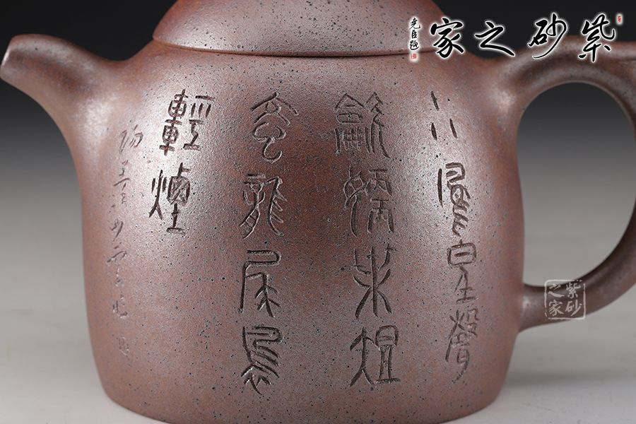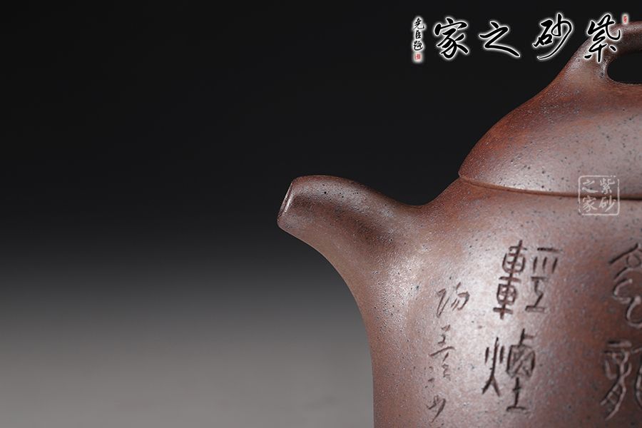 秦權(quán)壺,此款壺仿秤砣形制,壺身高聳由下至上收斂,自然流暢;流短有勁,環(huán)耳形把手,不矯不揚(yáng);截蓋微鼓,亦另為截蓋制,沿與蓋品渾然一體;鈕似橋頂,壺形整體簡練、古樸、大方;陶刻裝飾,文人壺氣息十足。