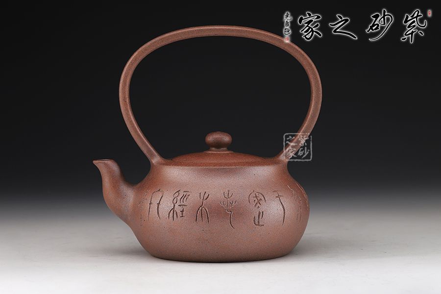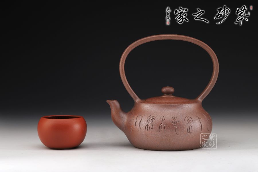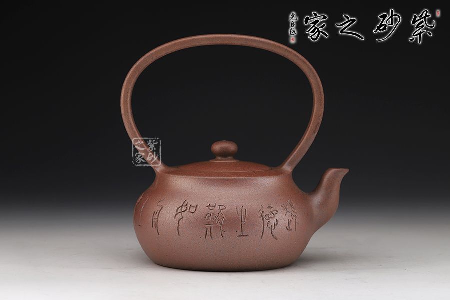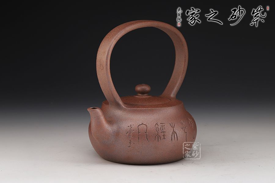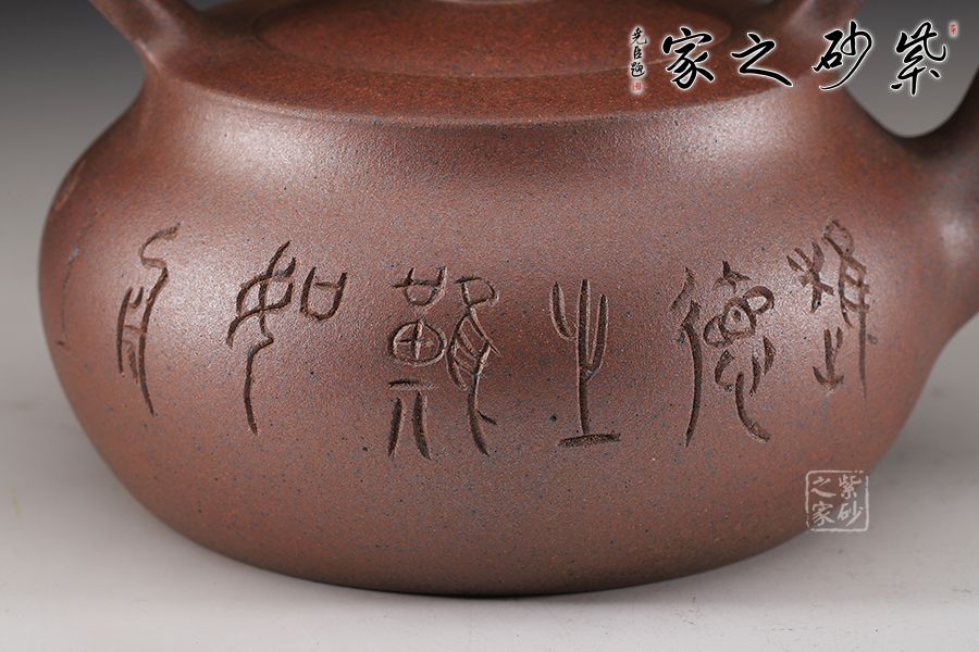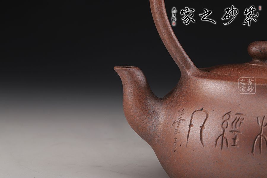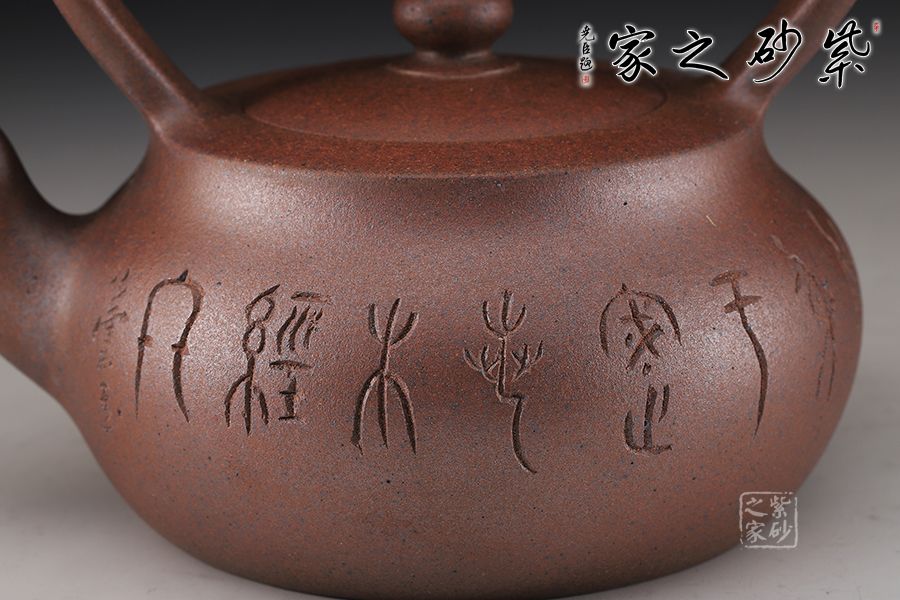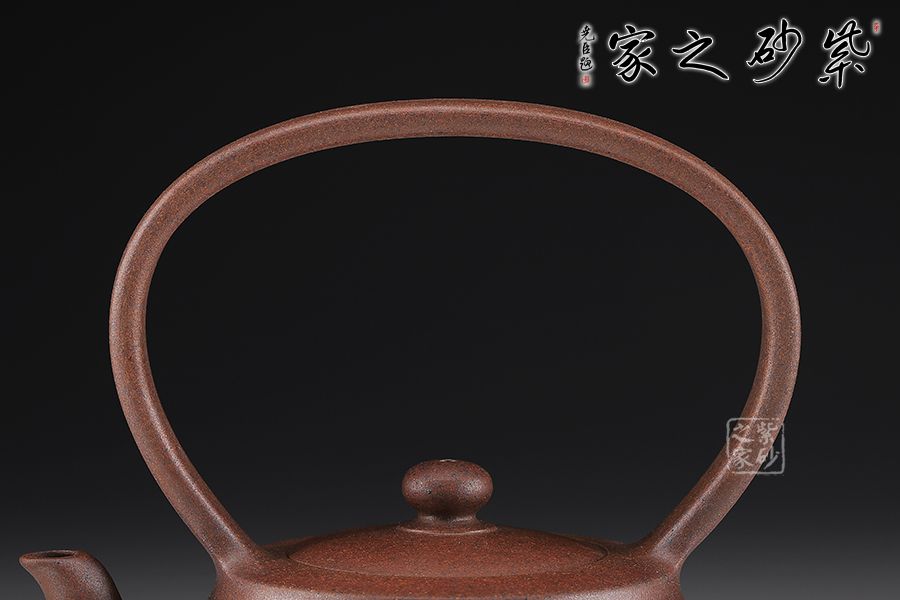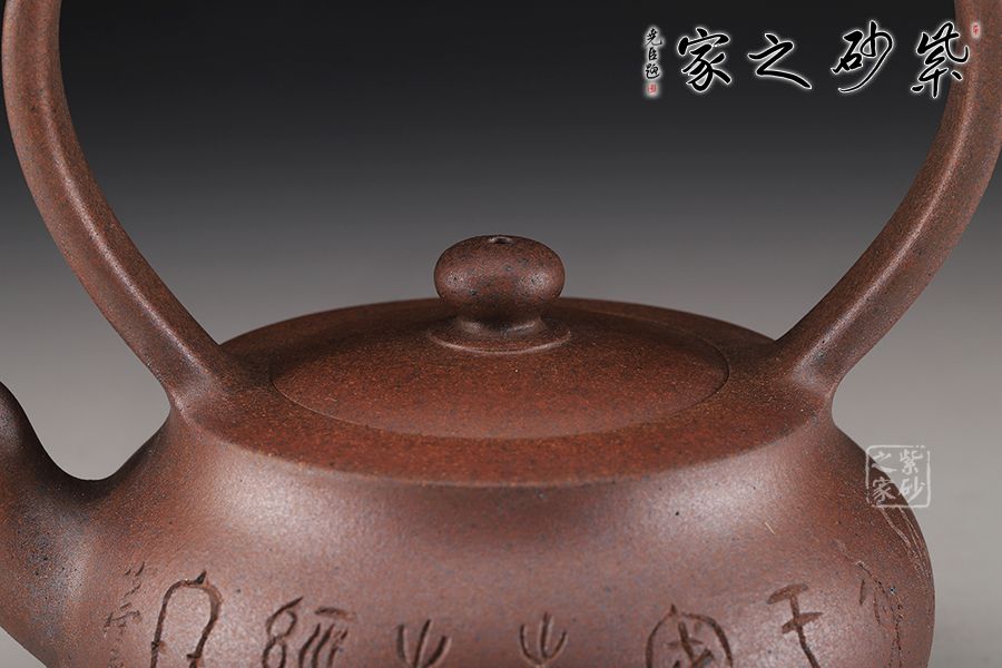 壺身扁圓似鼓,上部內(nèi)收,嵌蓋、扁圓鈕與短彎流相呼應(yīng)。提梁順壺身肩部向上漸開,頂部與壺底勻稱輝映,結(jié)構(gòu)嚴謹。超高的提梁和均扁的壺身完美協(xié)調(diào),虛實處理得恰到好處,值得珍藏。
