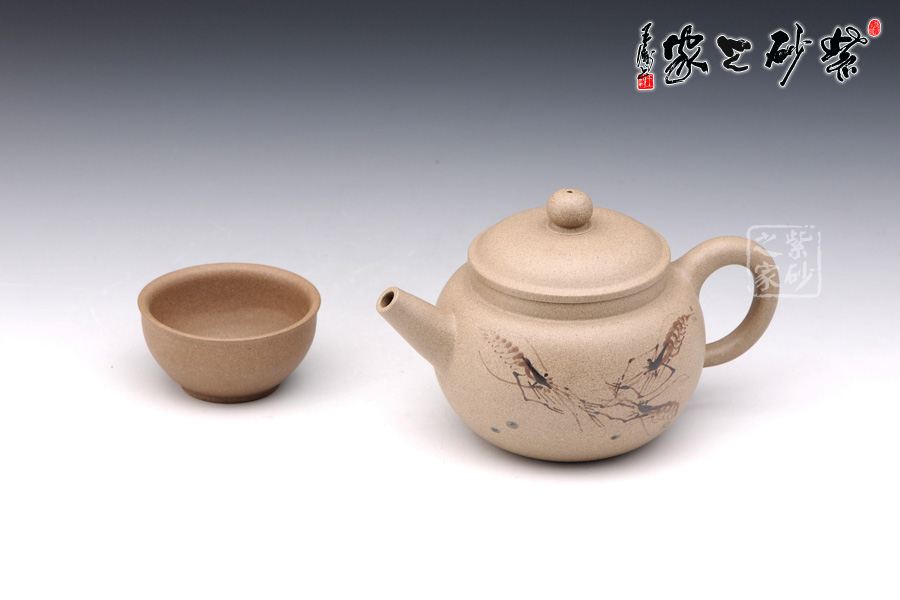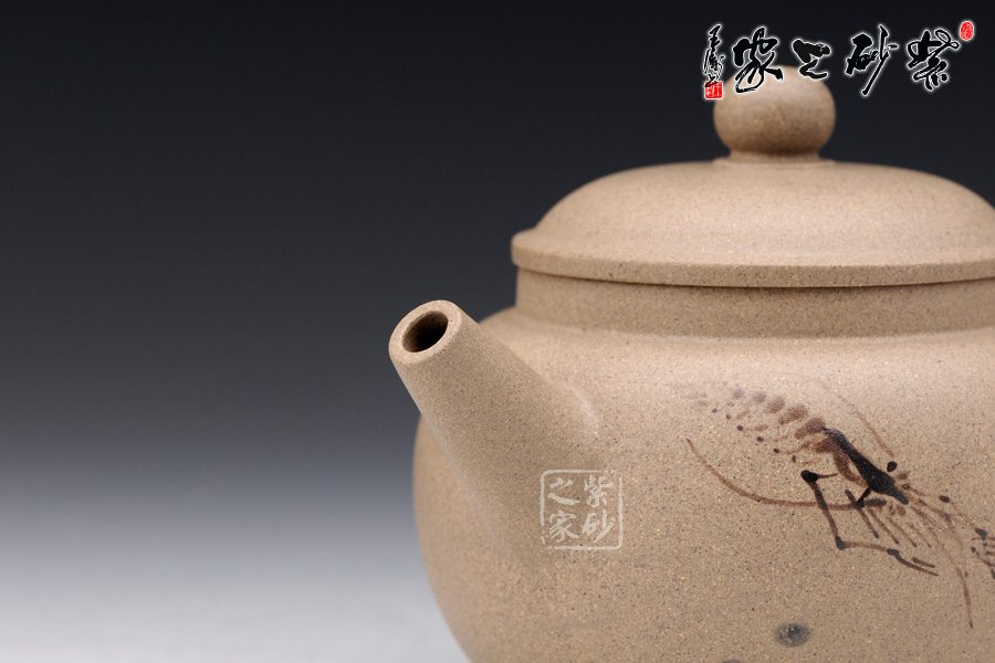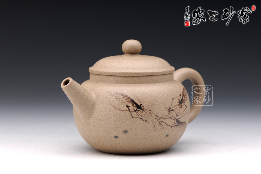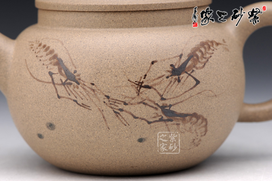 A面: 裝飾: 蝦趣圖 裝飾者:苗春洪 裝飾內(nèi)容: 壺身采用的是特別的墨繪工藝裝飾,壺身正反兩面分別繪有幾只河蝦,所繪的蝦極為神似,活靈活現(xiàn),仿佛能夠跳動(dòng),濺出水花