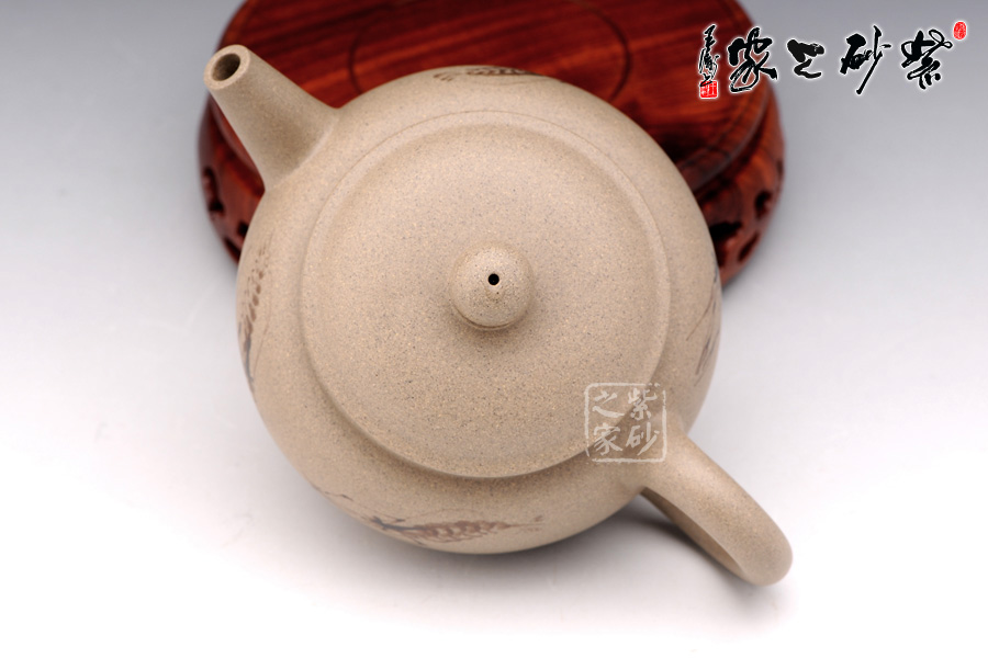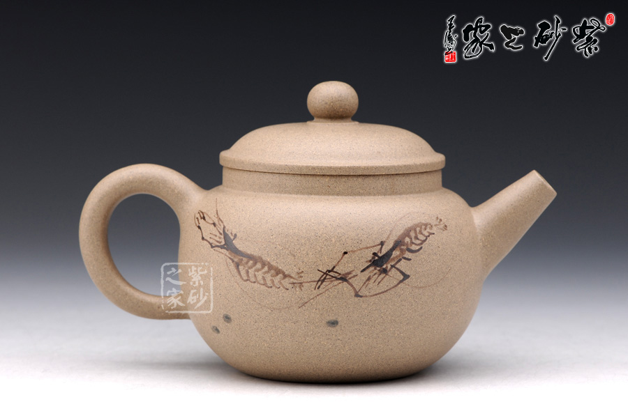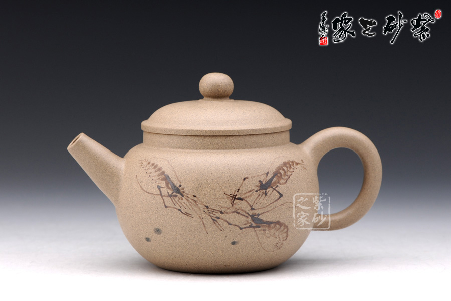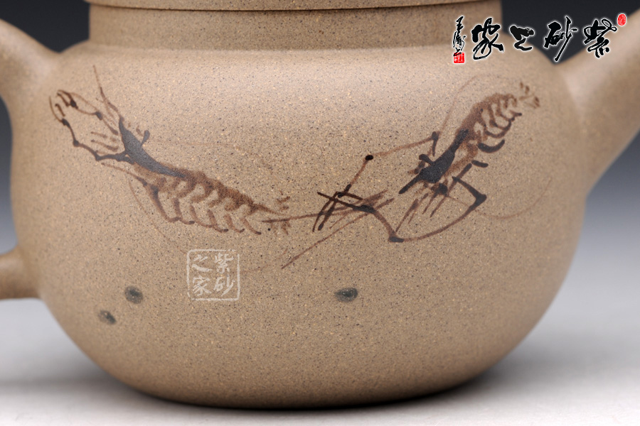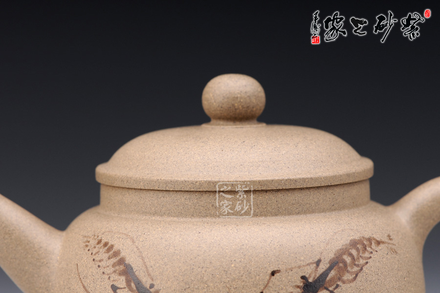 此壺通身飽滿圓和,線條簡(jiǎn)潔,又不失雅致,壺蓋微微隆起,形如帽子,壺鈕珠圓,與壺身相呼應(yīng),壺把、壺嘴與壺口三點(diǎn)成線,平衡感強(qiáng),器形優(yōu)美雅致, 頗得古代文人之精神韻味,作品做工精美絕倫,造型獨(dú)特,清新優(yōu)雅,氣韻生動(dòng);壺身采用的是特別的泥繪裝飾工藝,壺身正反兩面分別繪有幾只河蝦,所繪的蝦極為神似,活靈活現(xiàn),仿佛能夠跳動(dòng),濺出水花。