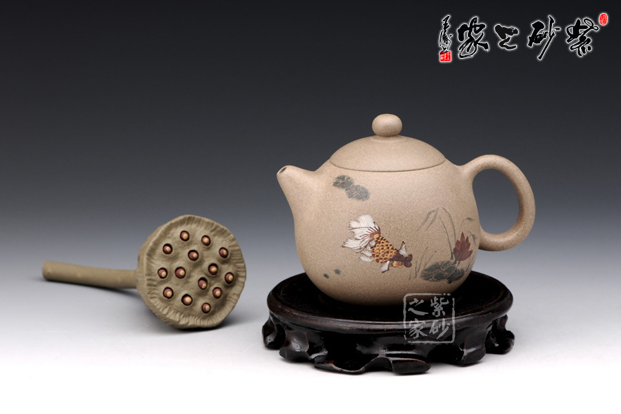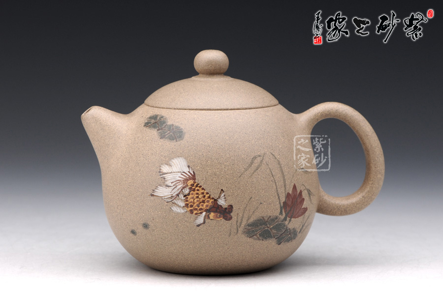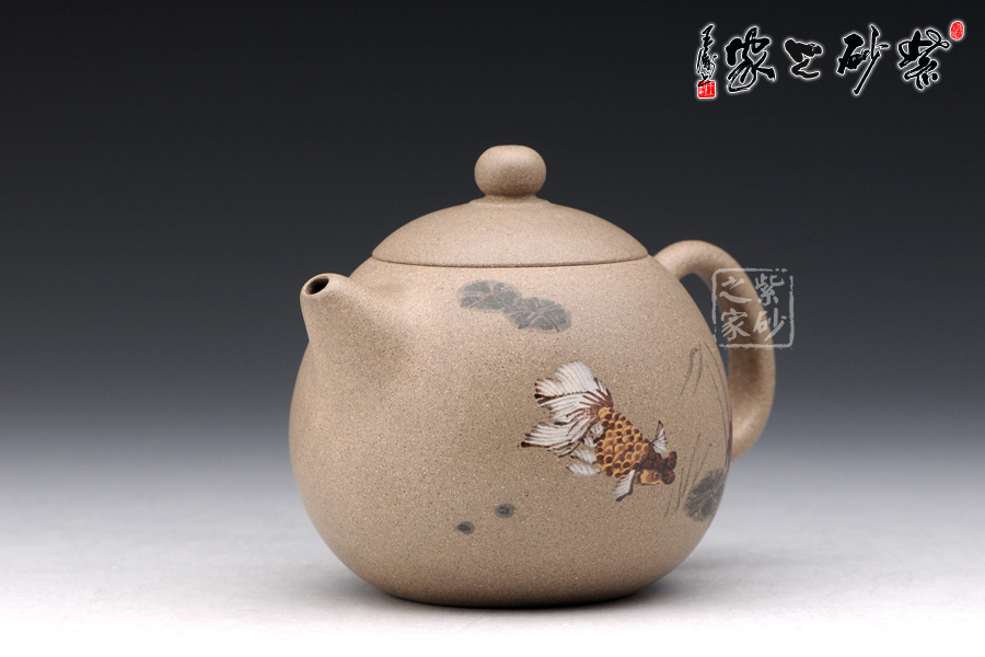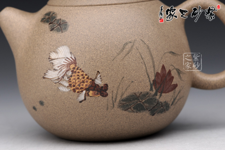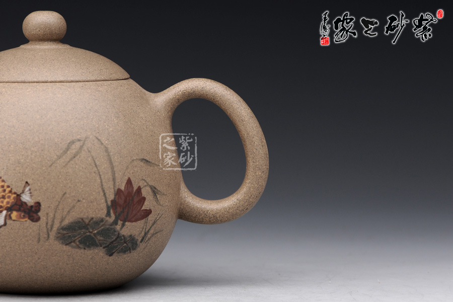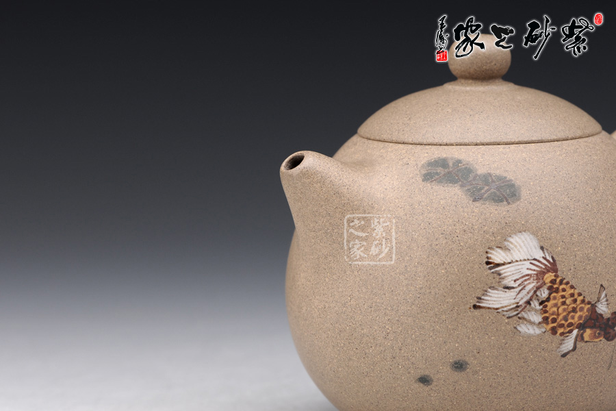 A面: 裝飾: 泥繪 裝飾者:苗春洪 裝飾內(nèi)容: 壺身彩繪魚游淺底的畫面自由而悠閑,令人羨慕,如此優(yōu)美的器型與完美的畫面結(jié)合于一體 ,可謂賞玩與收藏皆相宜