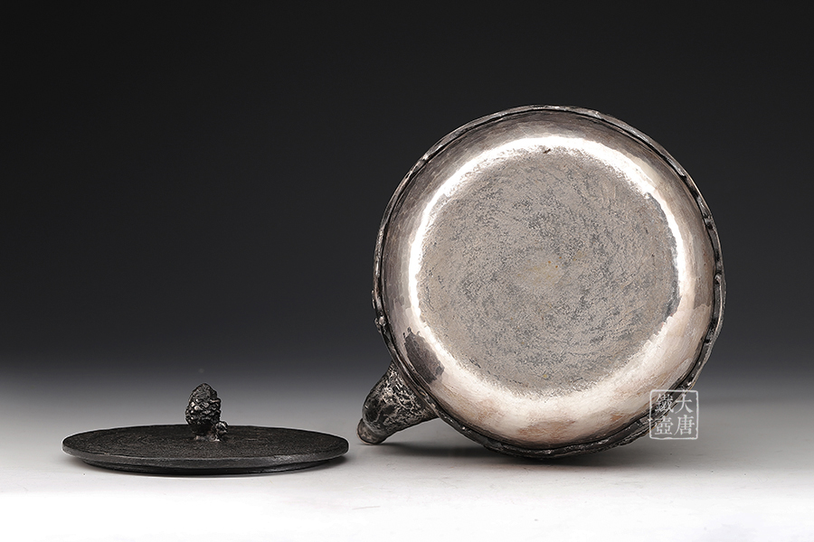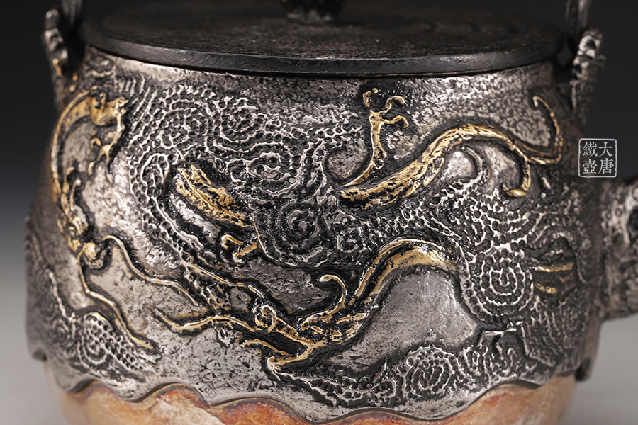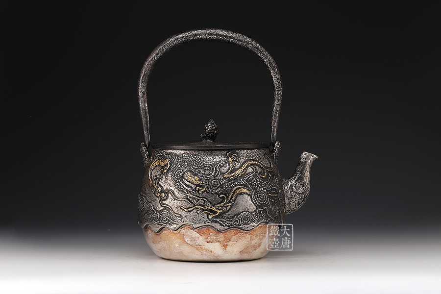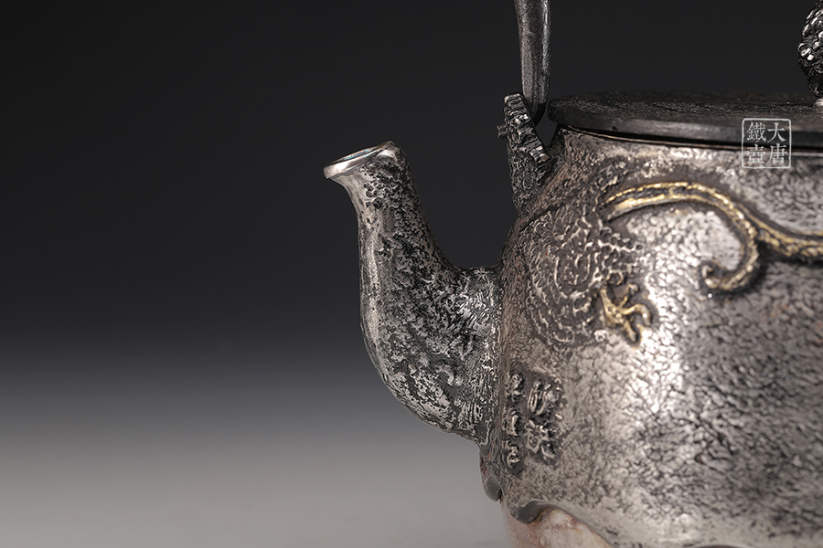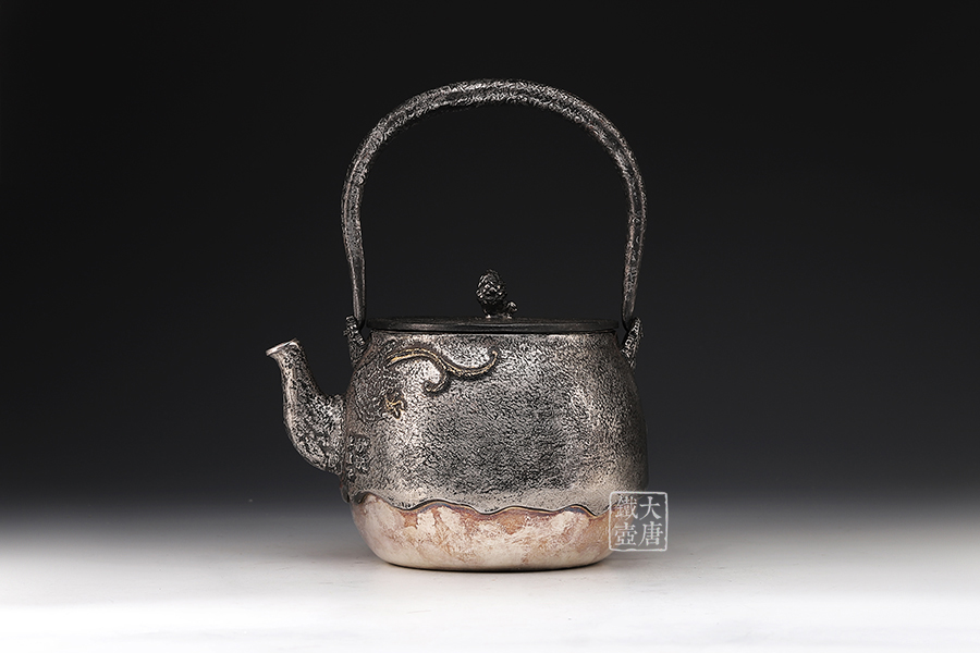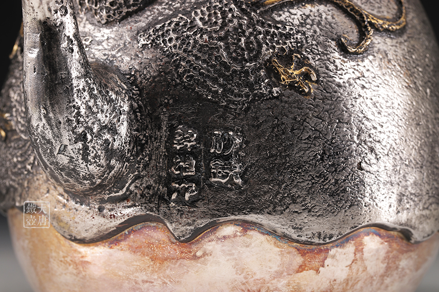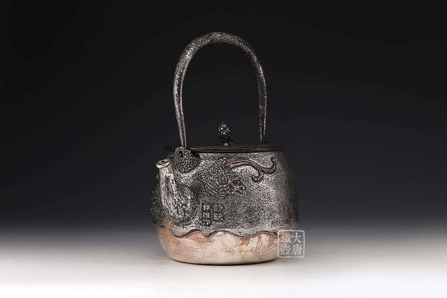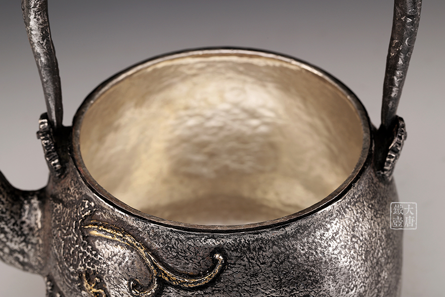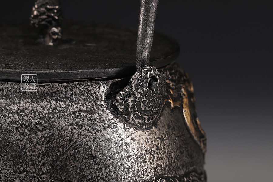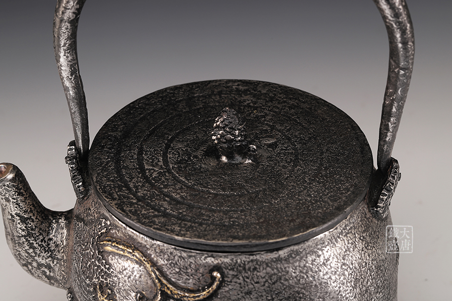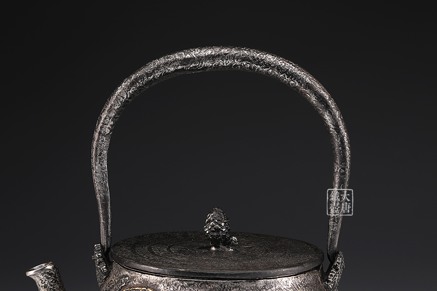 荒井工房的鐵瓶除了在鑄造工藝上有嚴格的規(guī)范和體系,在鐵瓶裝飾技術上也頗有建樹。除了傳統(tǒng)的印刻技術外,荒井工房還掌握了非常出色的金銀鑲嵌技藝,尤其以大片的鏨刻銀片最為出眾,這在山形當?shù)靥每谥歇殬湟粠谩?/p>
